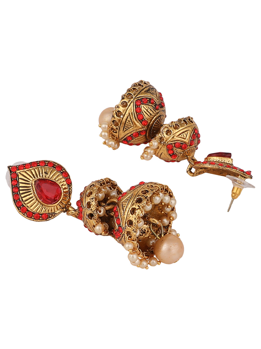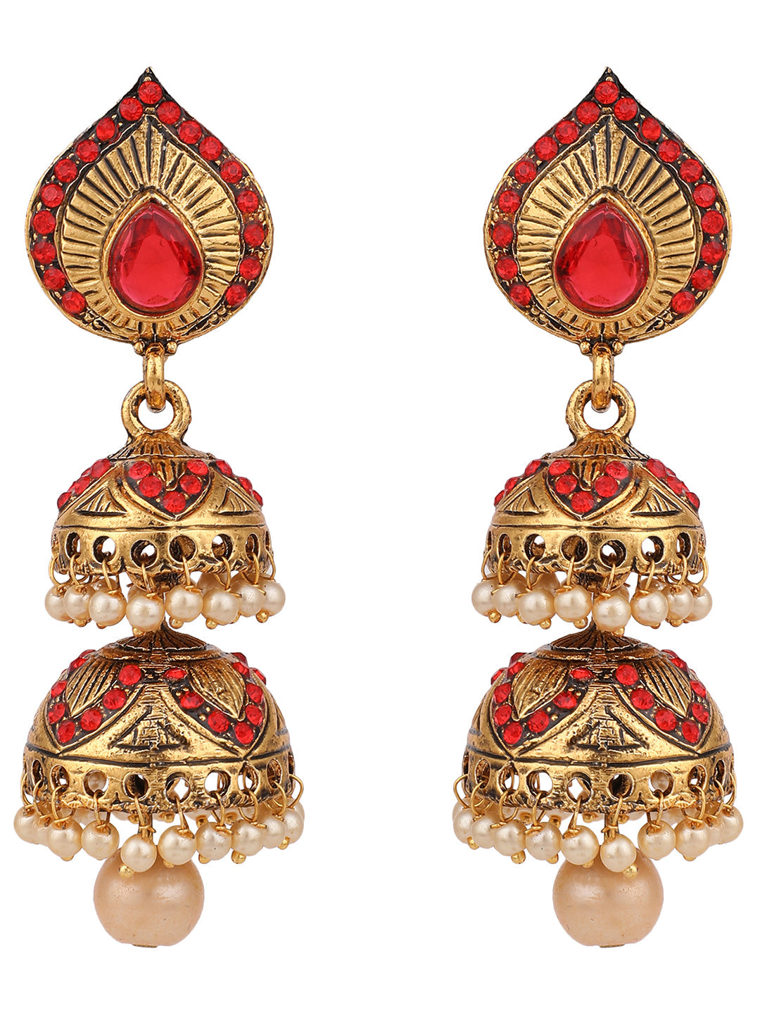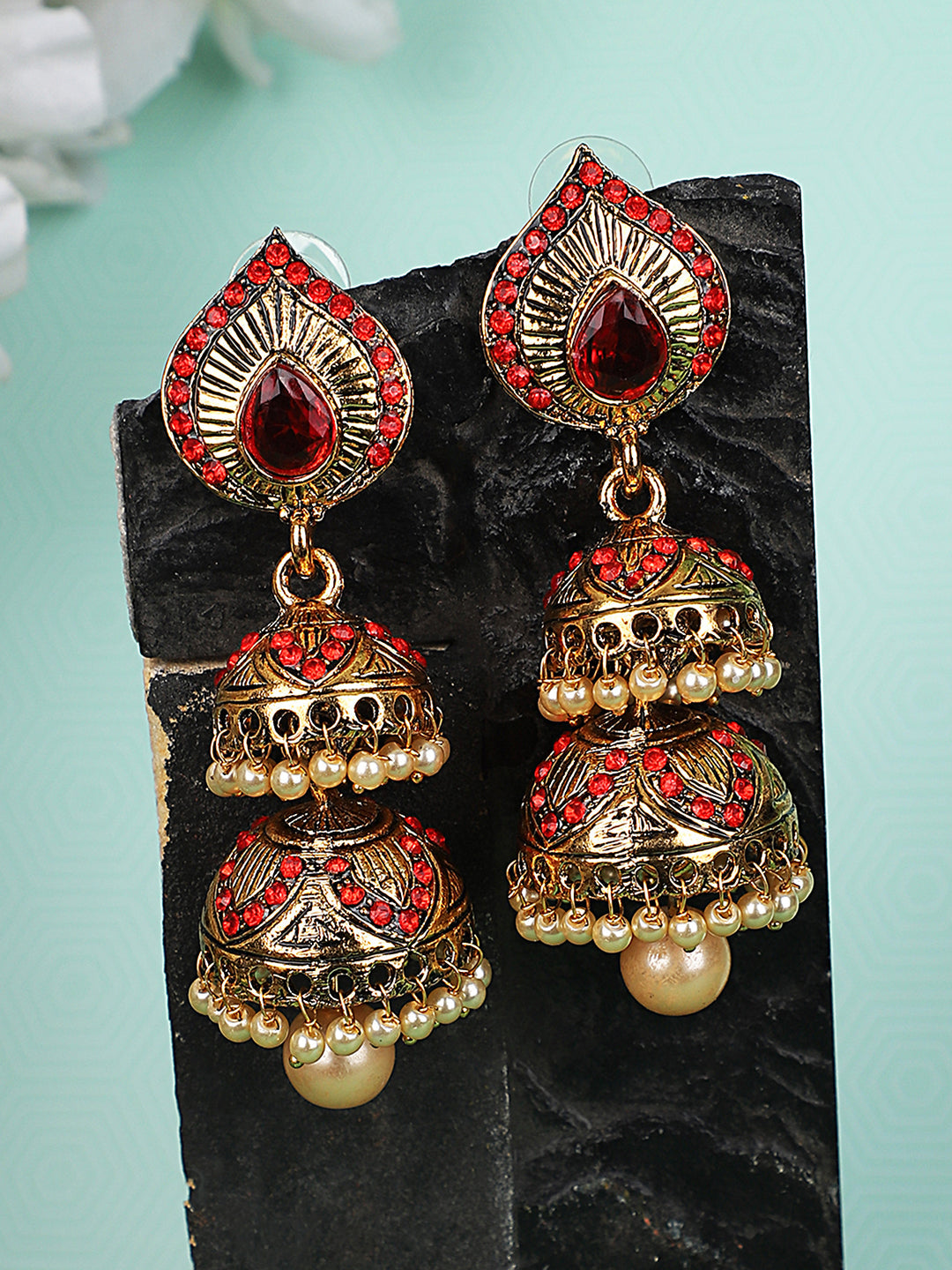 Red Stone Studded & Beaded 2 Floor Dome Shaped Jhumkas,Secured with post and back closure