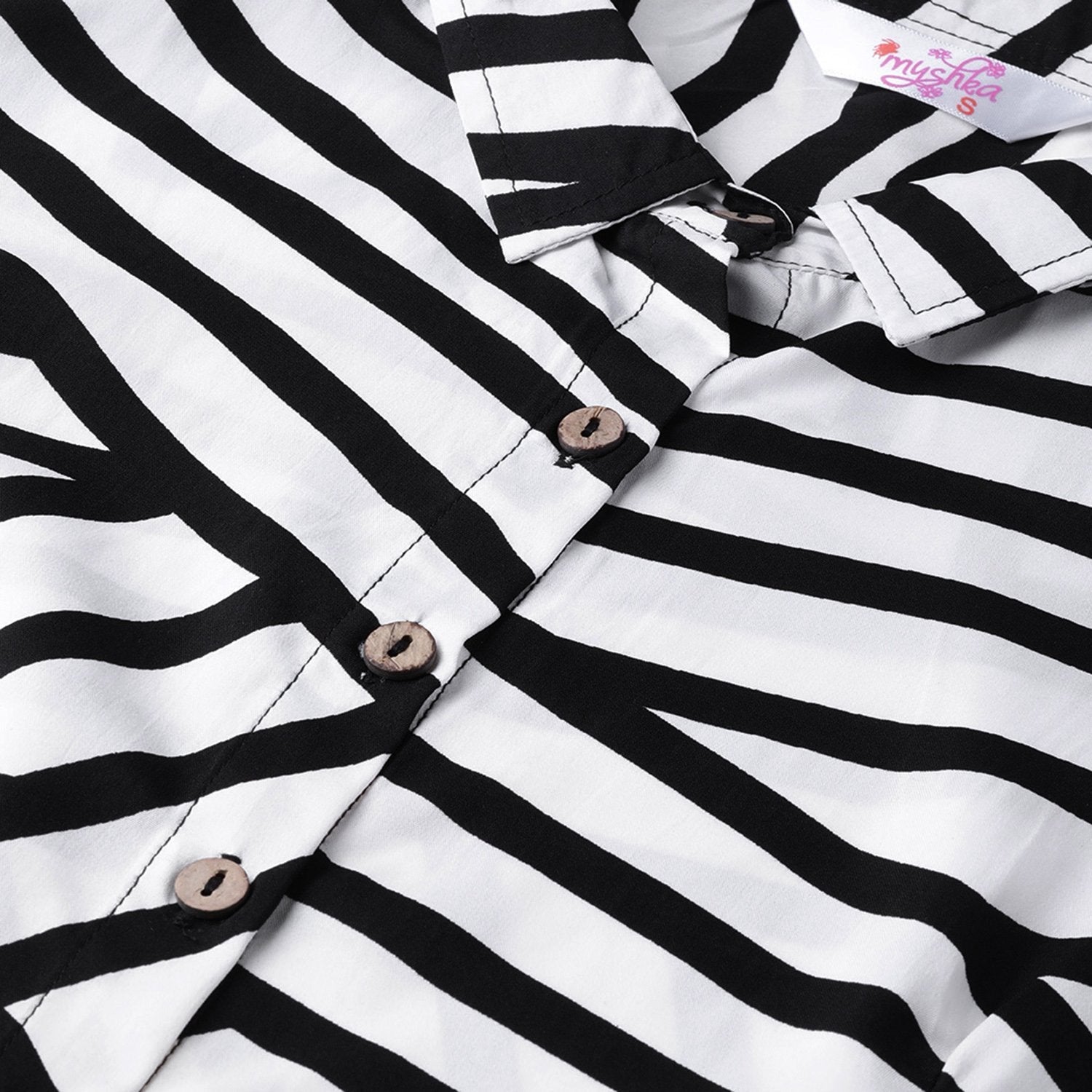 Trendia brings you this White dress for women by the brand Myshka. The white dress has a collared neck with button closure in the front. It is an A-Line dress with Slits on the sides and Zebra print all over. The white dress comes with a belt and pockets.The women's dress has full Sleeves. The dress for women is in polyster. Check out photos of the dress for a more detailed look.