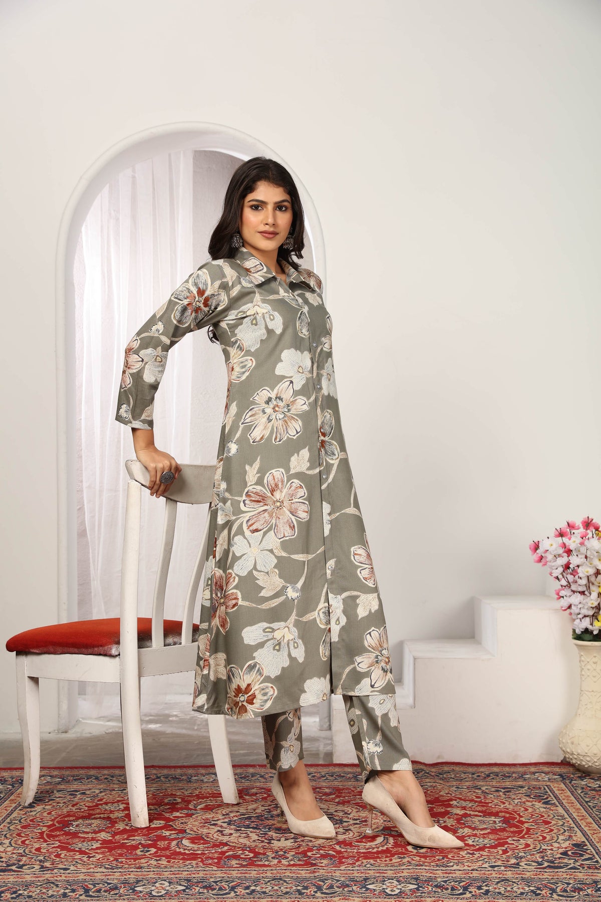 Women's Grey Chanderi Silk Floral Print With Side Pocket Kurtis & Sets