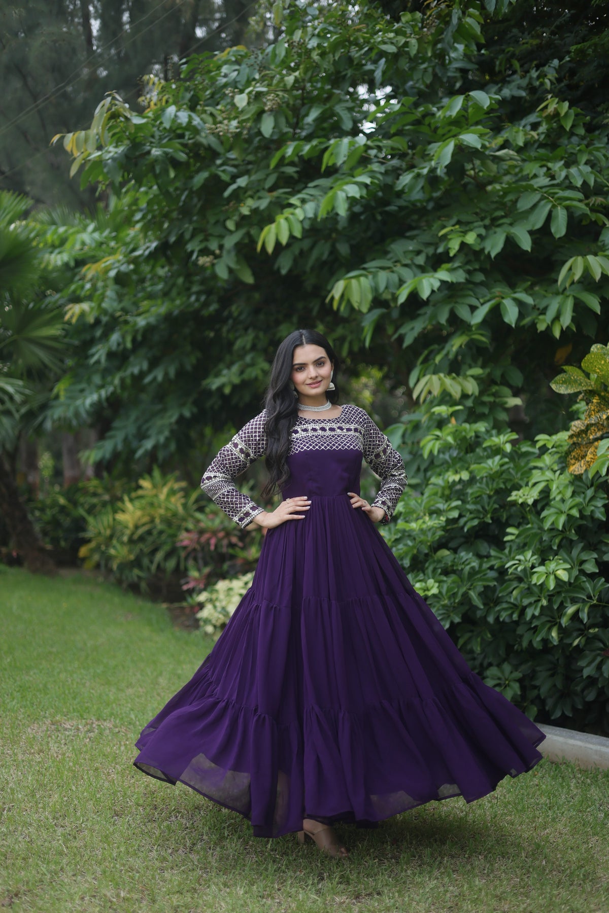 Women's Purple Sequins Zari Embroidered Faux Georgette Anarkali Dress