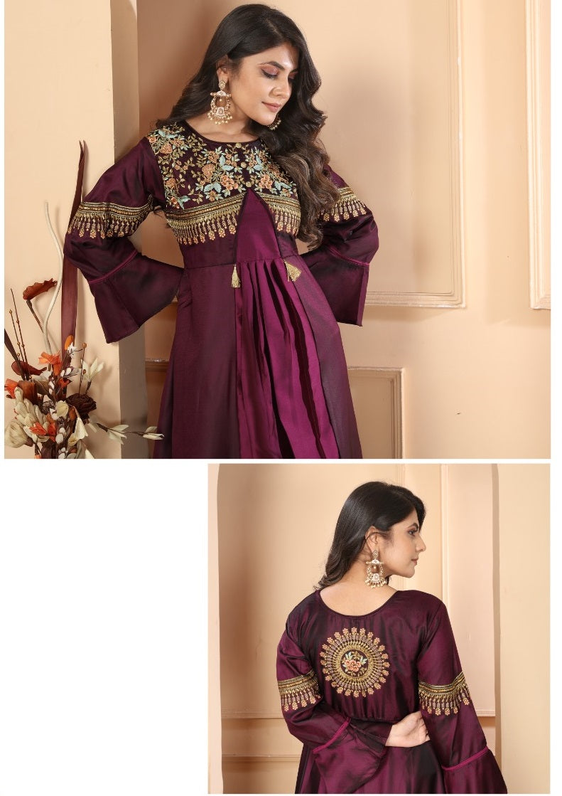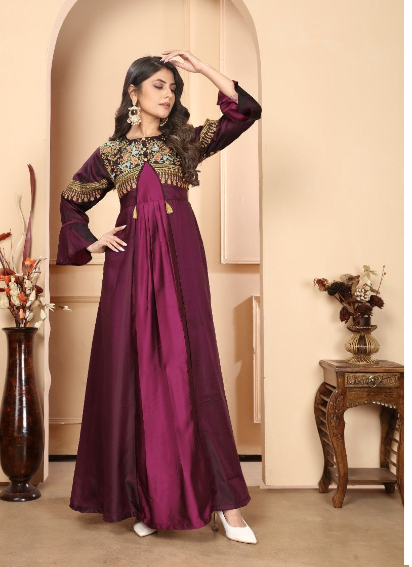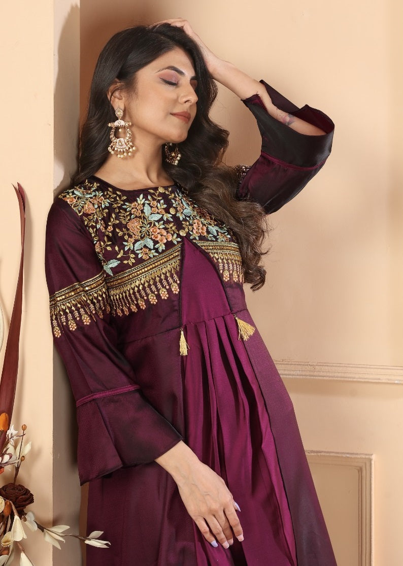 Women's Wine Triva Silk Heavy Embroidery Gown With Attached Inner
