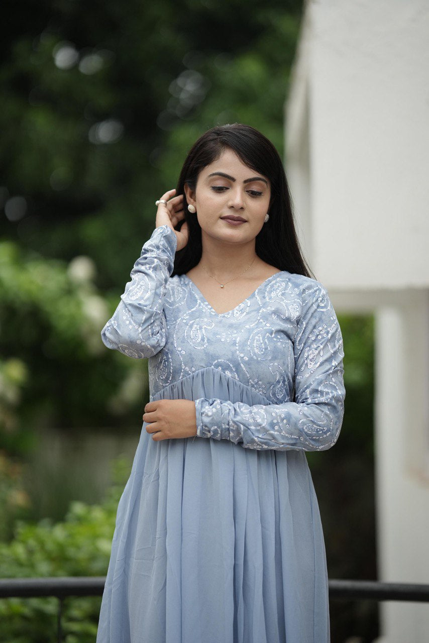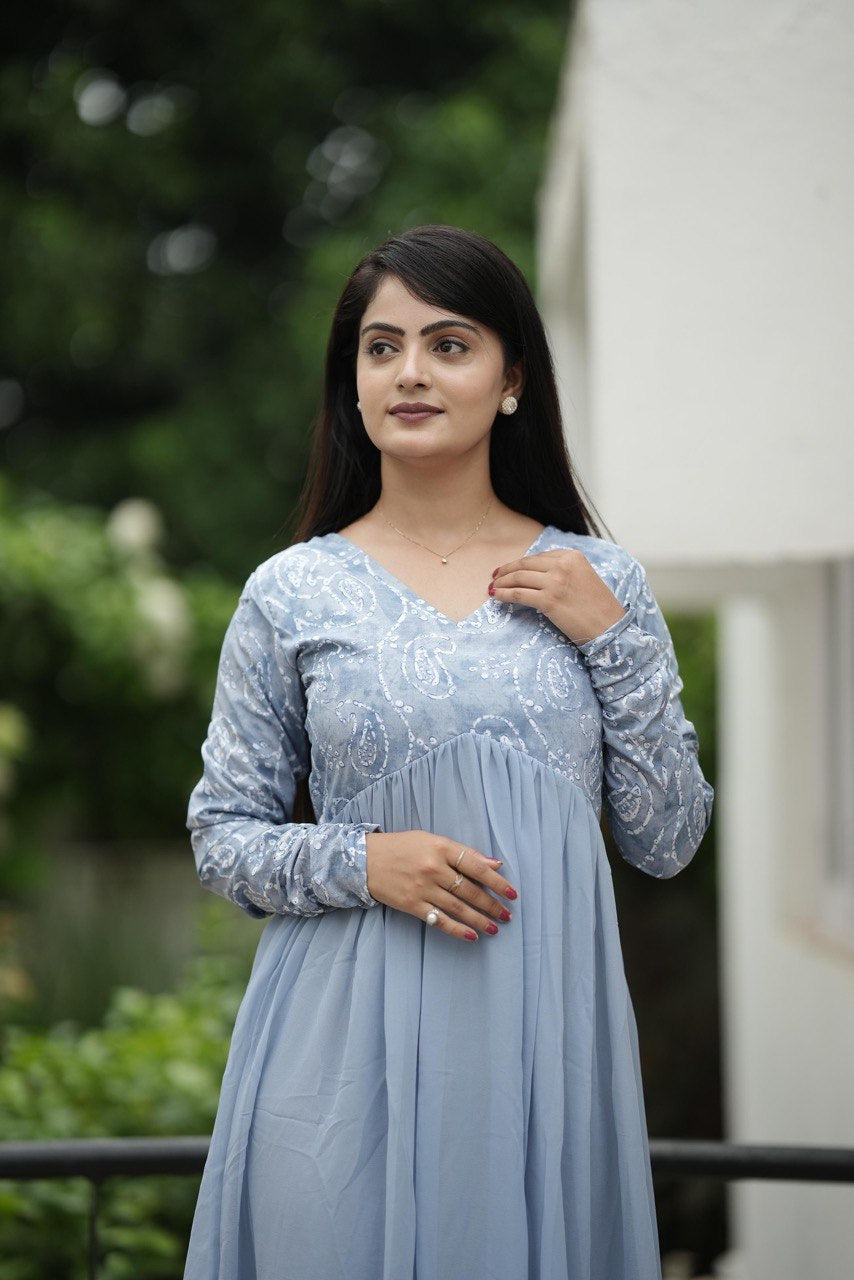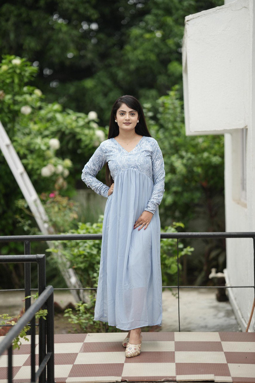 Women's Off Sky Crepe & Georgette Weaving Gown - Pr Fashion