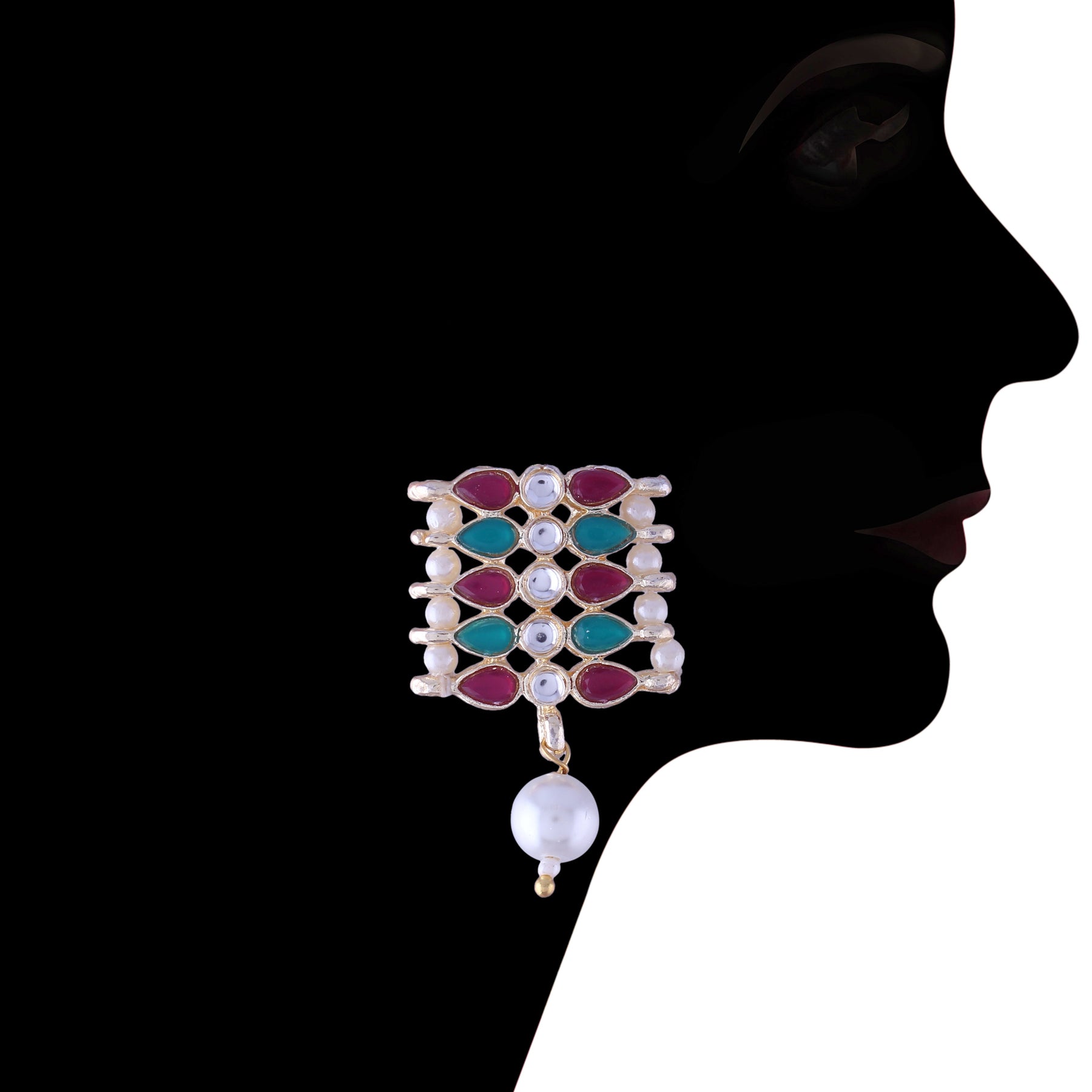 This Jewellery Set Is Crafted In 18K Gold Plated Traditional Light Weight Pearl Choker Set Glided With Kundan Work. The Necklace Feature Pearl & Kundan Work In It And Is Secured With A Drawstring Closures. Style This Necklace Set With A Saree Or A Salwar Suit To Enhance The Look.
