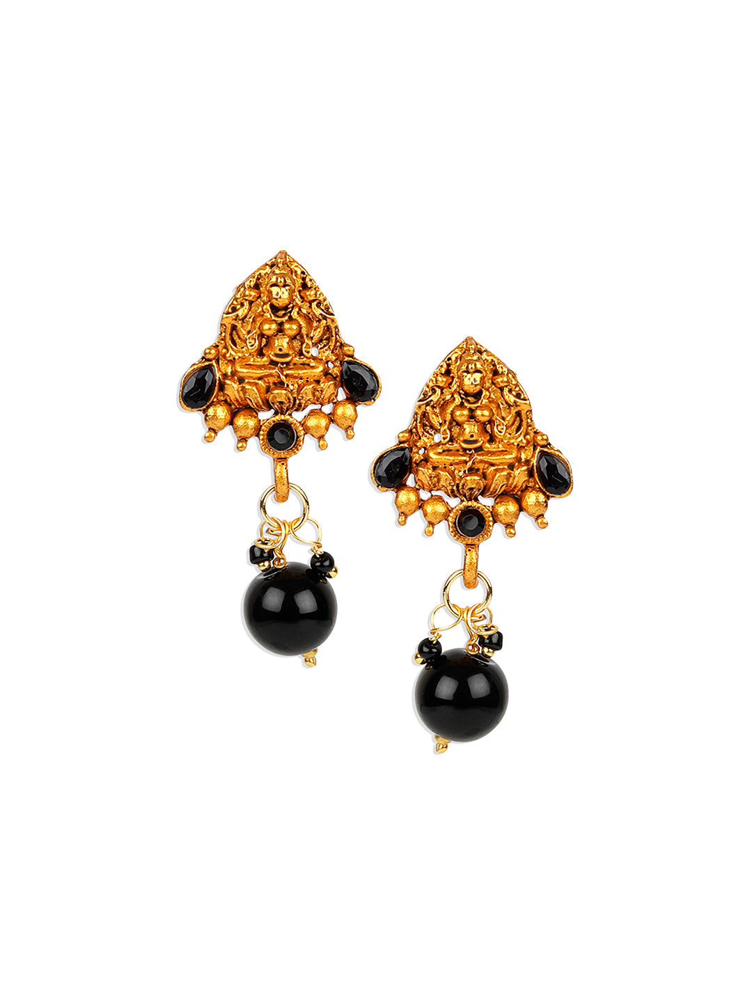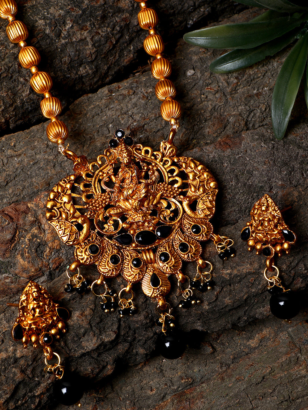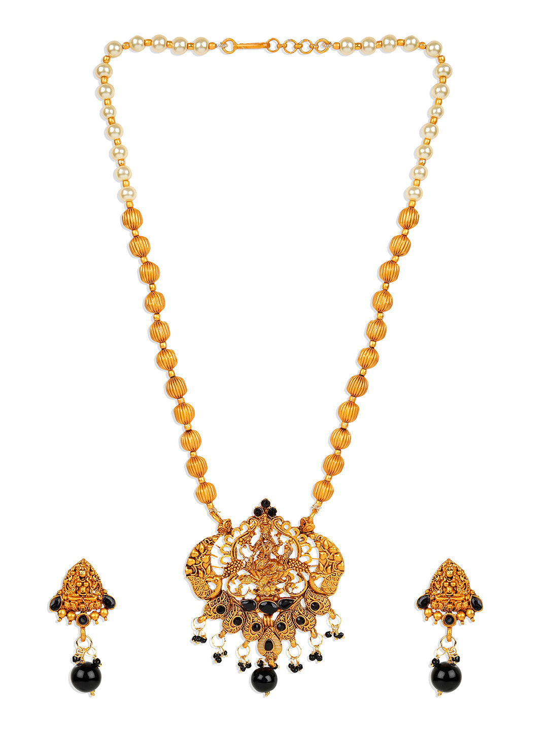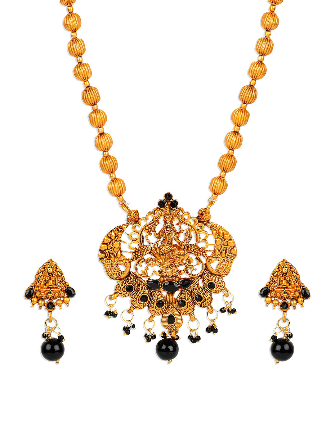 Women's Antique Matte Gold Finish Black Stone Studded Temple Jewellery set
