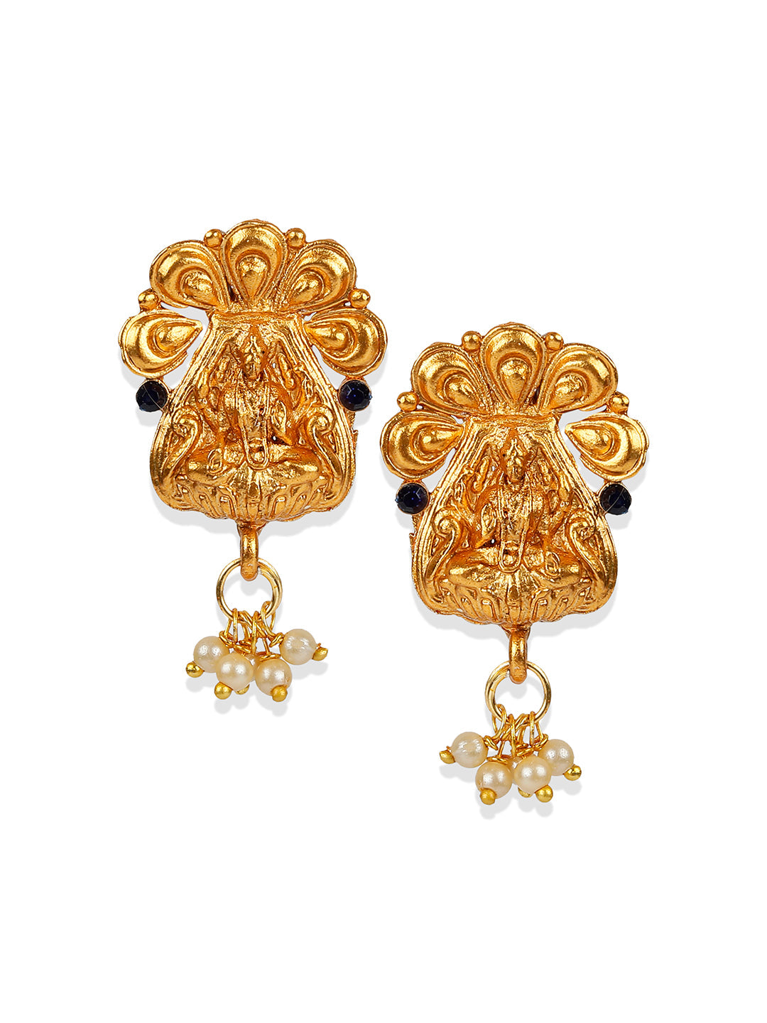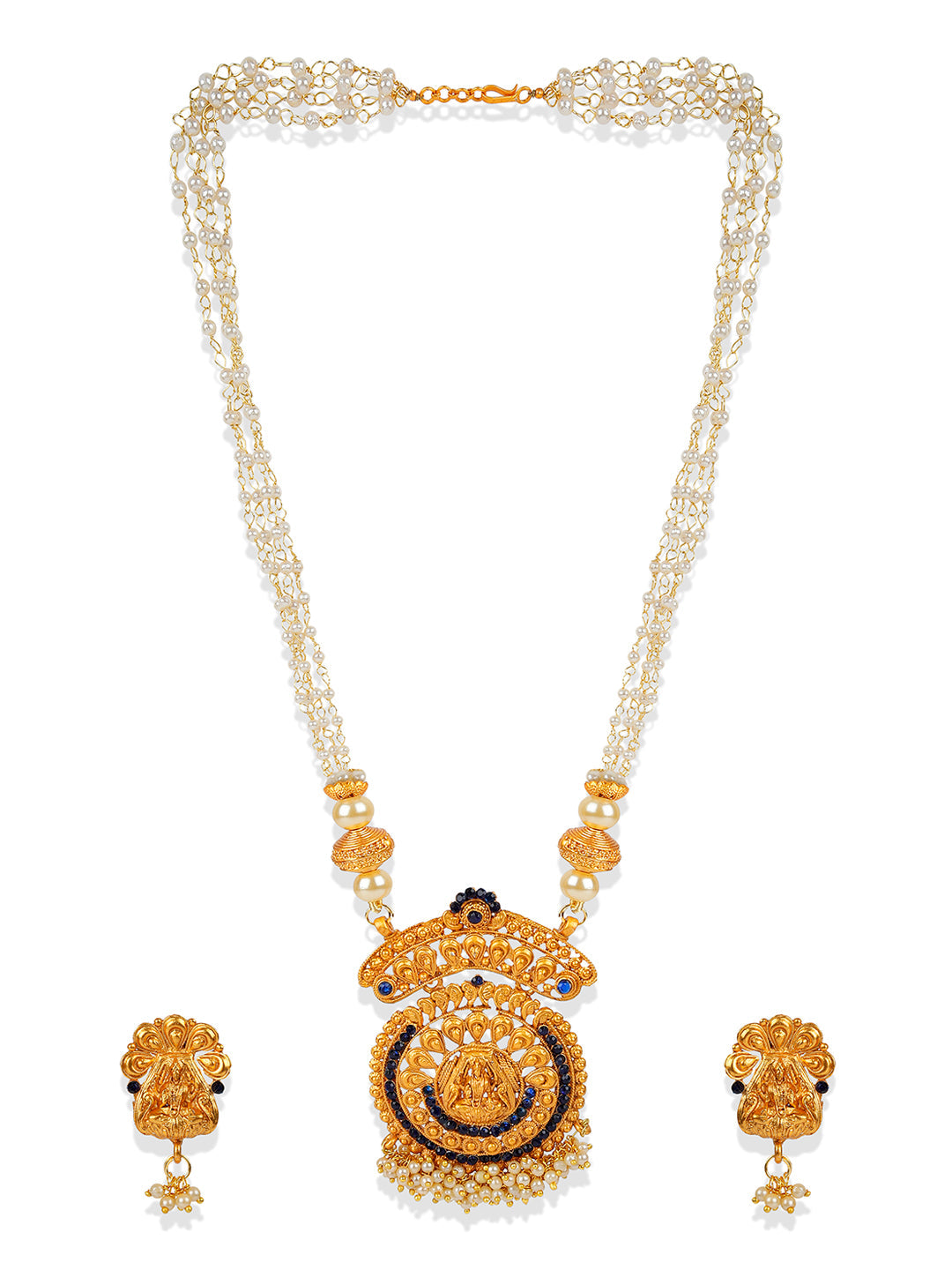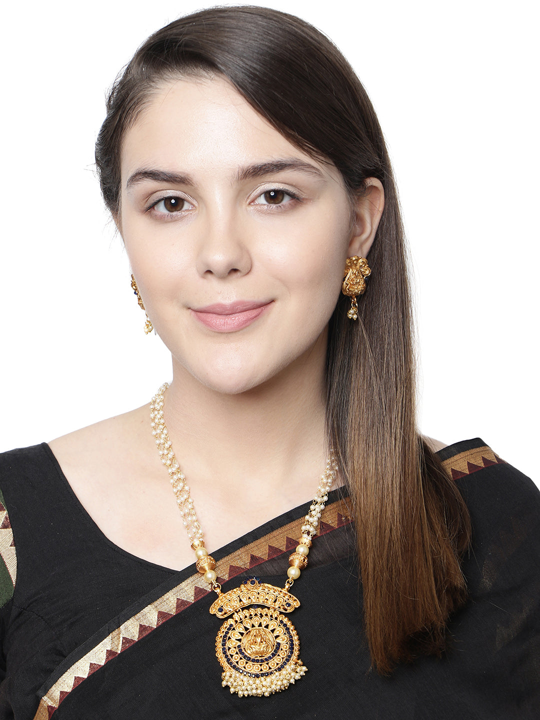 Women's Antique Matte Gold Finish Goddess Laxmi Blue Stone Studded Temple Jewellery set