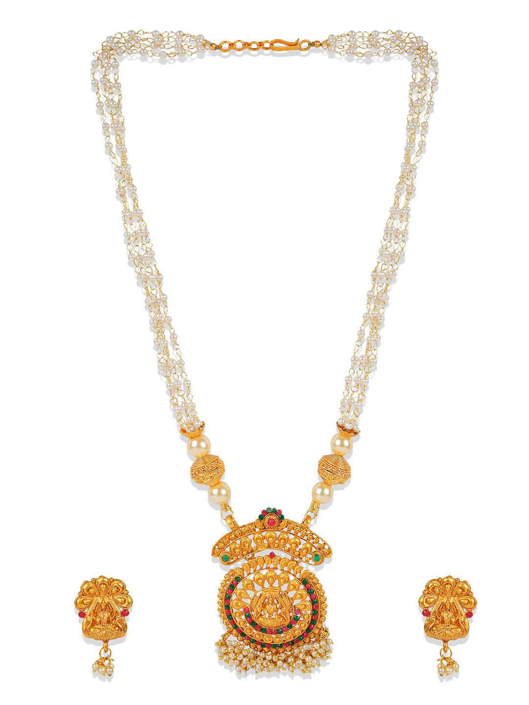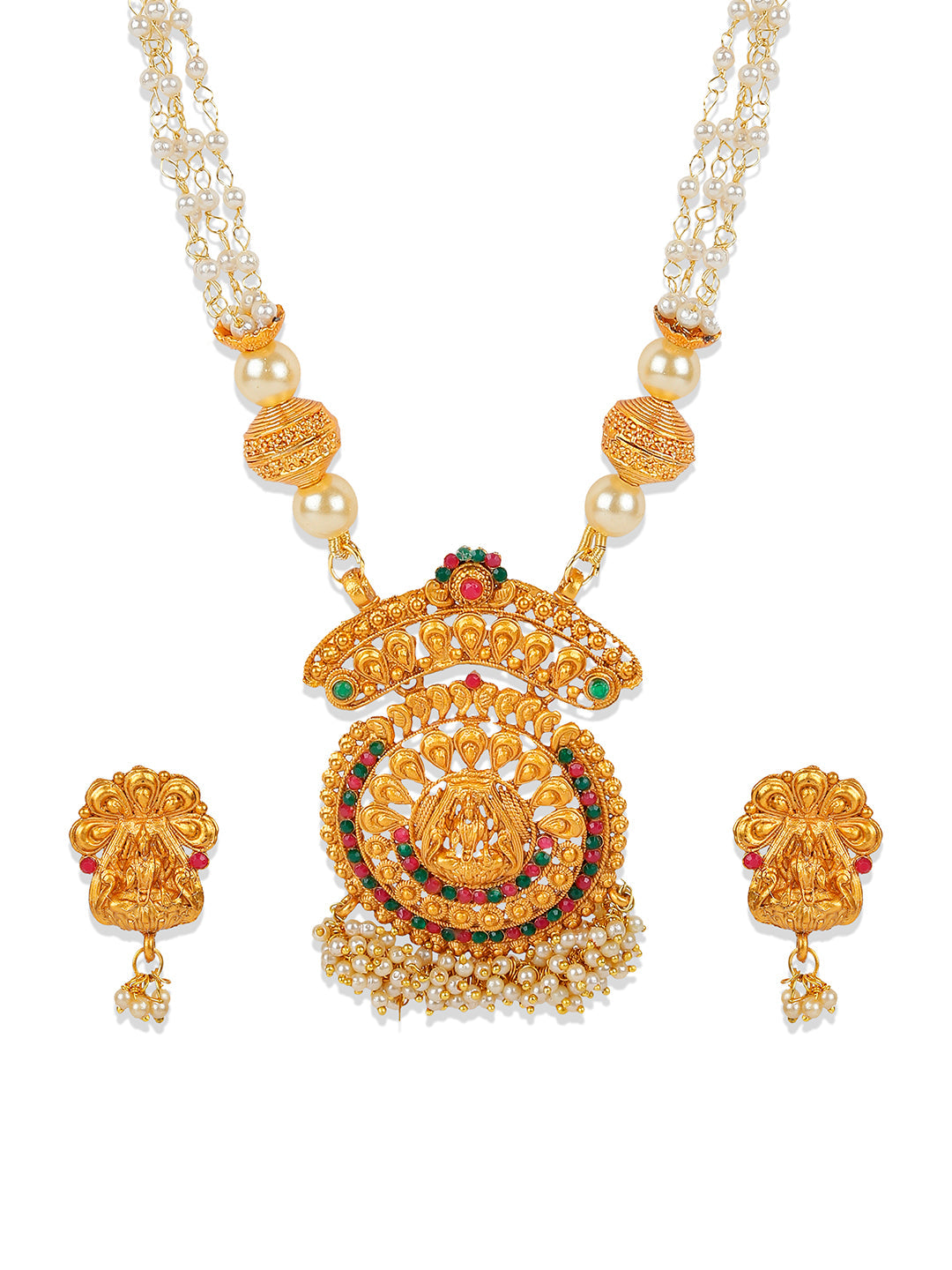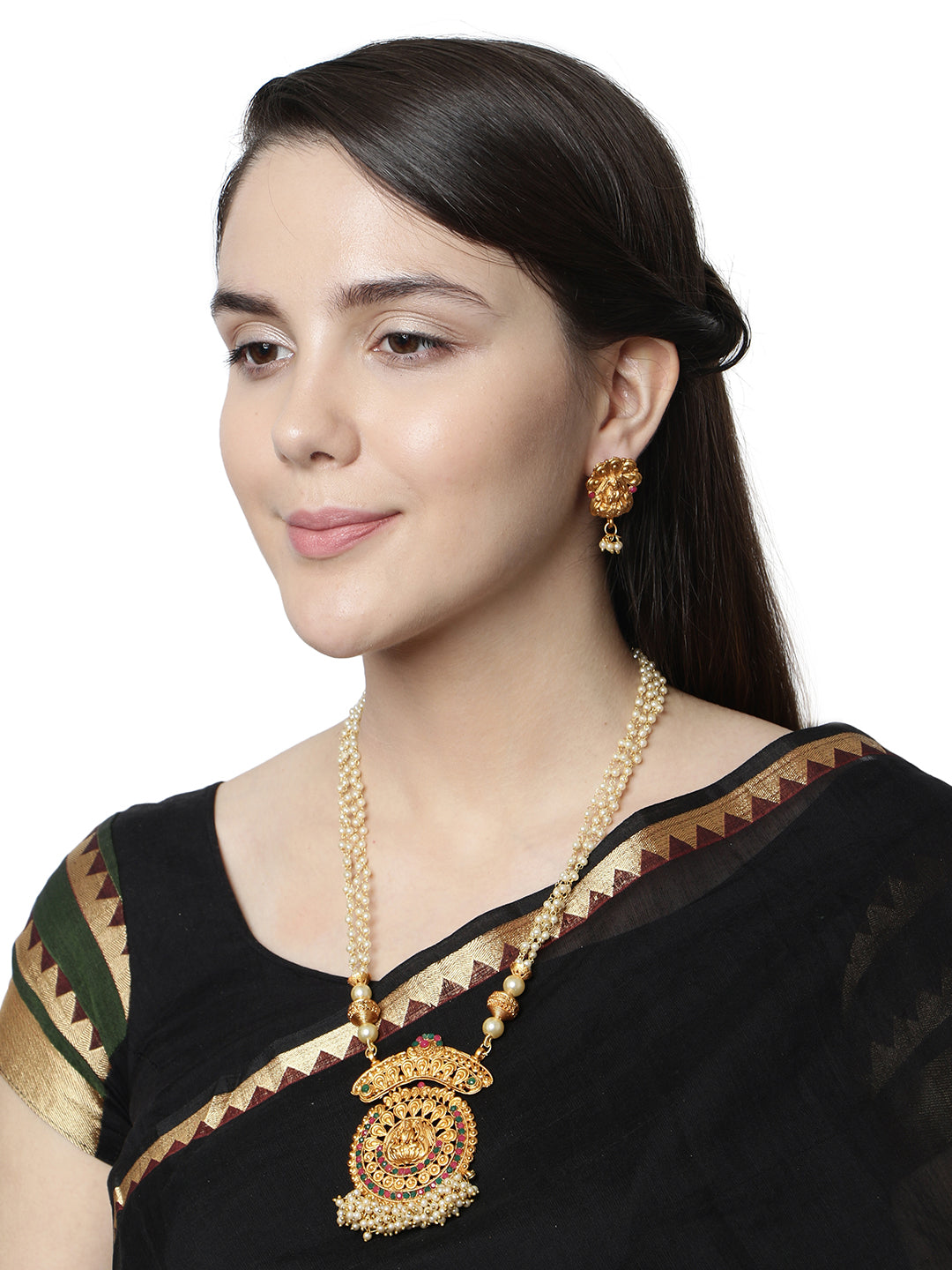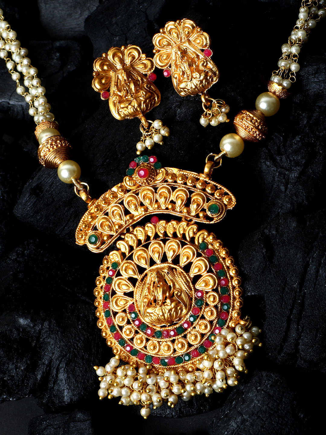 Women's Antique Matte Gold Finish Goddess Laxmi Green Stone Studded Temple Jewellery set