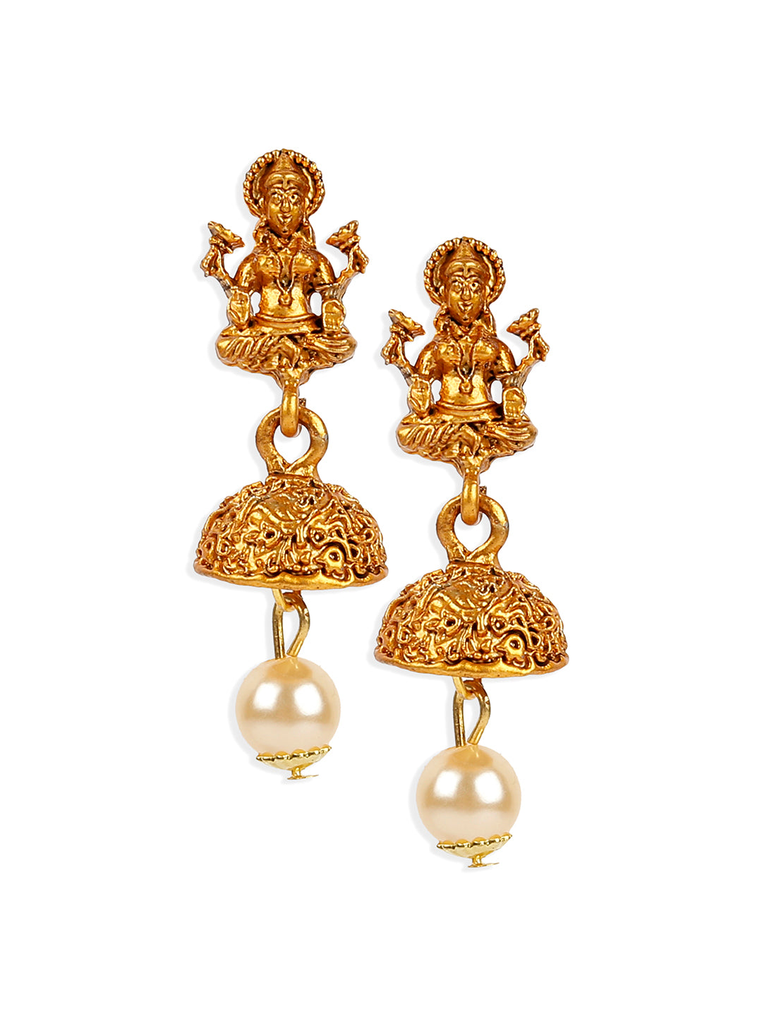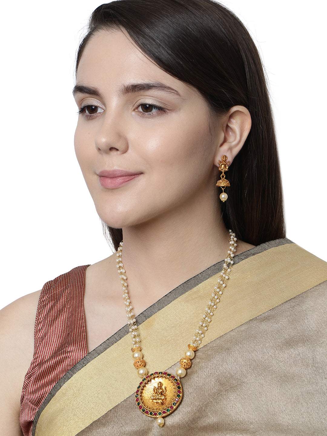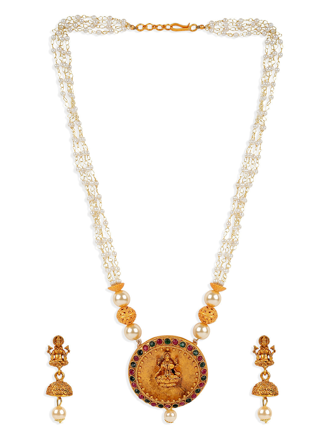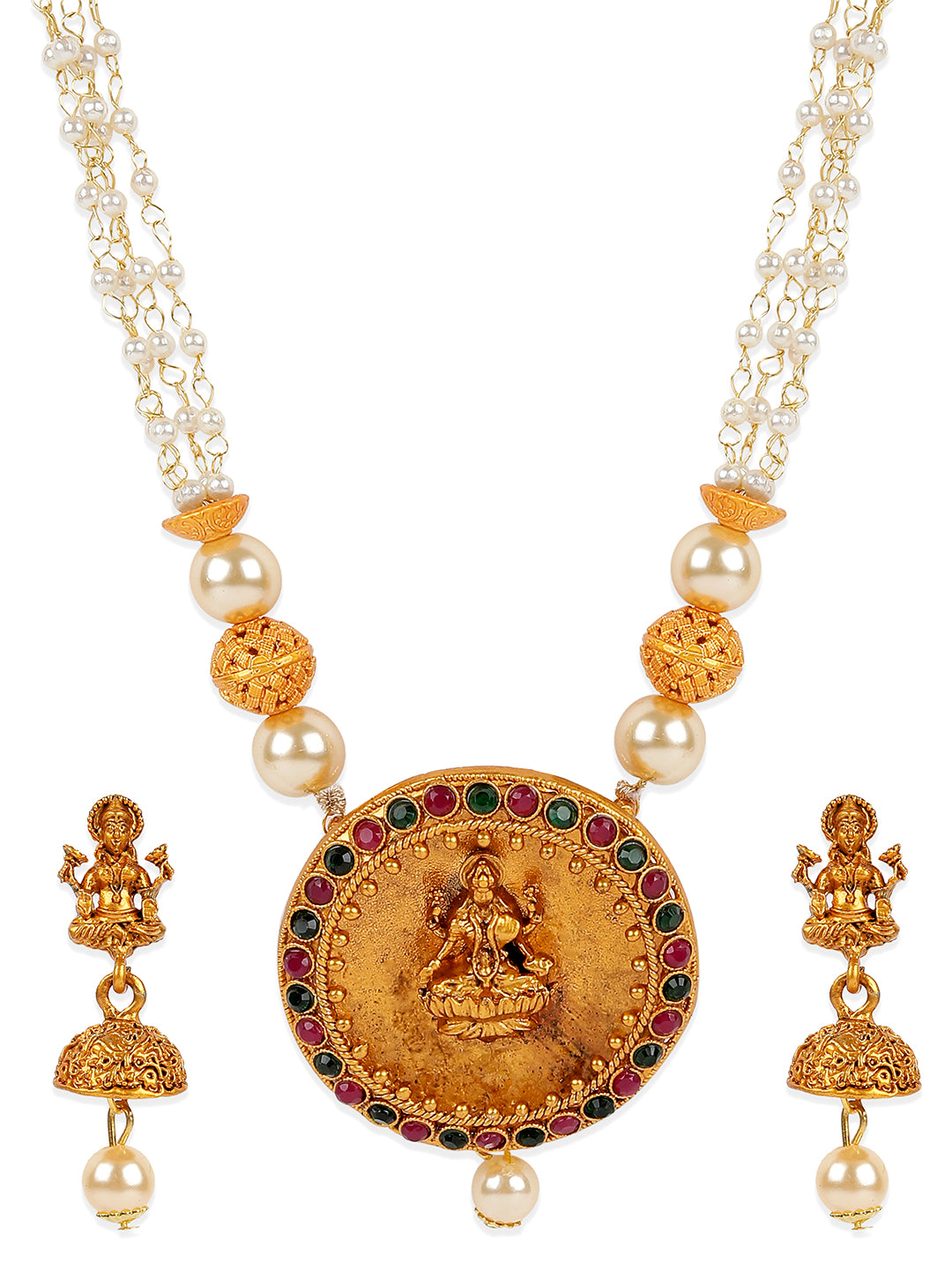 Women's Antique Matte Gold Finish Goddess Laxmi Green Stone Studded Temple Jewellery set