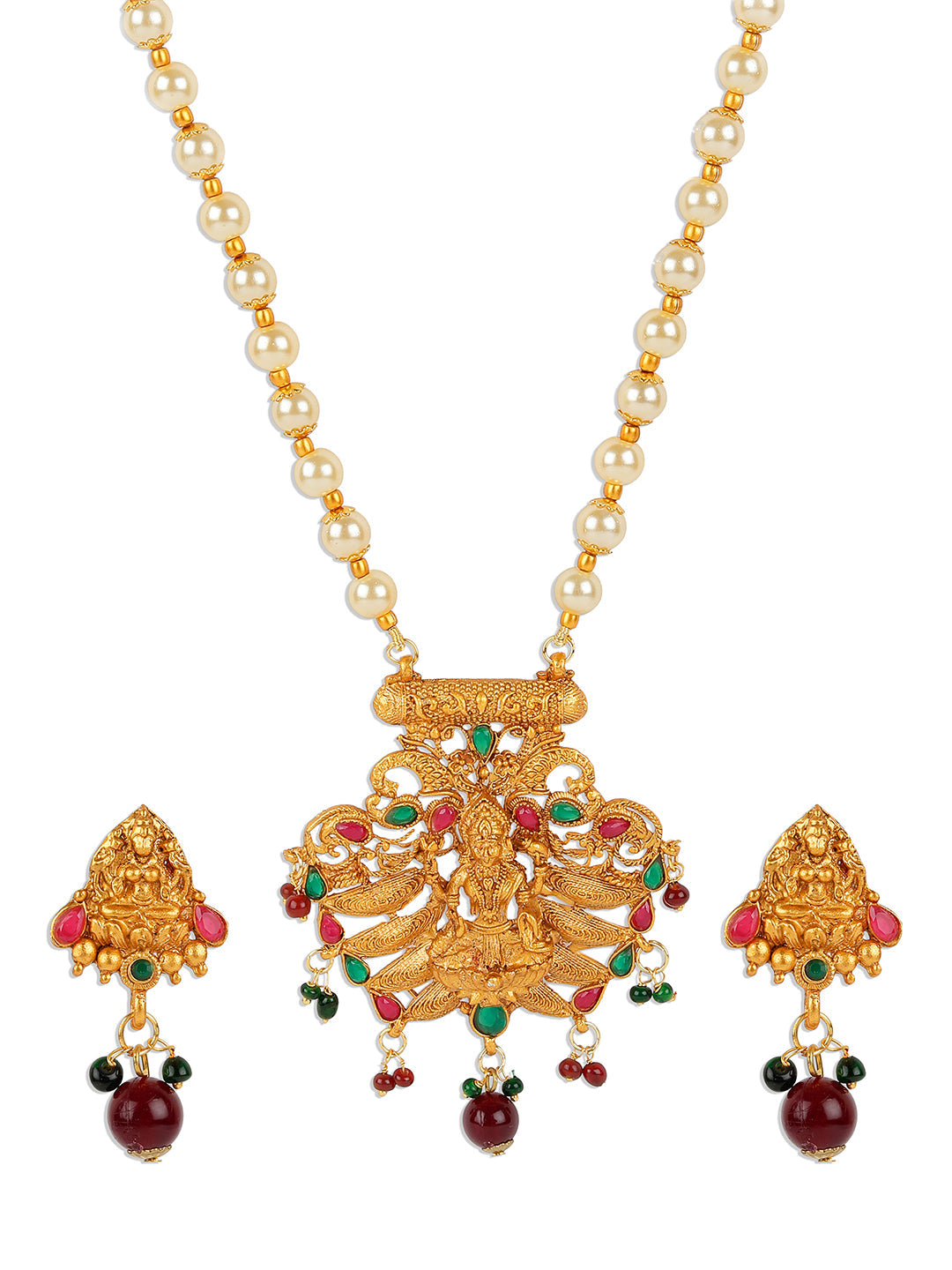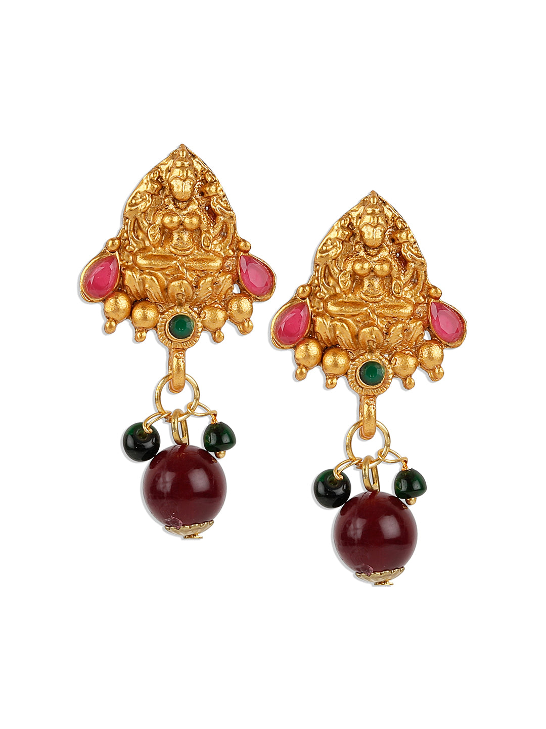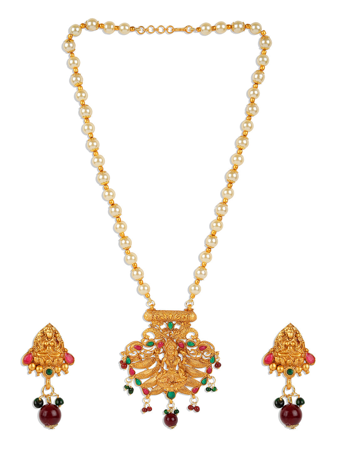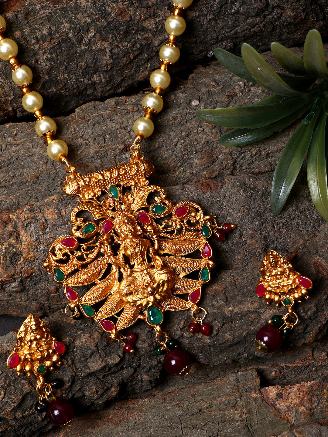 Women's Antique Matte Gold Finish Green Maroon Stone Studded Temple Jewellery set