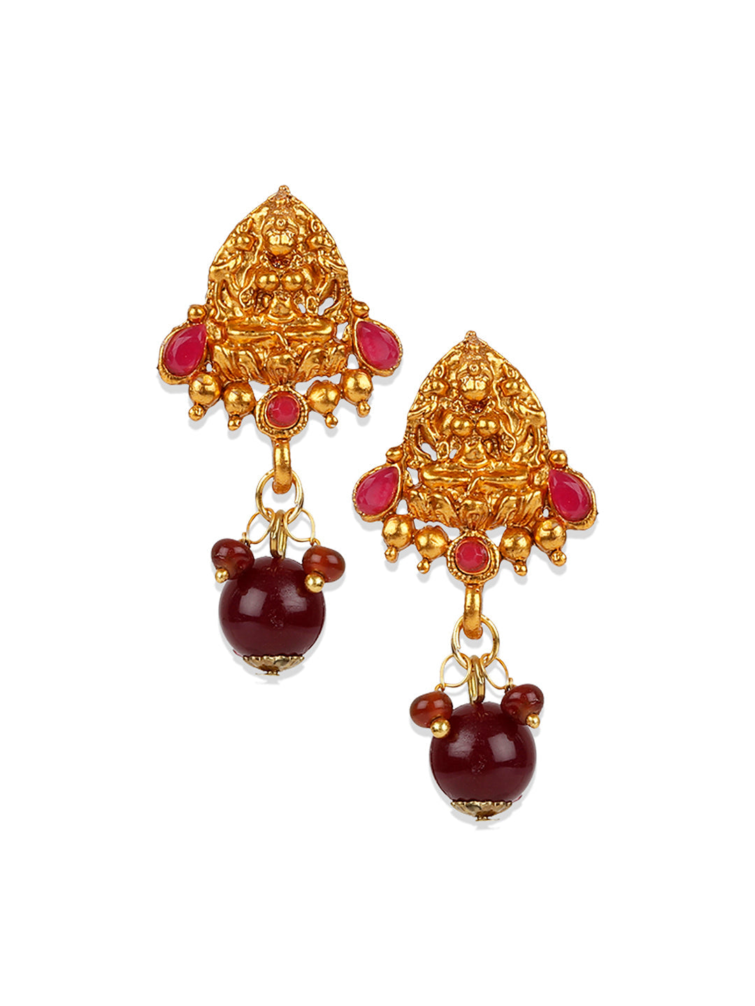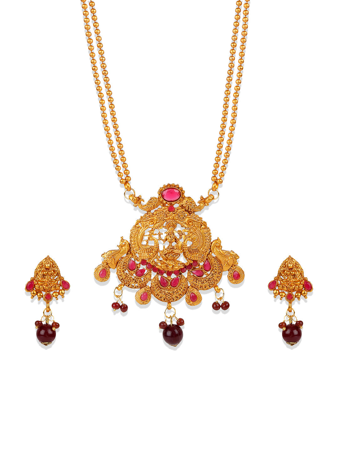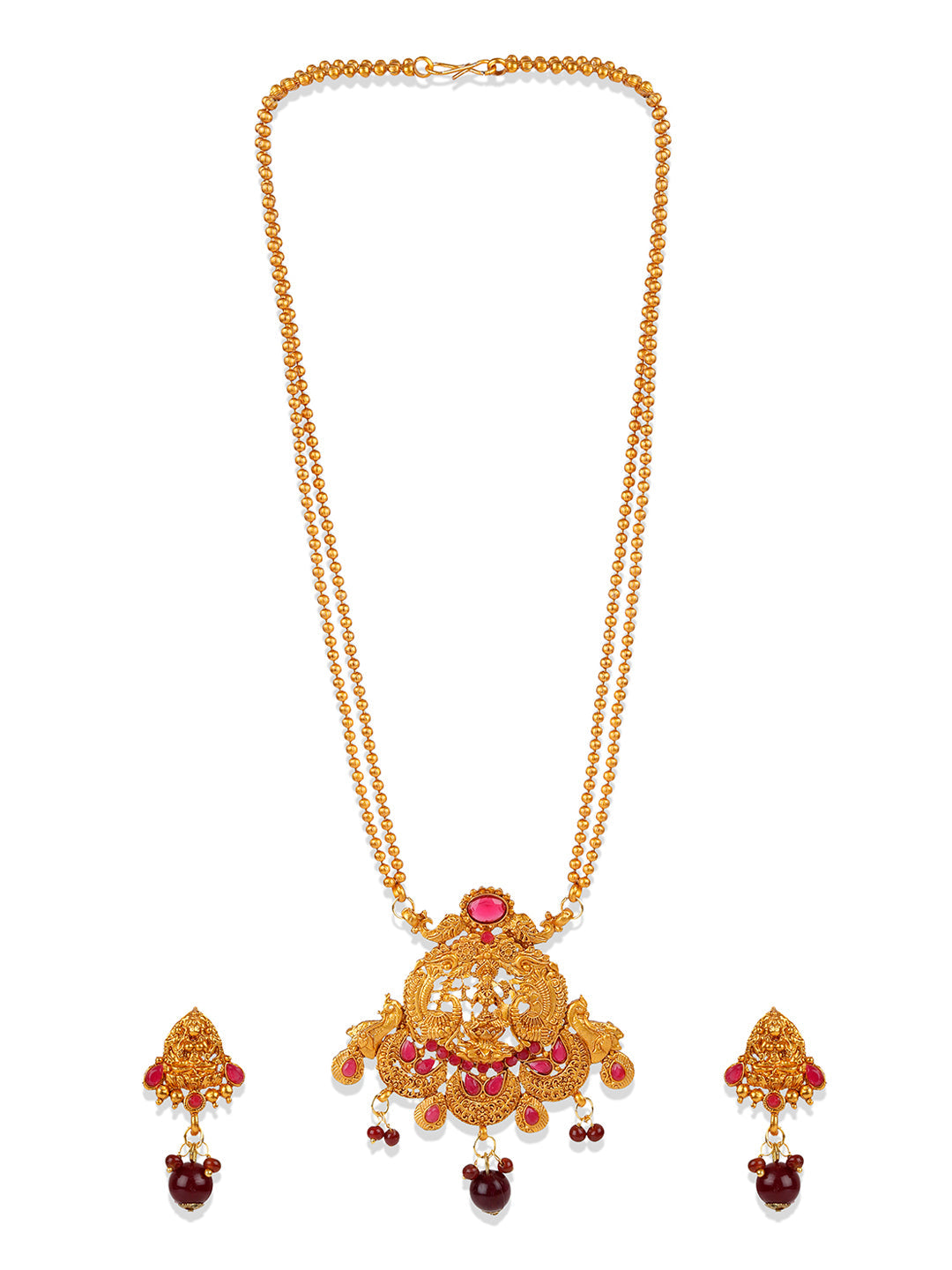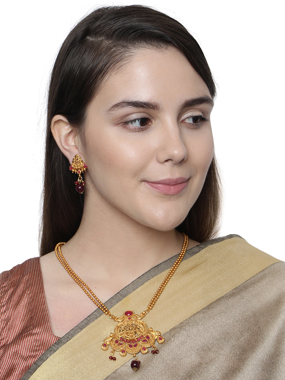 Women's Antique Matte Gold Finish Maroon Stone Studded Temple Jewellery set