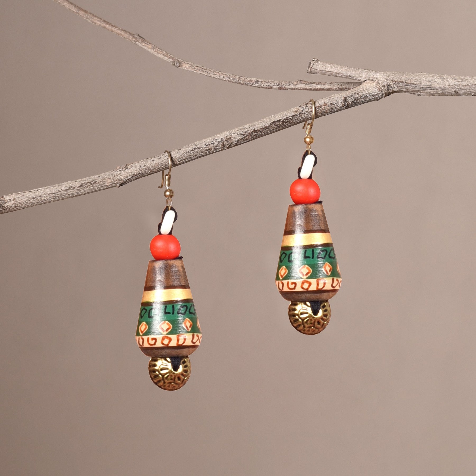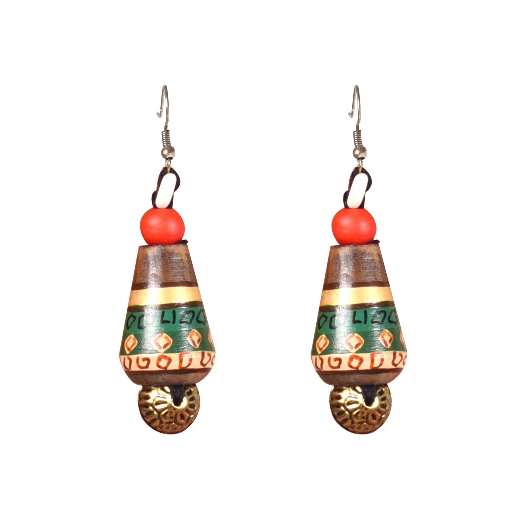 "Artisan Mosaic Earrings" showcase intricate patterns crafted from a mosaic of wooden and glass beads, each one individually handpainted, creating a stunning and unique work of wearable art.