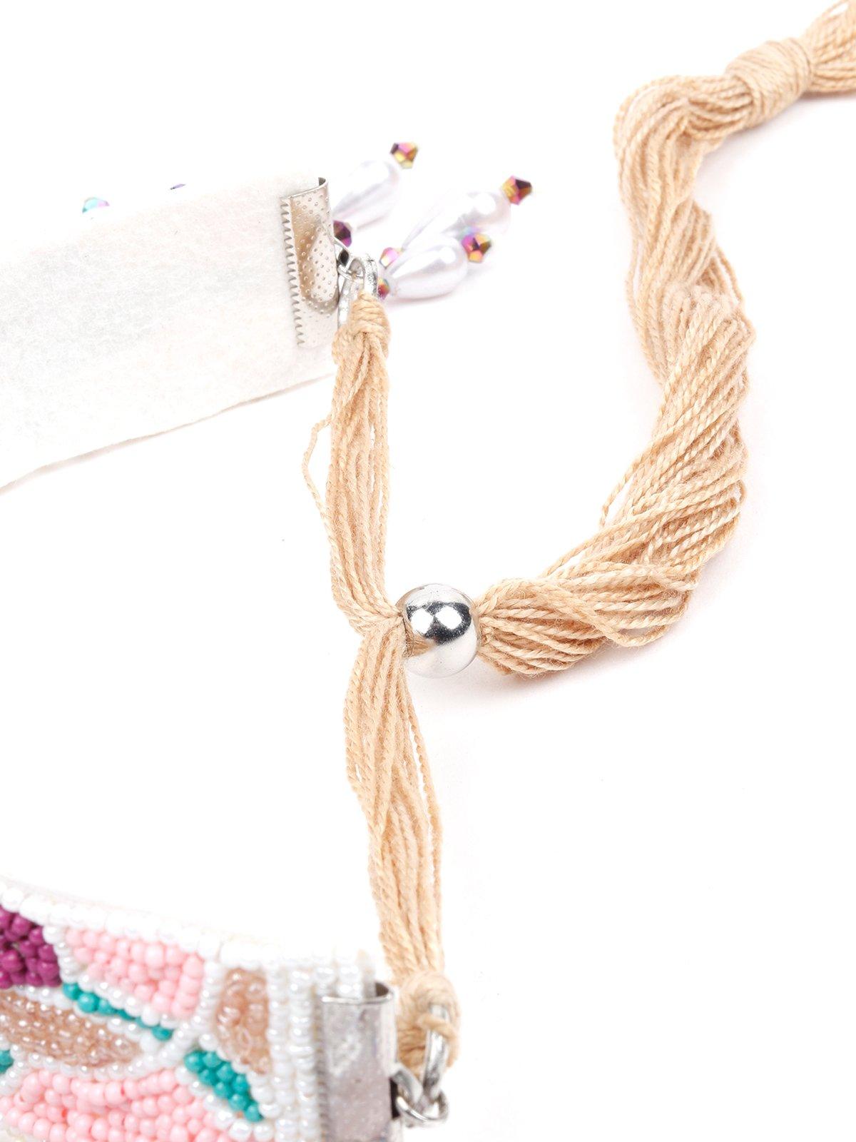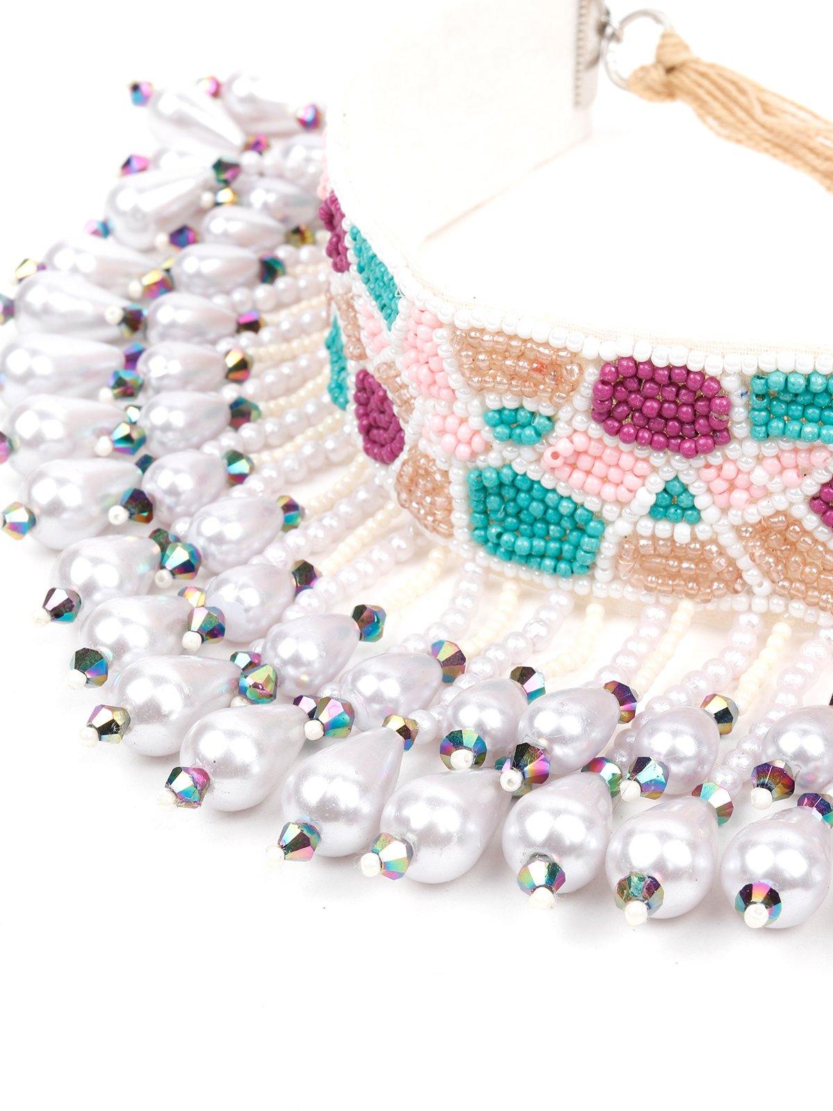 - This exquisite necklace features beads all over the neckline in green, red & cream colors.