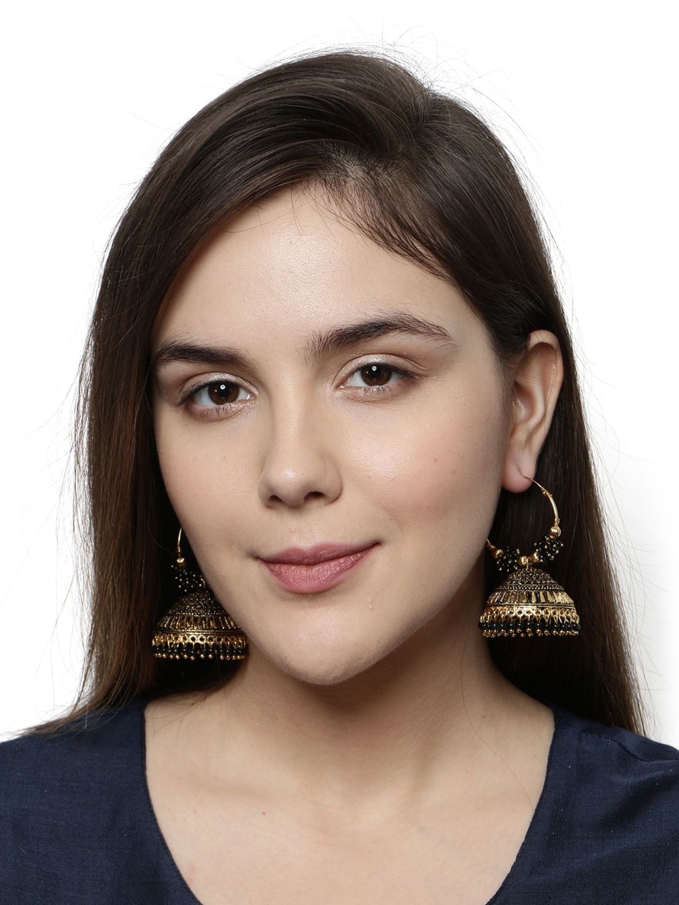 Black & Gold-Plated Enamelled Dome Shaped Jhumkas Secured With Lever Back Closure, Details: Enamelled