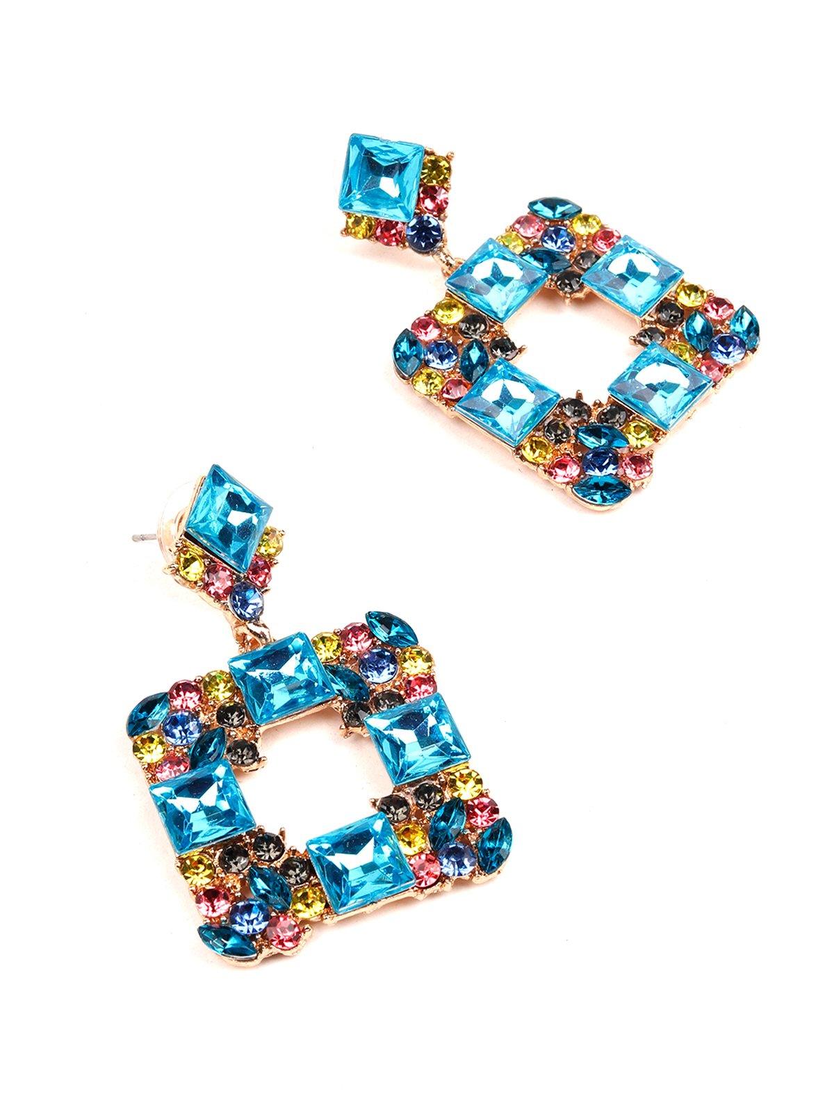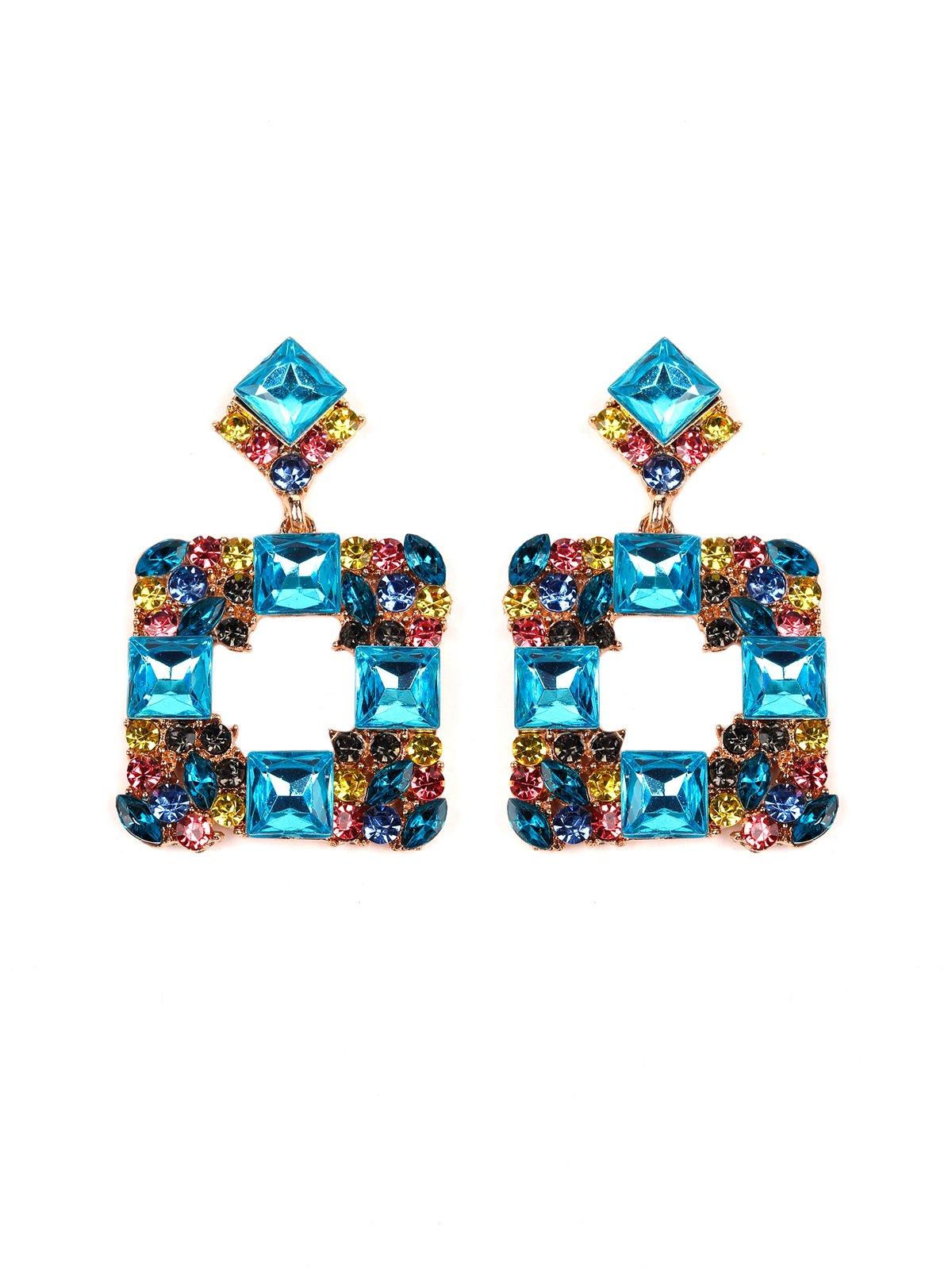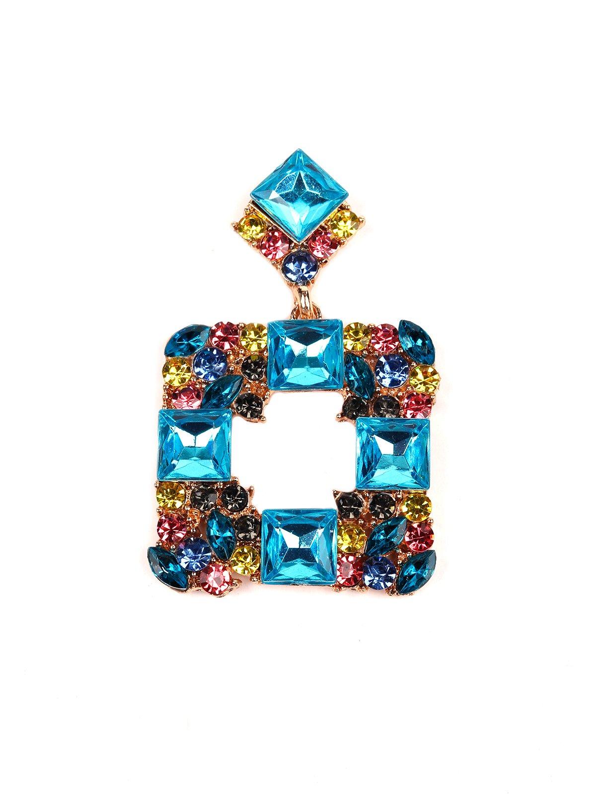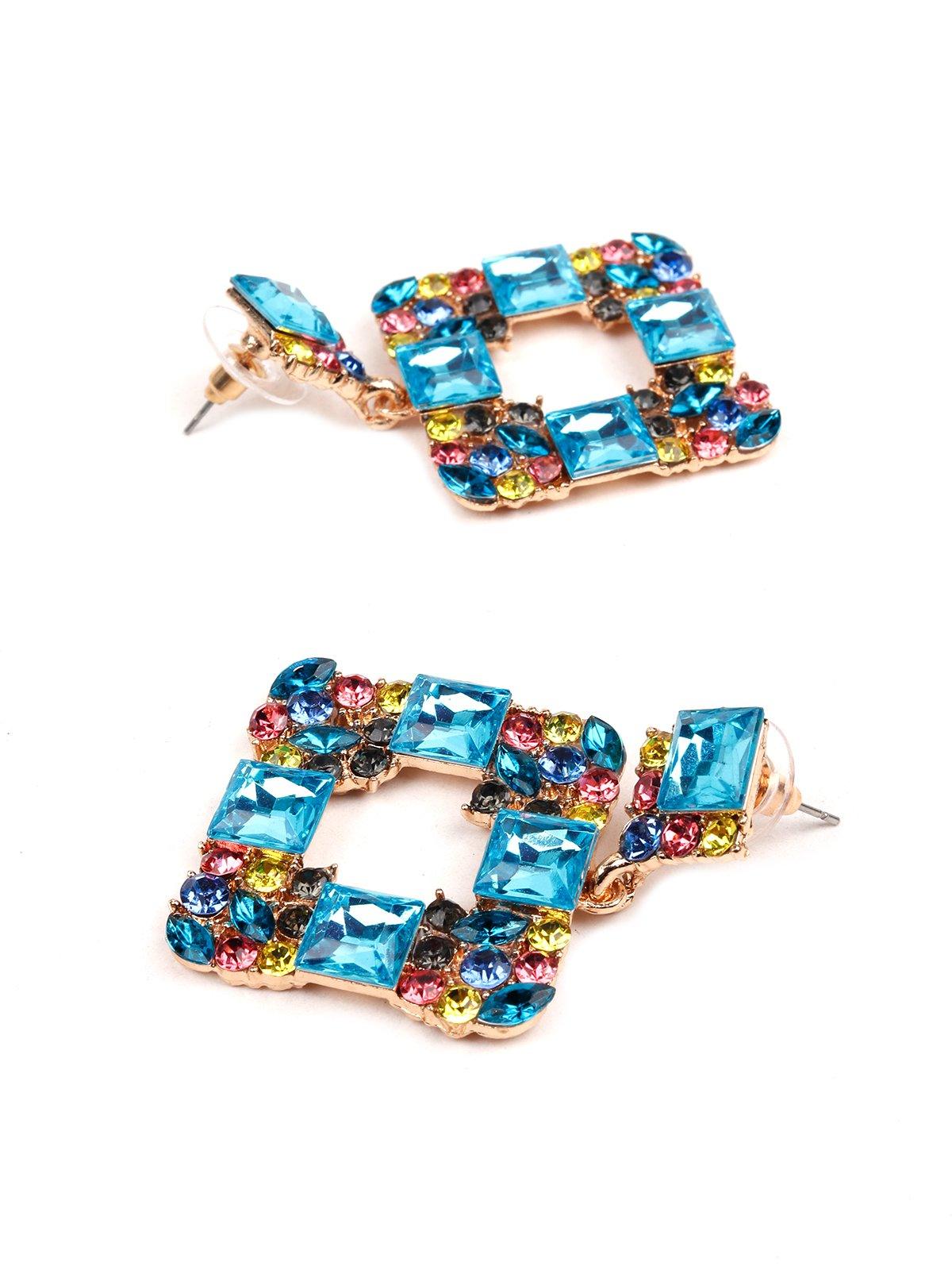 - Odette presents this exquisite gemstone embellished blue colour earrings in a square shape its features multicoloured small gemstones at each corner.