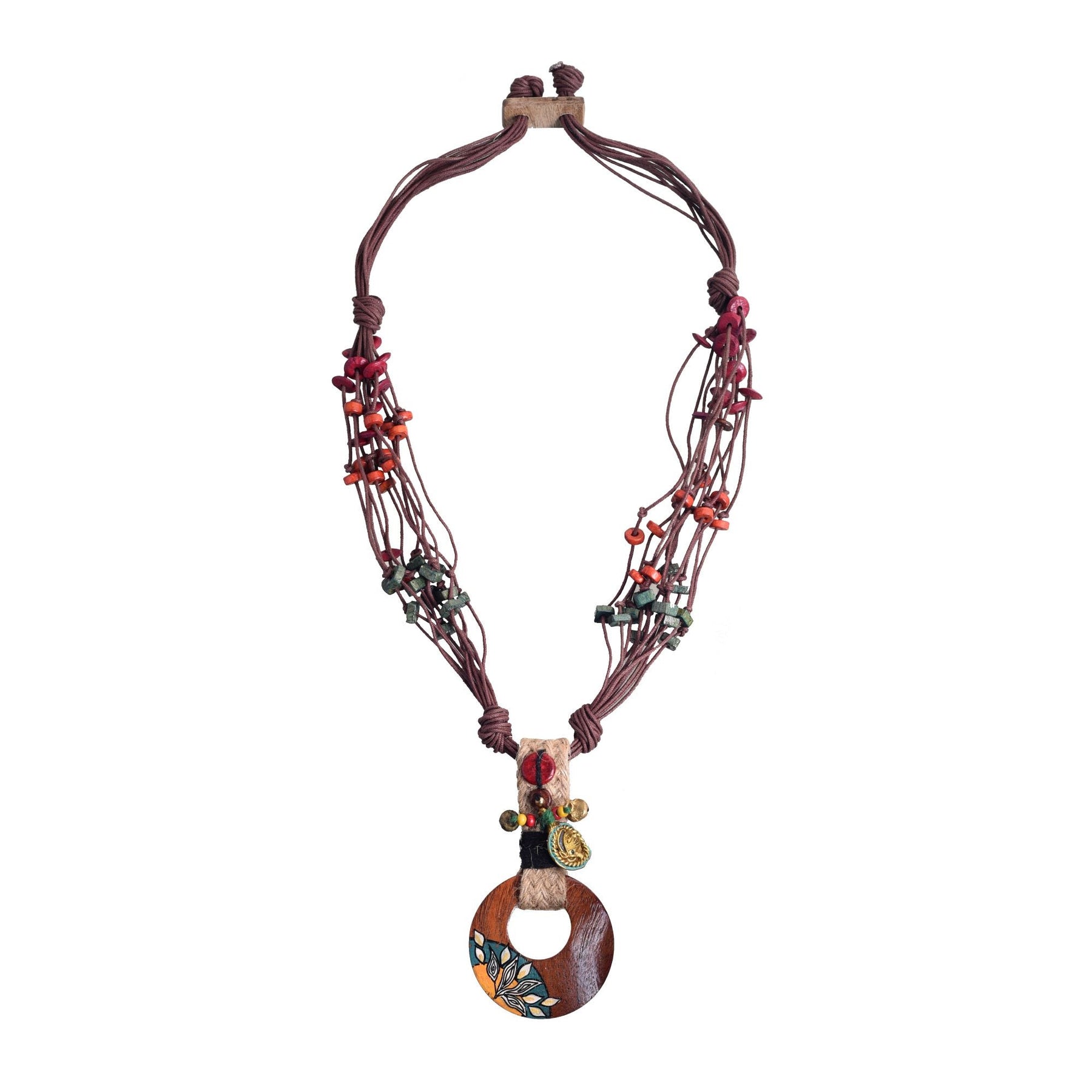 This handcrafted necklace with a round pendant and hanging brass figures is the perfect embodiment of boho chic. The unique design features a round wooden pendant that has been carefully crafted by skilled artisans and decorated with brass figures that hang delicately from the pendant.