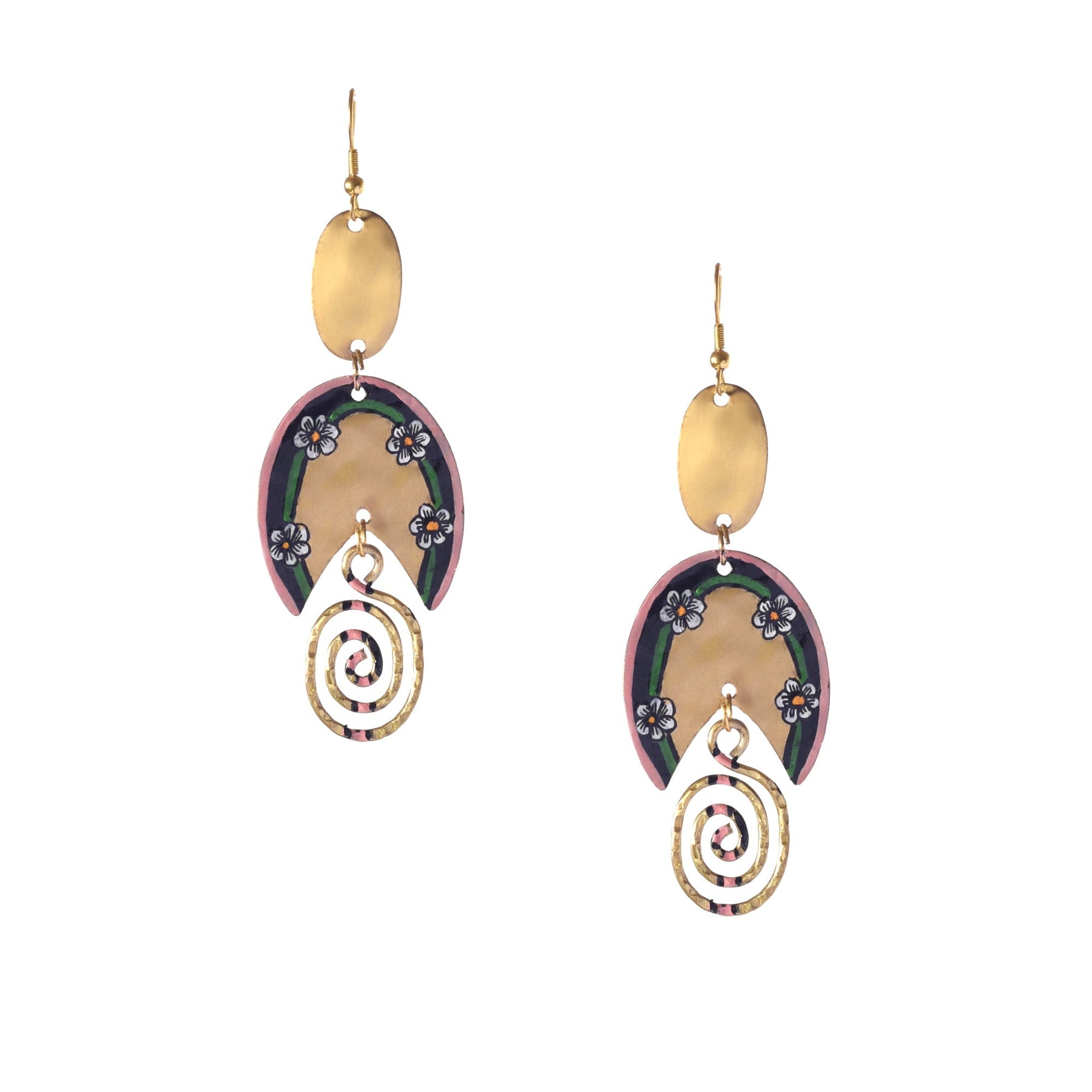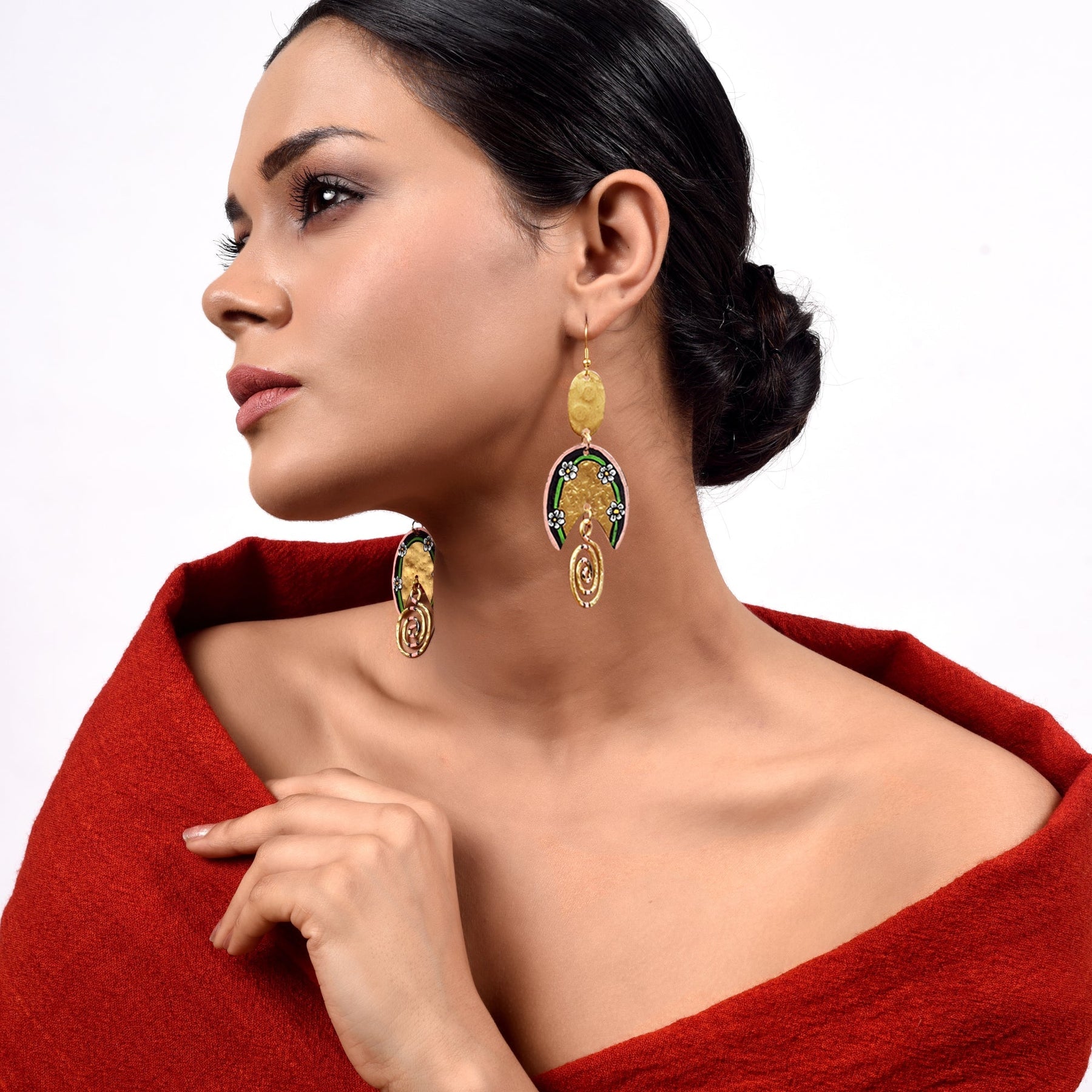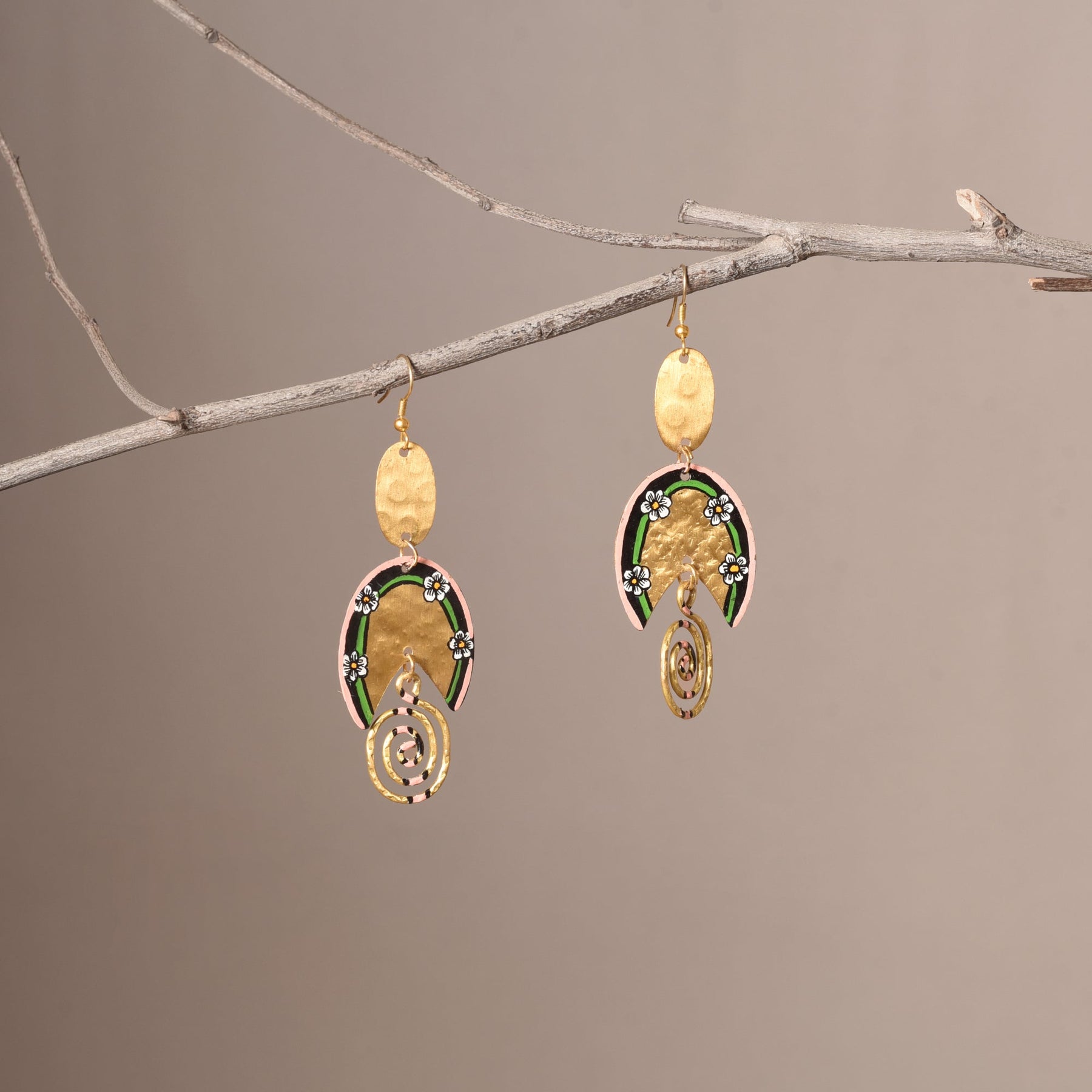 "Celestial Starburst Earrings" gleam with brass starbursts, each one intricately designed and painted to evoke the celestial wonders of the night sky.