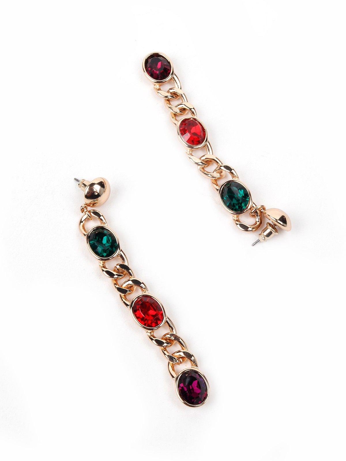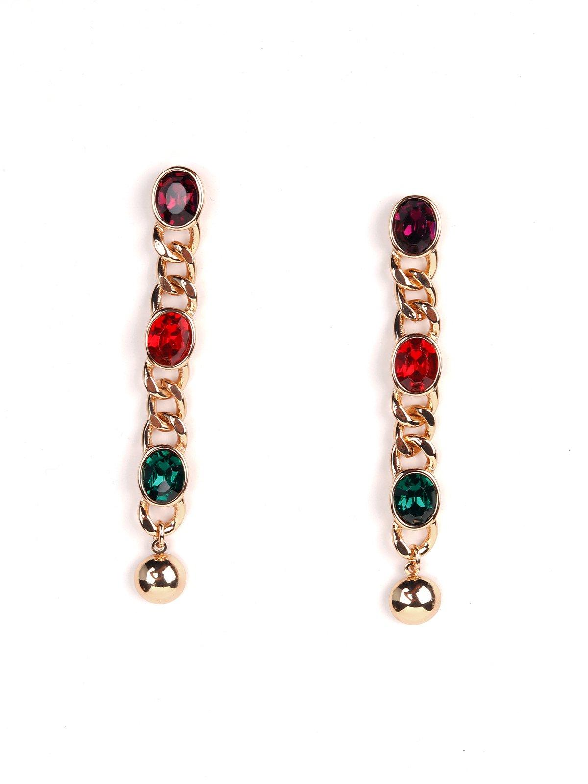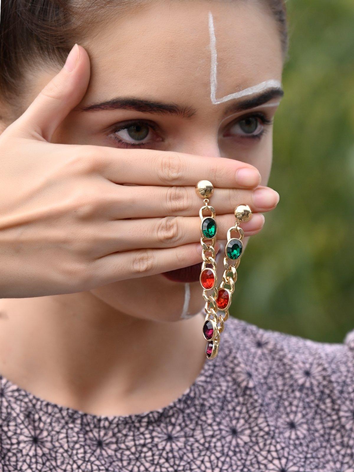 Featuring a very gorgeous gold chained designed drop earrings with Ruby, Emerald and Amethyst faux gem stones embellished on it. They are all you need to shine.