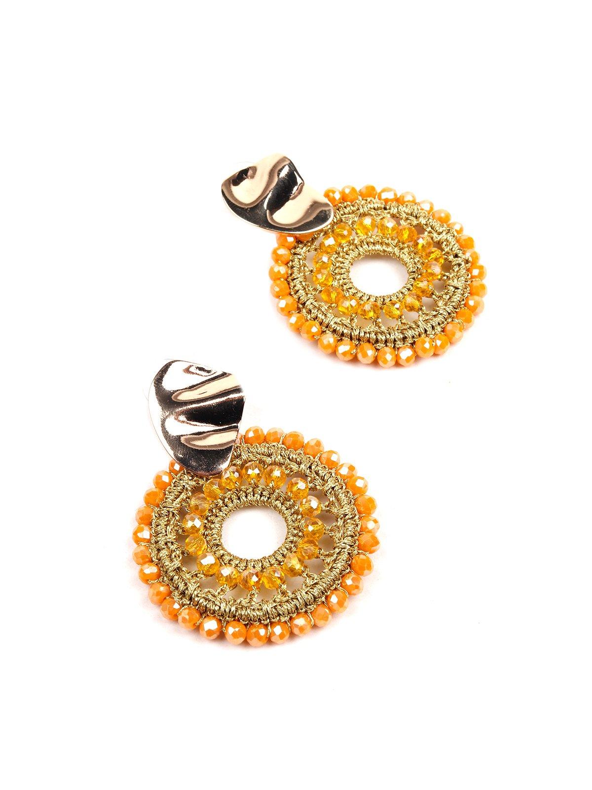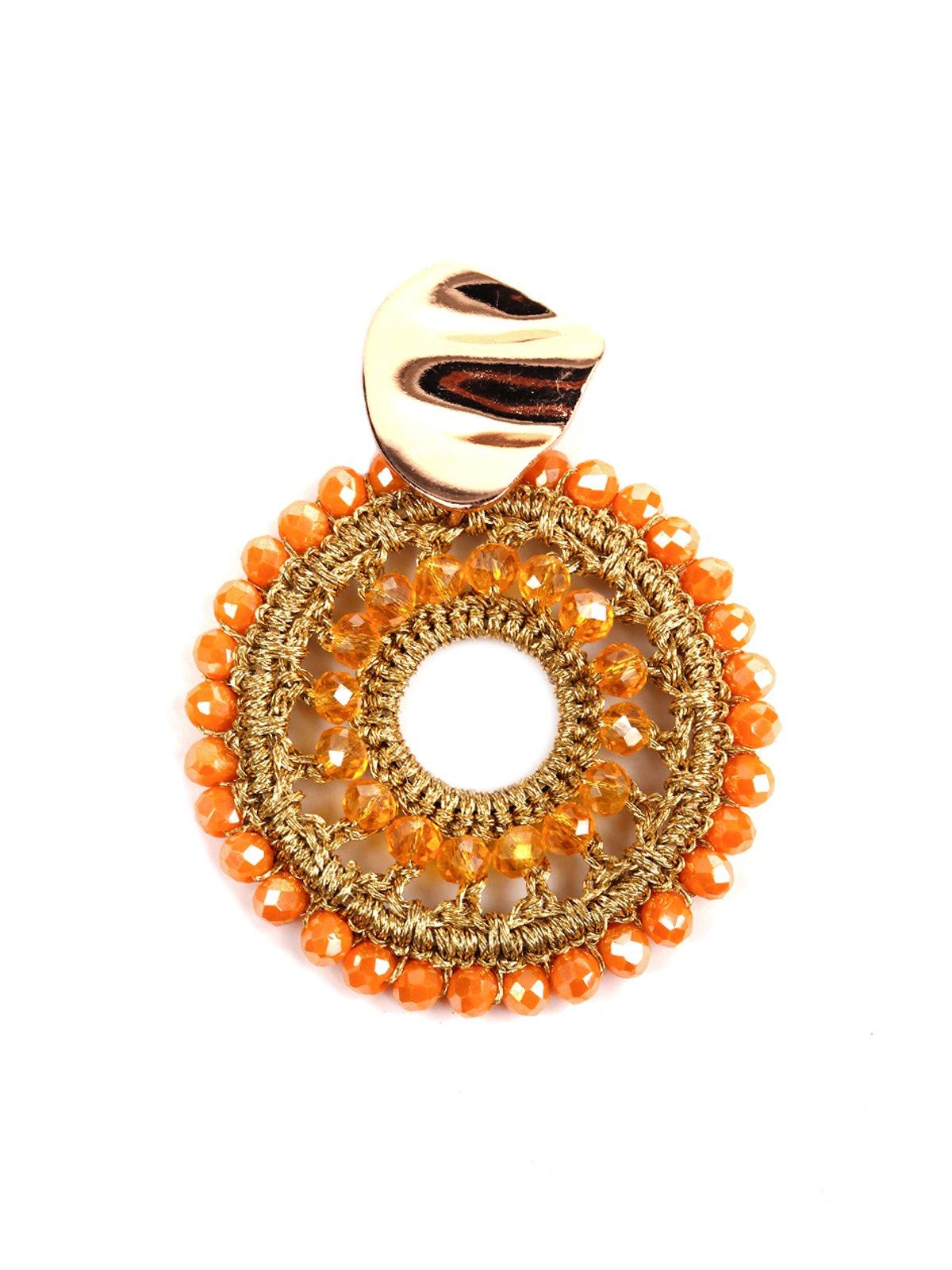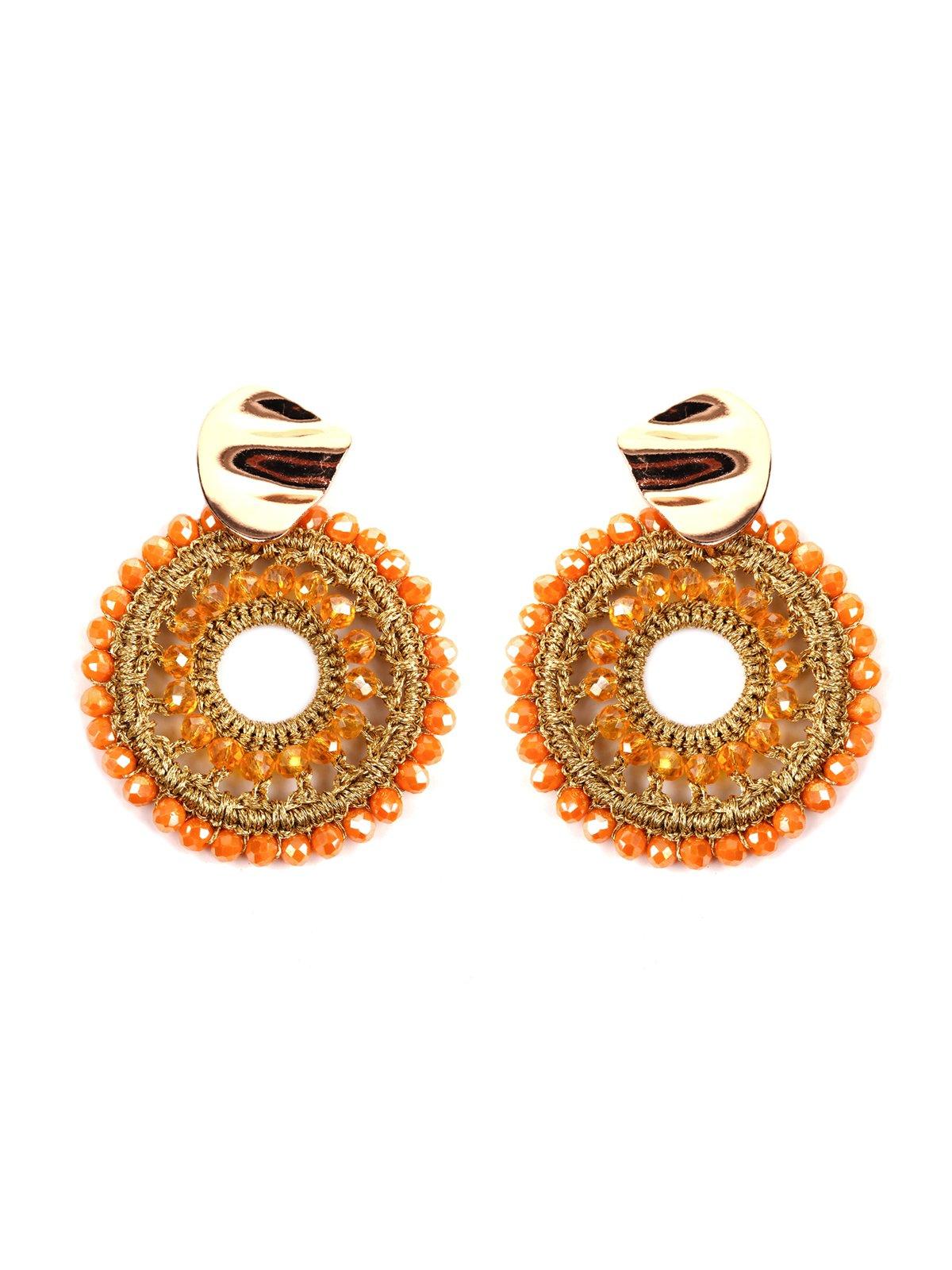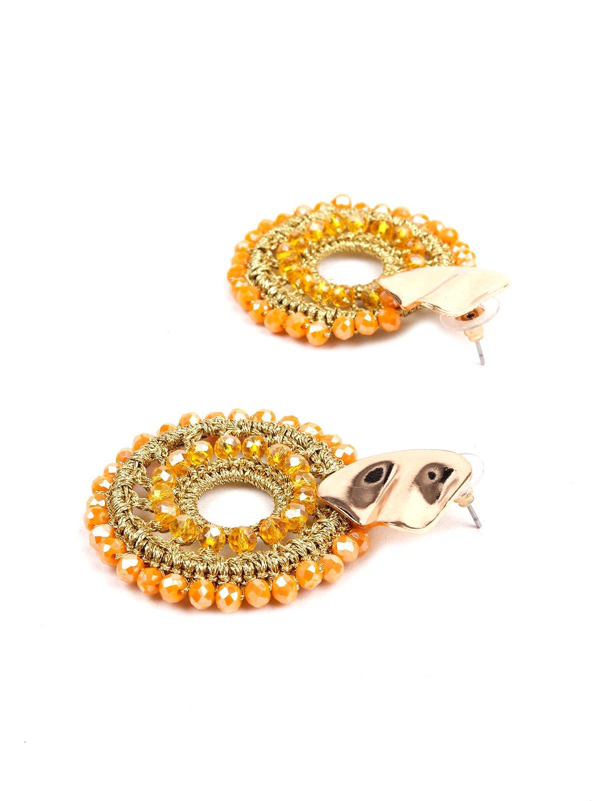 - Presenting this exclusive piece by Odette in a round shape, the earrings have tiny orange colour beads secured on the hoop on the golden colour fabric.