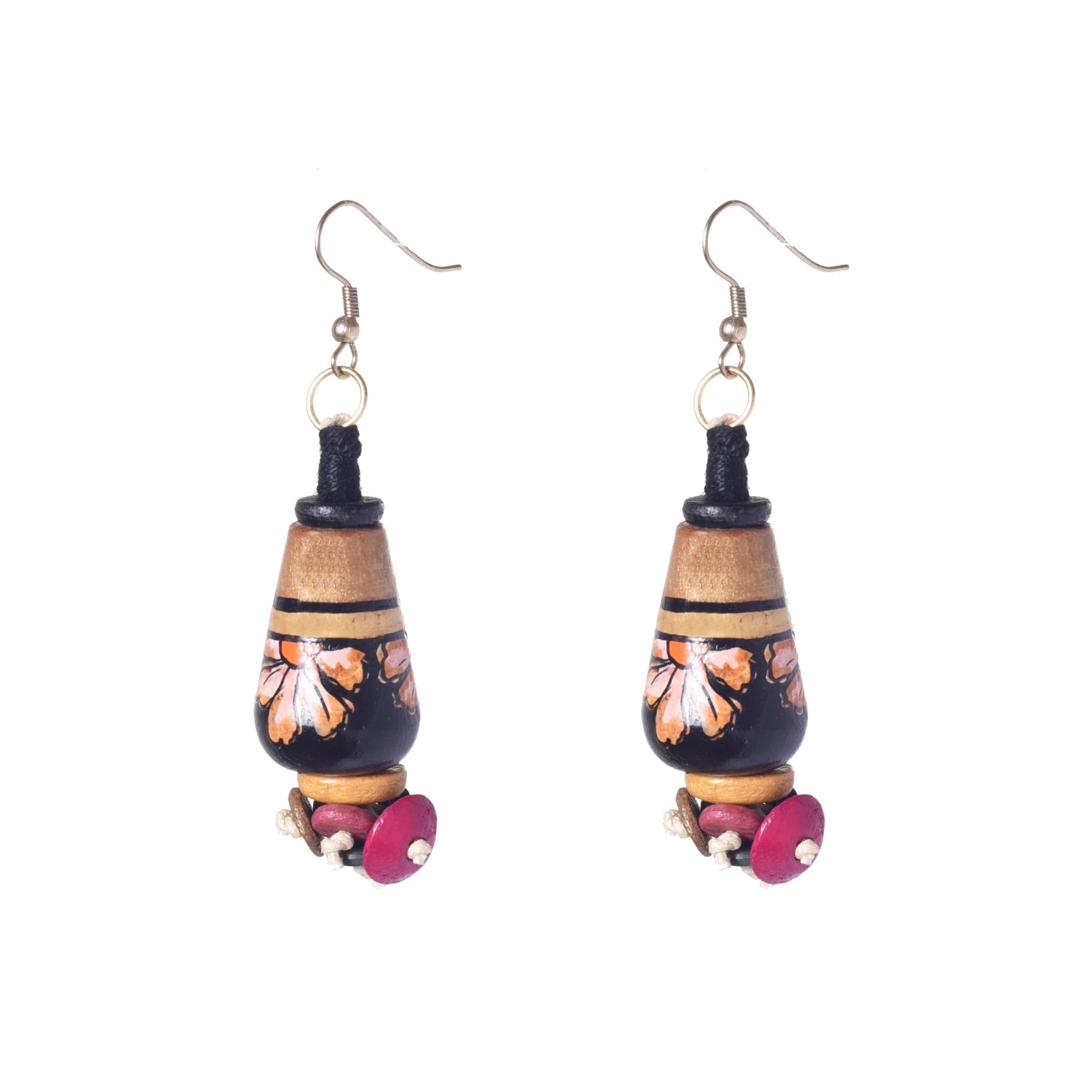 "Earthy Elegance Earrings" exude natural sophistication with their combination of wooden and glass beads, adorned with handpainted earthy tones and organic motifs, perfect for the eco-conscious fashionista.