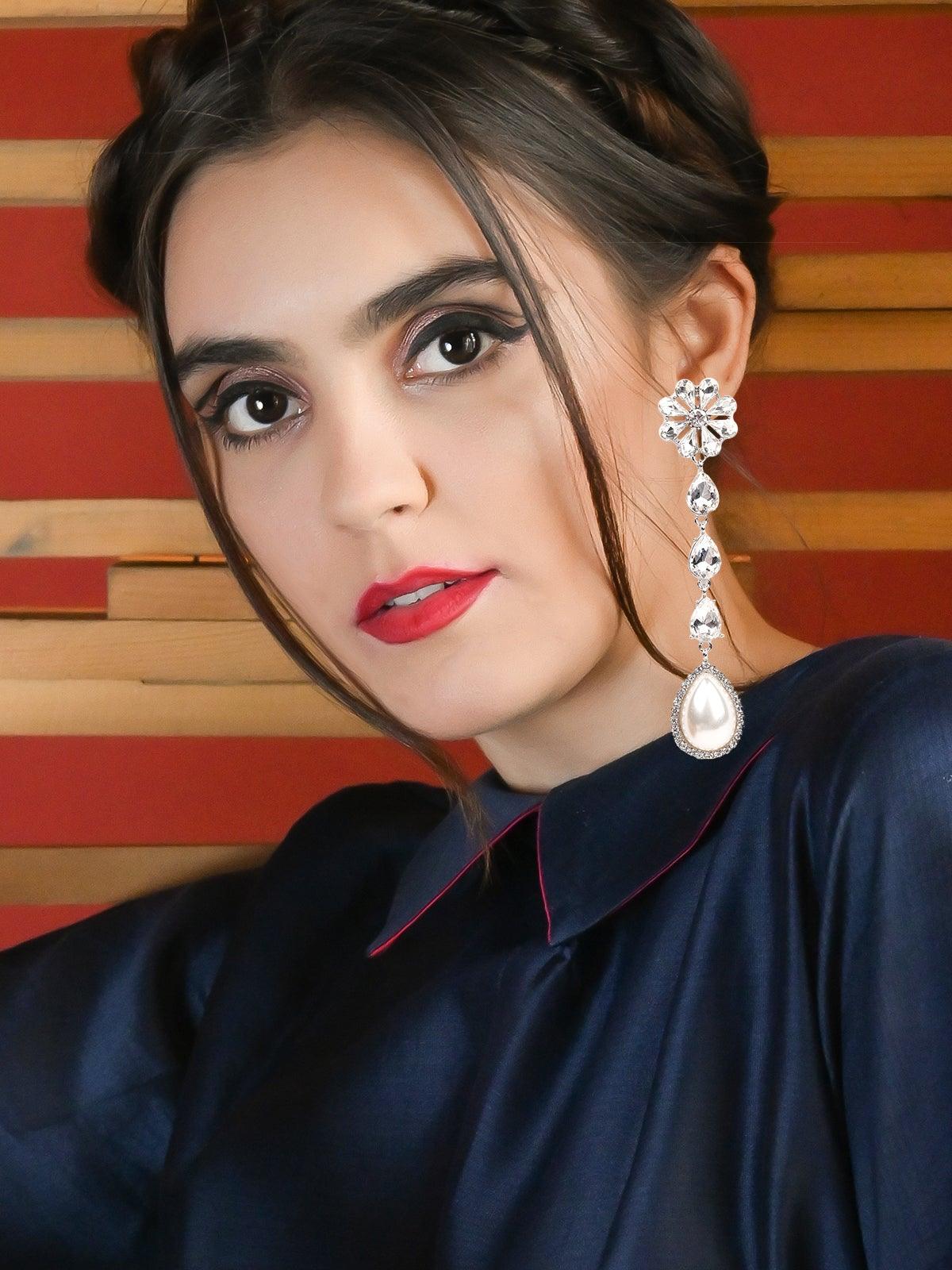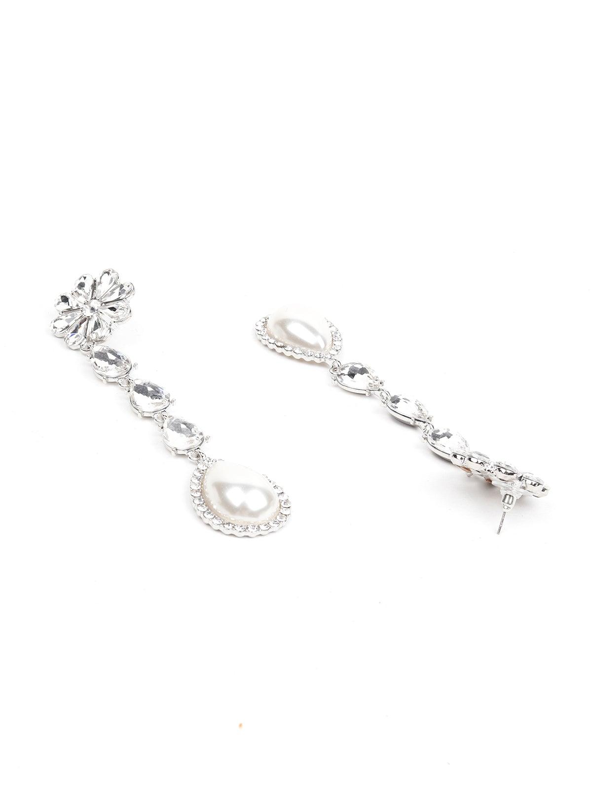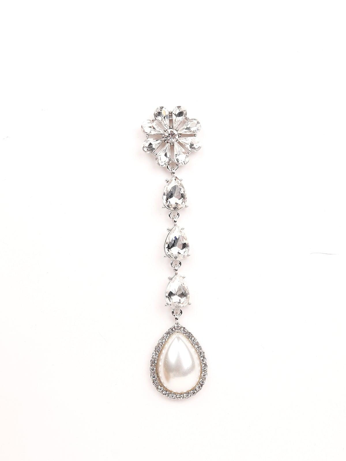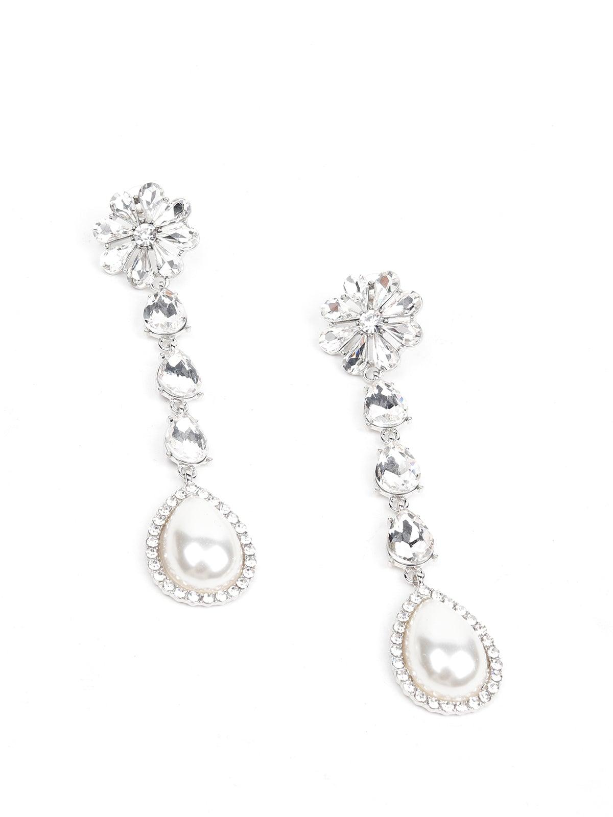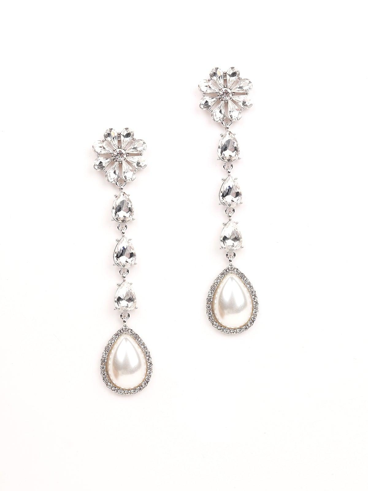 - Odette presents these stunning statement earrings that are embedded with clear crystals in a row and it features a beautiful tear-drop white pearl surrounded with tiny fine crystals