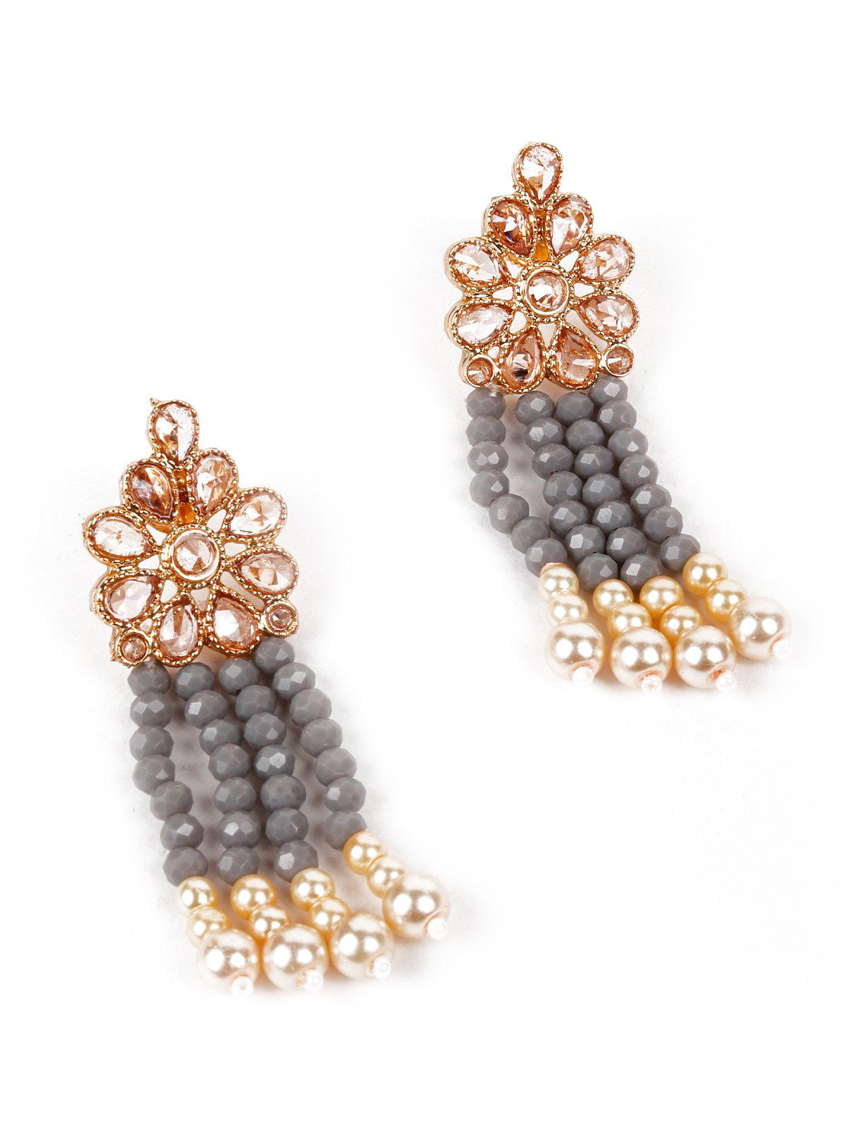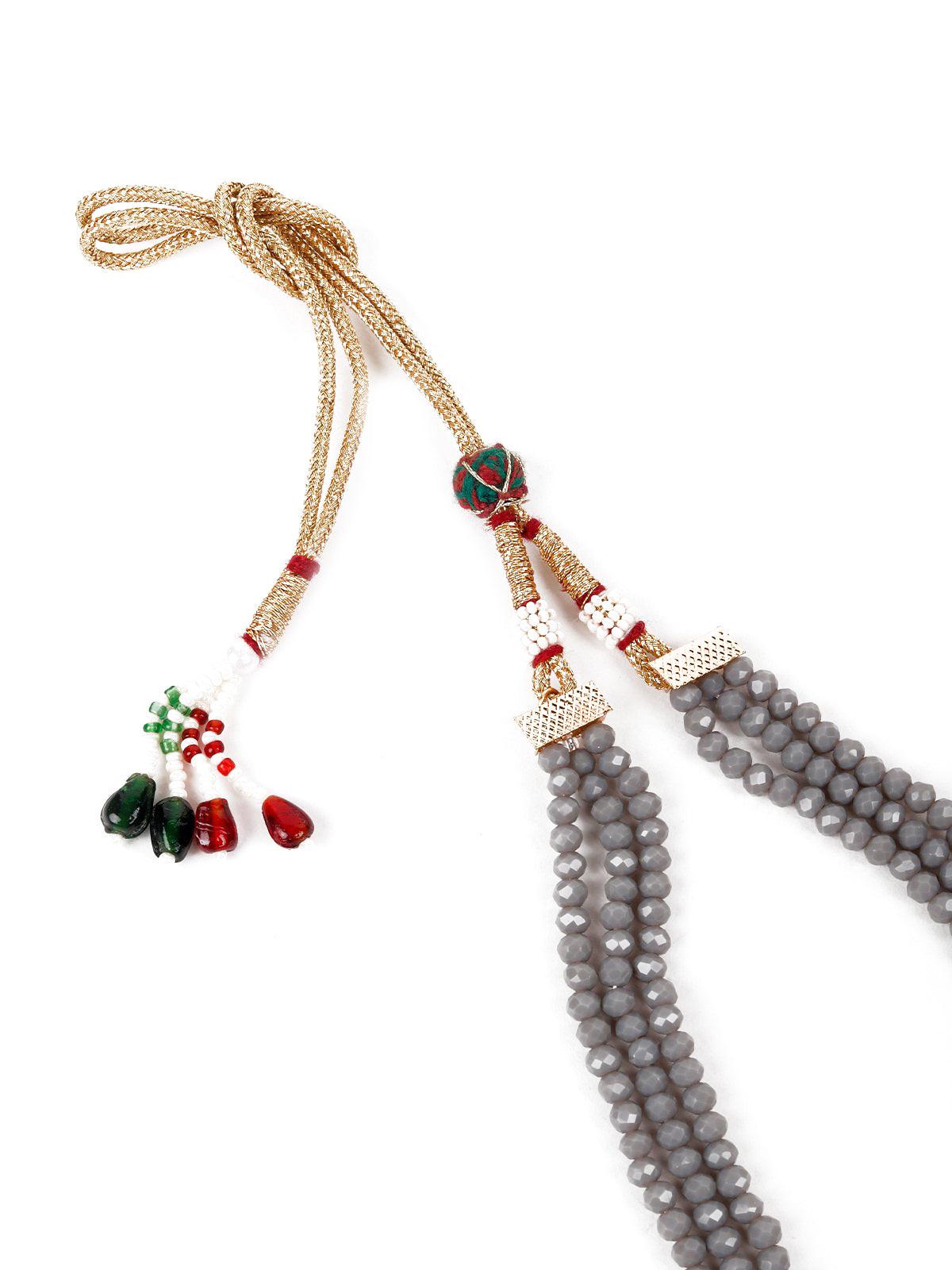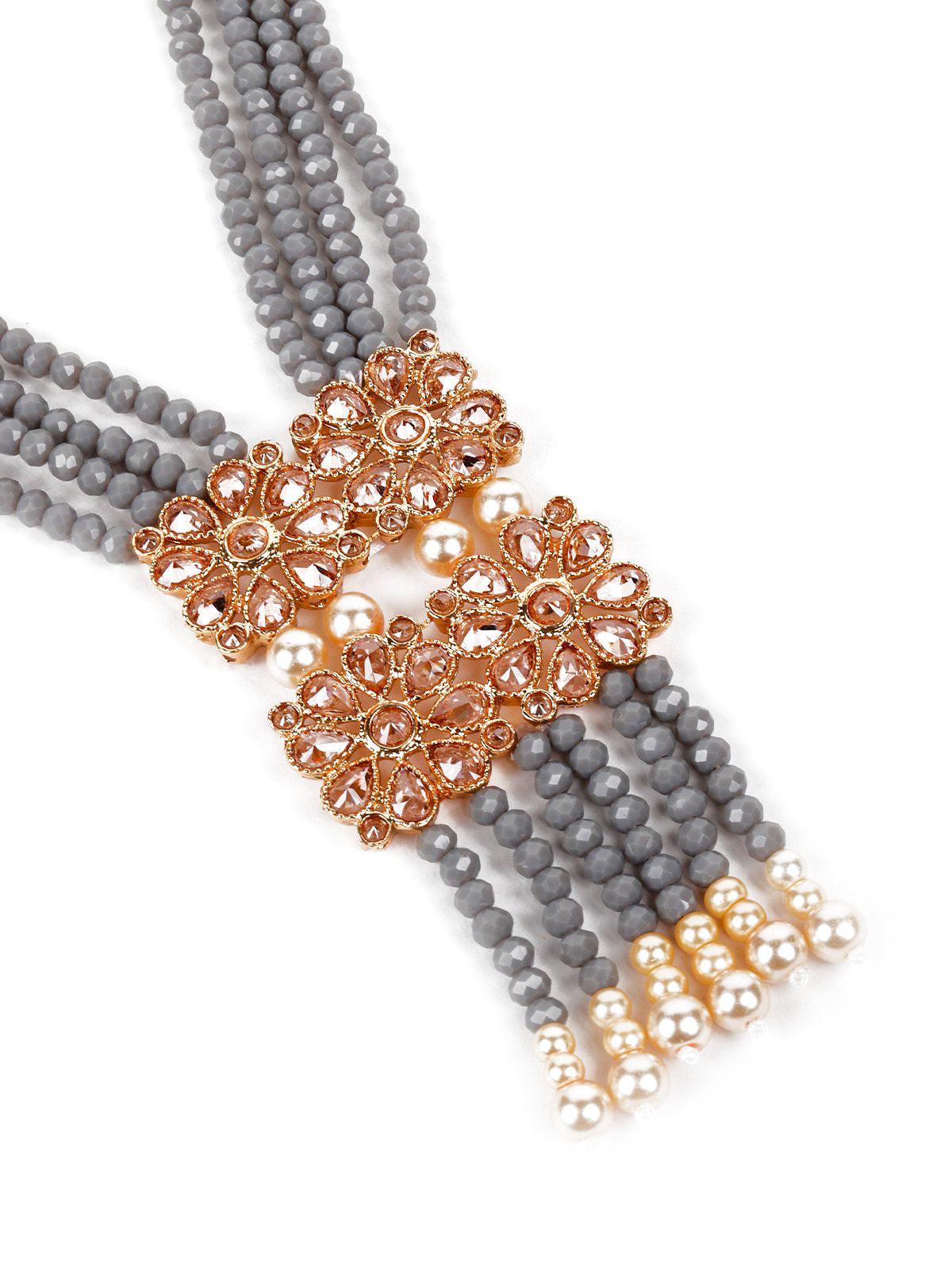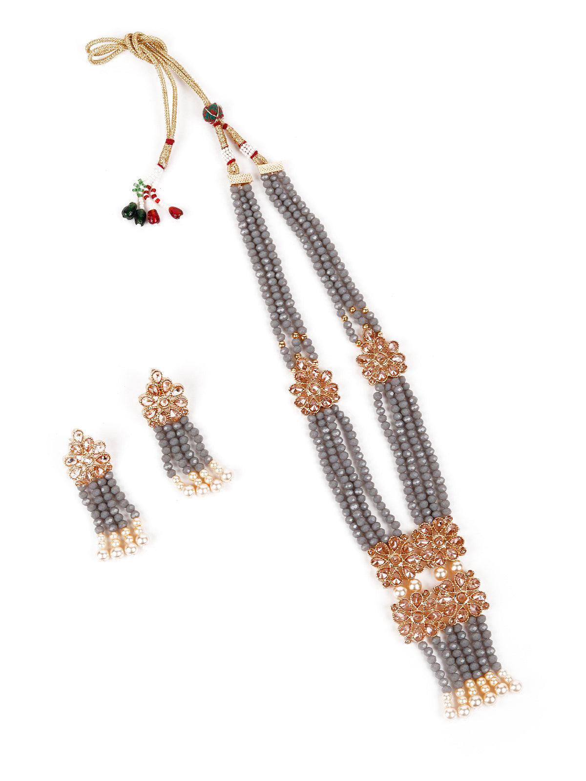 Featuring this stunning grey beaded long haar necklace set with gold-tone Kundan work it also features pearl detailing.Grey beaded drop Kundan work earrings The rich textures and elegant design will give you a whole new persona. The necklace is secured with a drawstring(Dori) closure. Product detail: