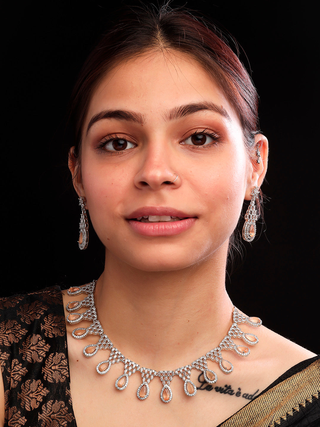 American Diamond necklace set, Sleek necklace, Minimalist jewelry, Special occasion jewelry, earrings, Modern necklace, Elegant jewelry, Fashionable necklace, Dainty earrings, Sophisticated jewelry, CZ stones, Special occasion necklace, STILEADDA