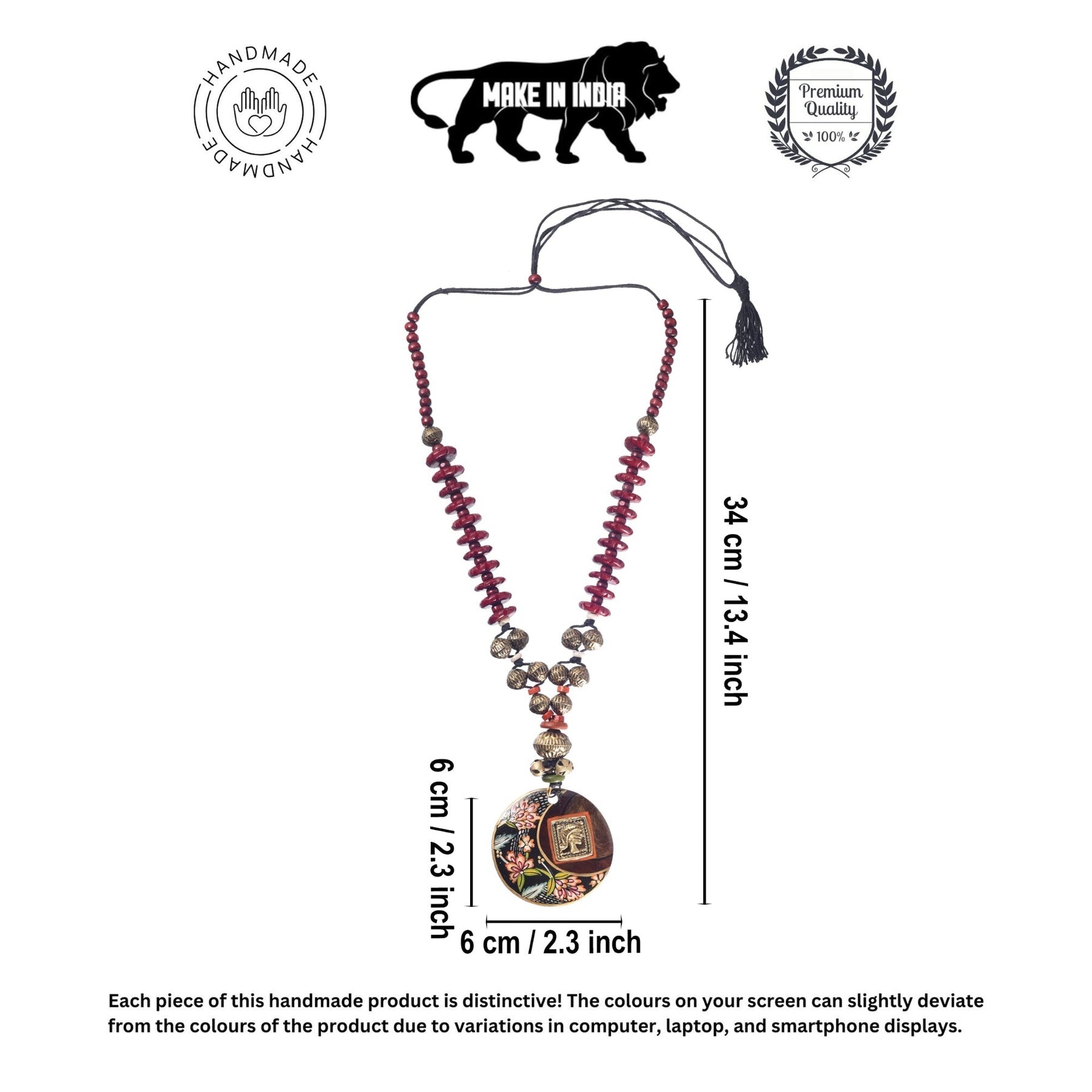 Embrace artisanal elegance with our Floral Brass Tile Necklace, featuring hand-painted floral patterns on a wooden base adorned with a handcrafted brass tile, complemented by round brass and red wooden beads.