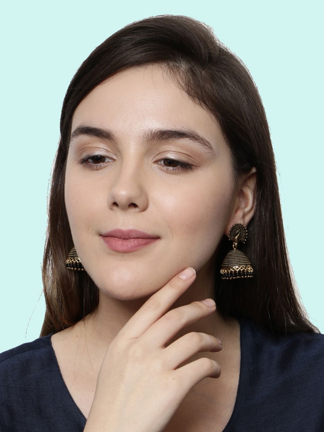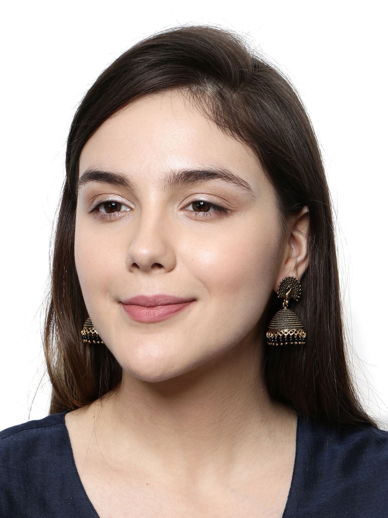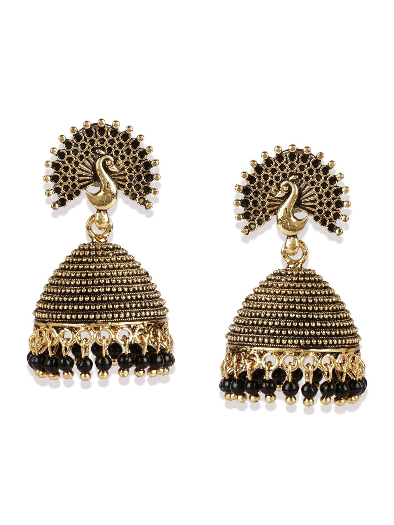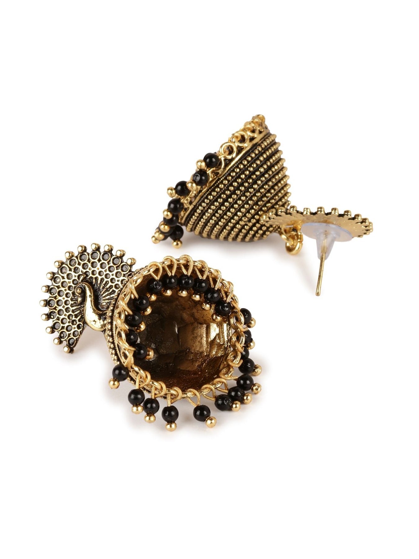 Gold Plated & Black Enamelled Peacock Shaped Jhumkas Secured With Post And Back Closure, Details: Enamelled
