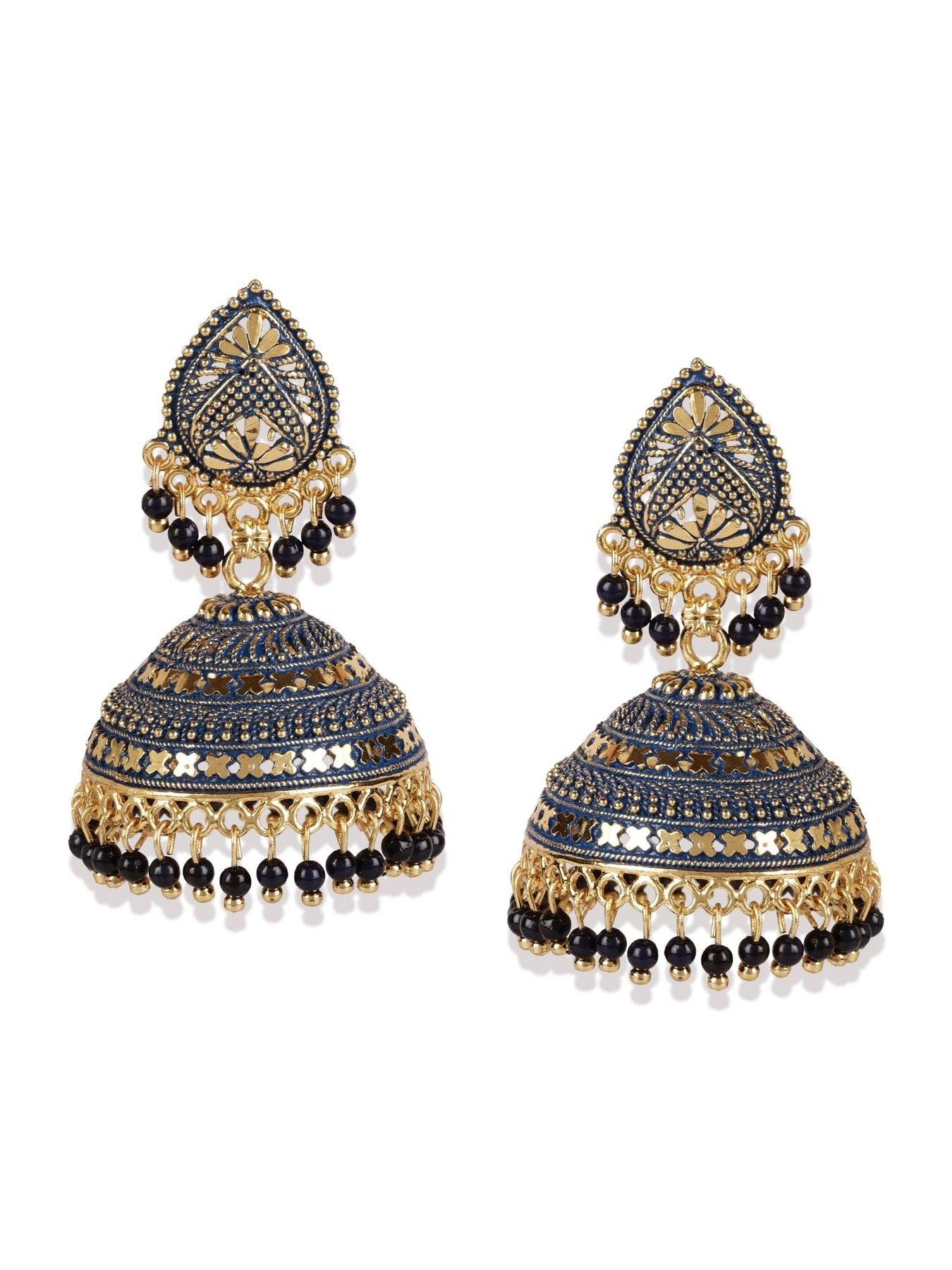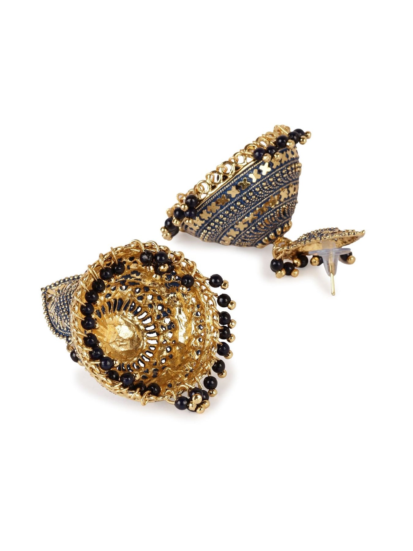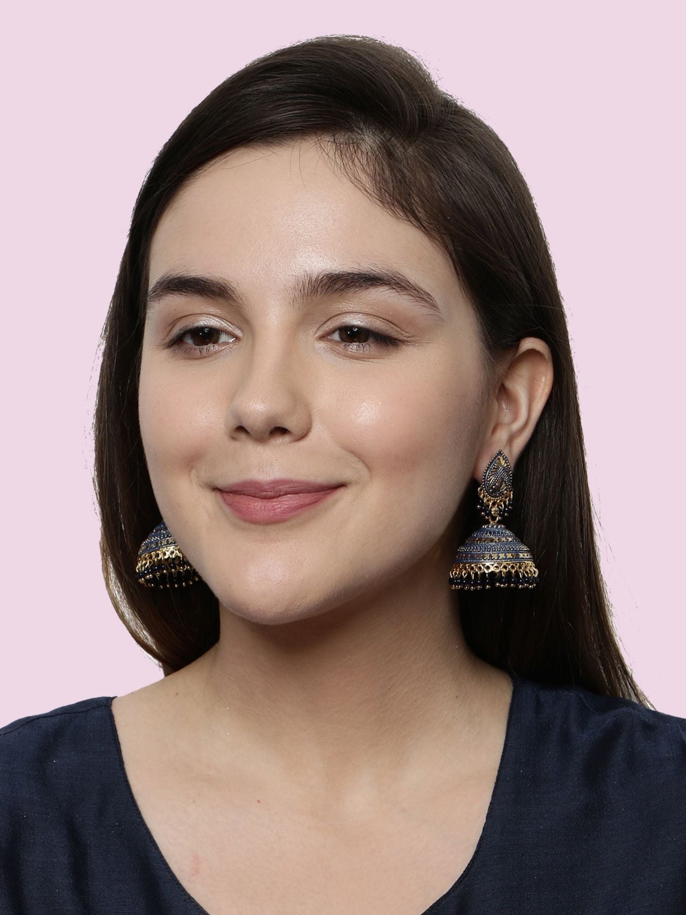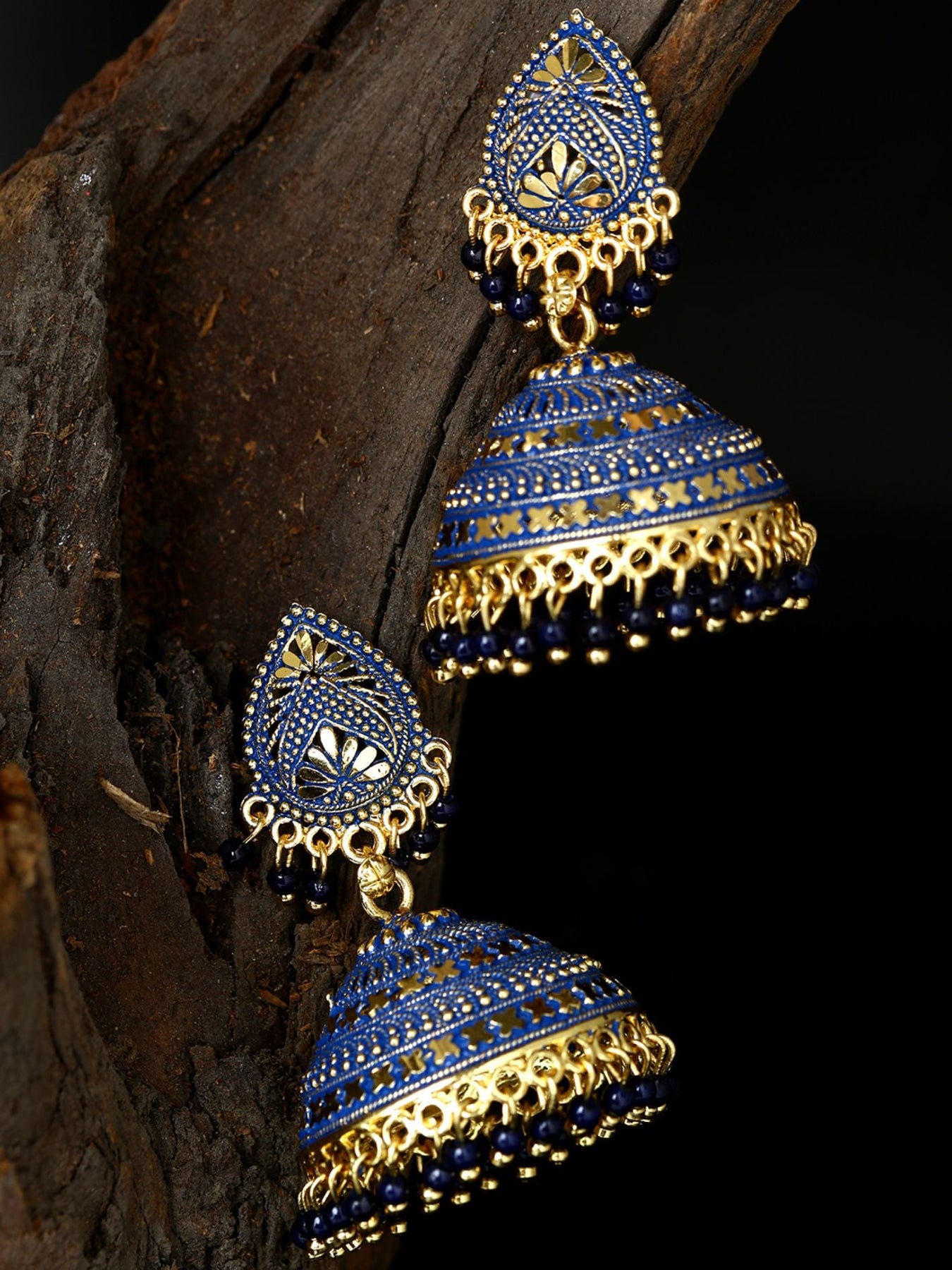 Gold Plated & Blue Enamelled Dome Shaped Jhumkas Secured With Post And Back Closure, Details: Enamelled