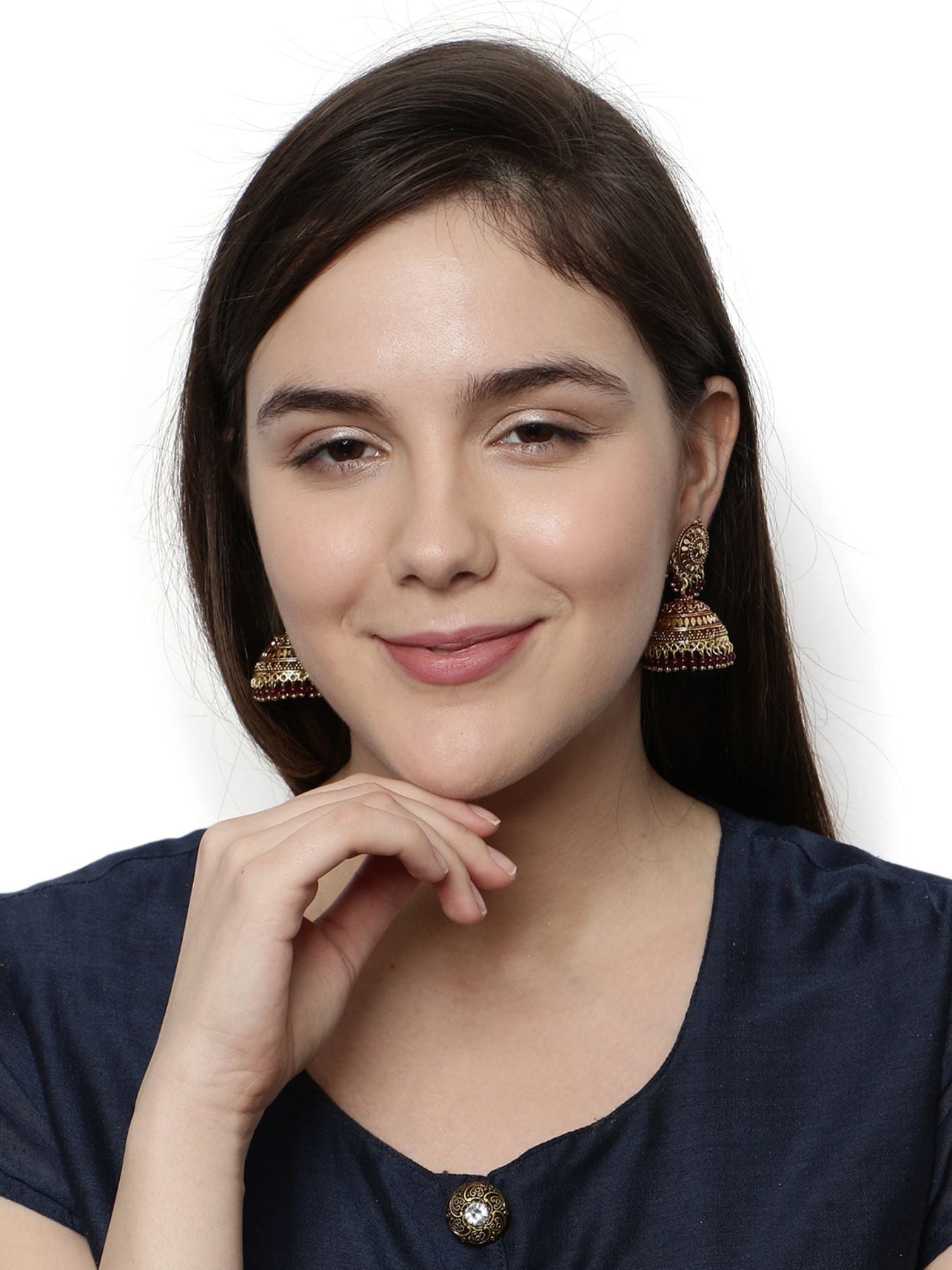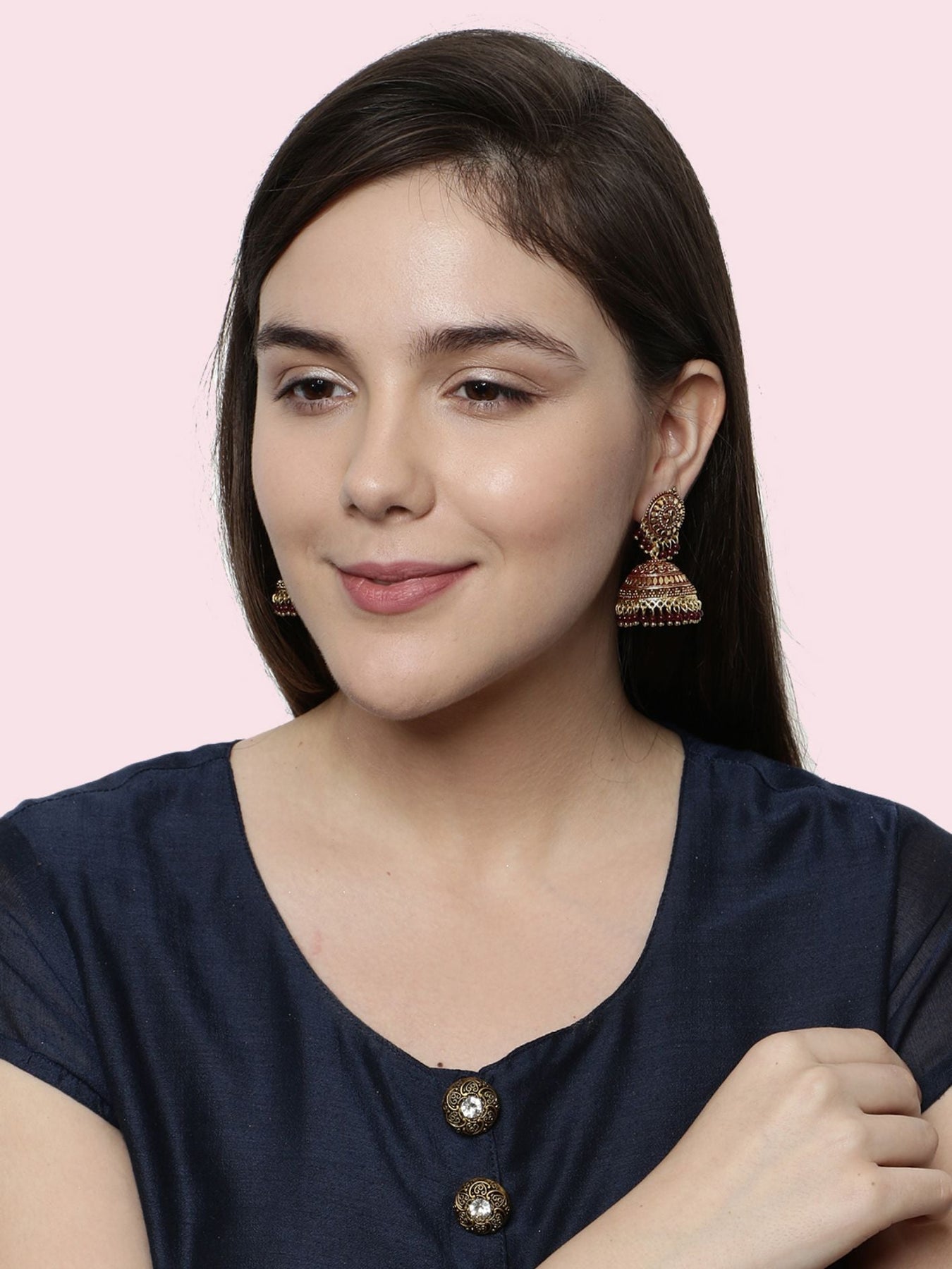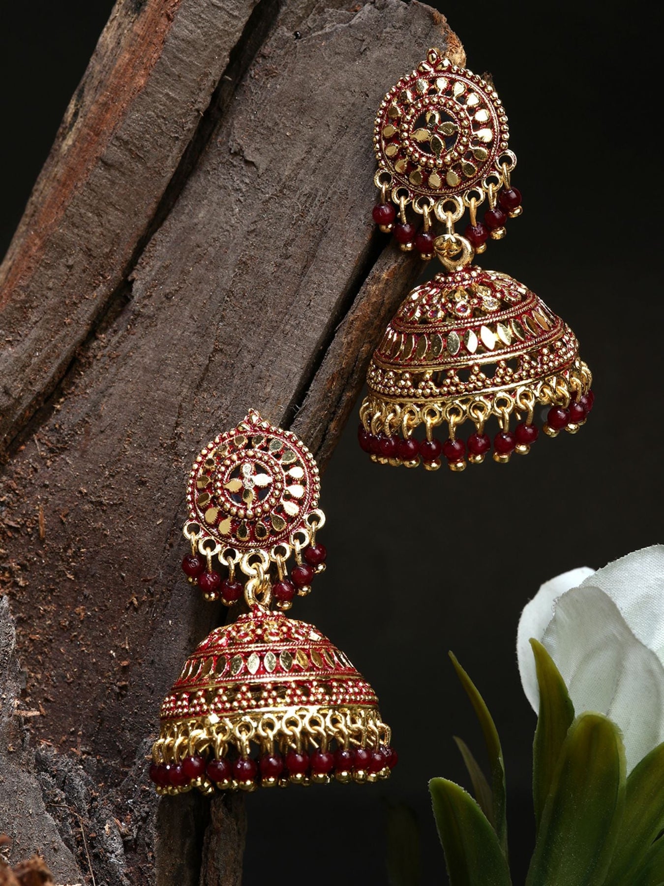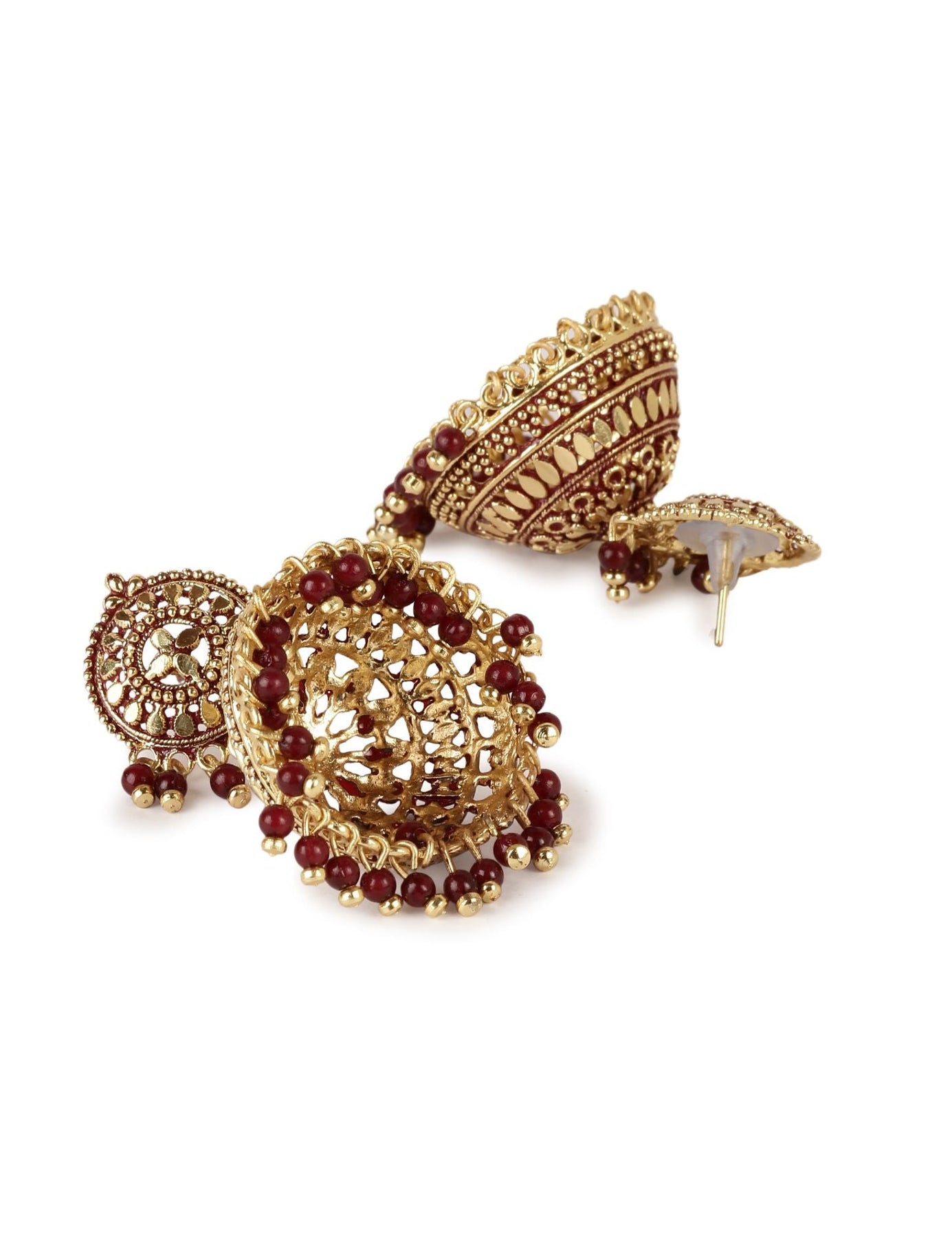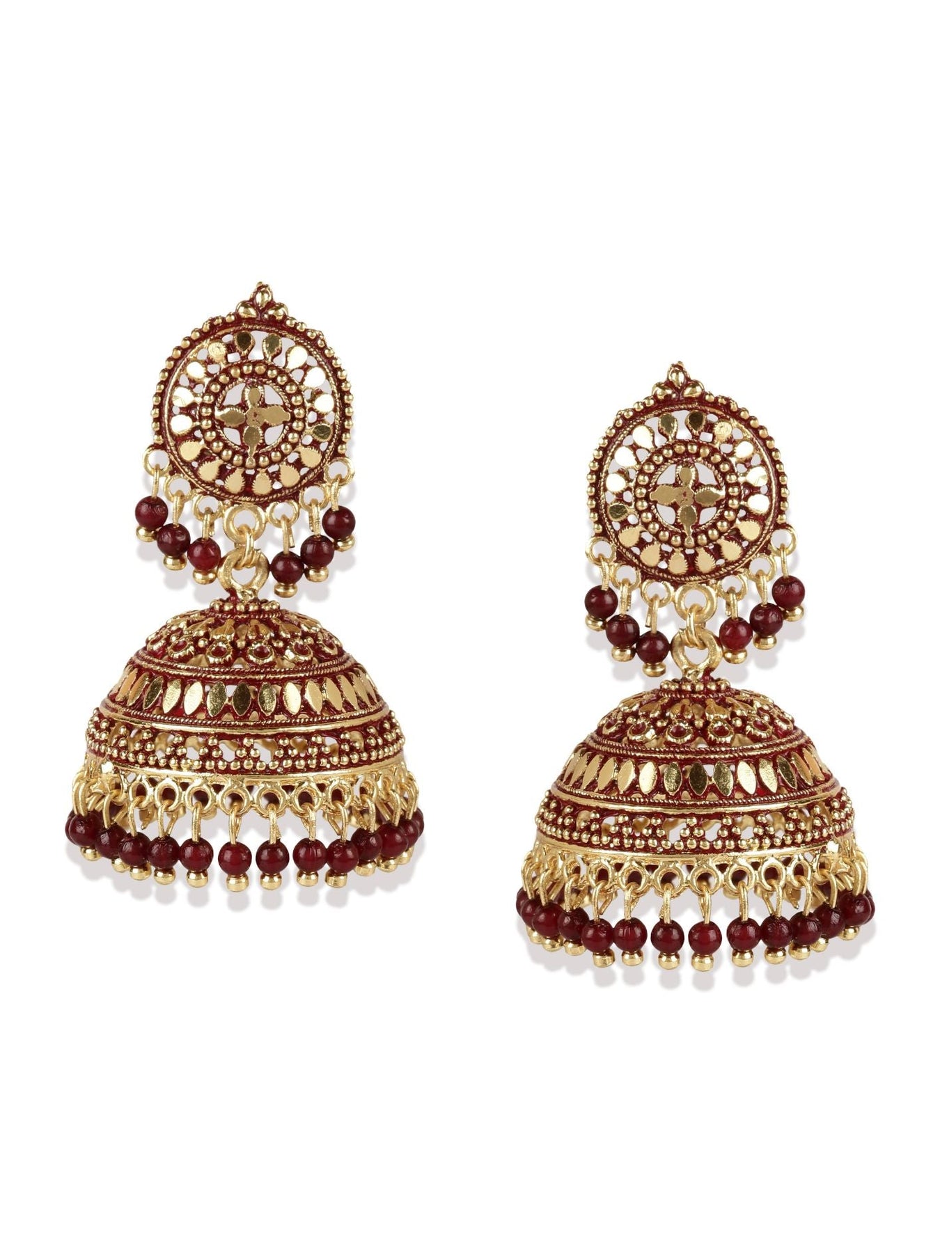 Gold Plated & Maroon Dome Shaped Enamelled Jhumkas Secured With Post And Back Closure, Details: Enamelled