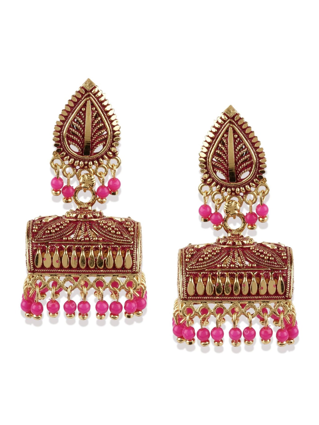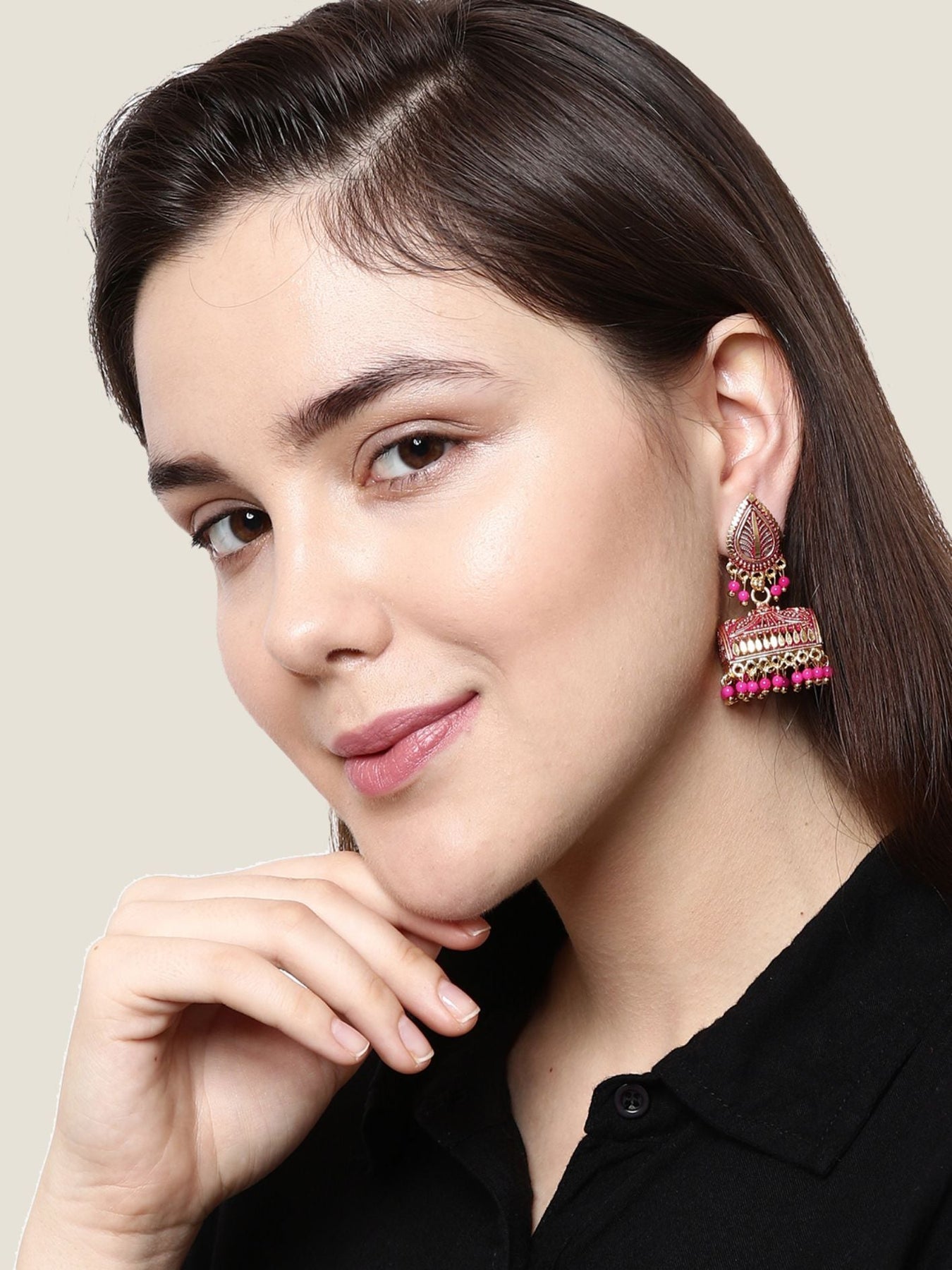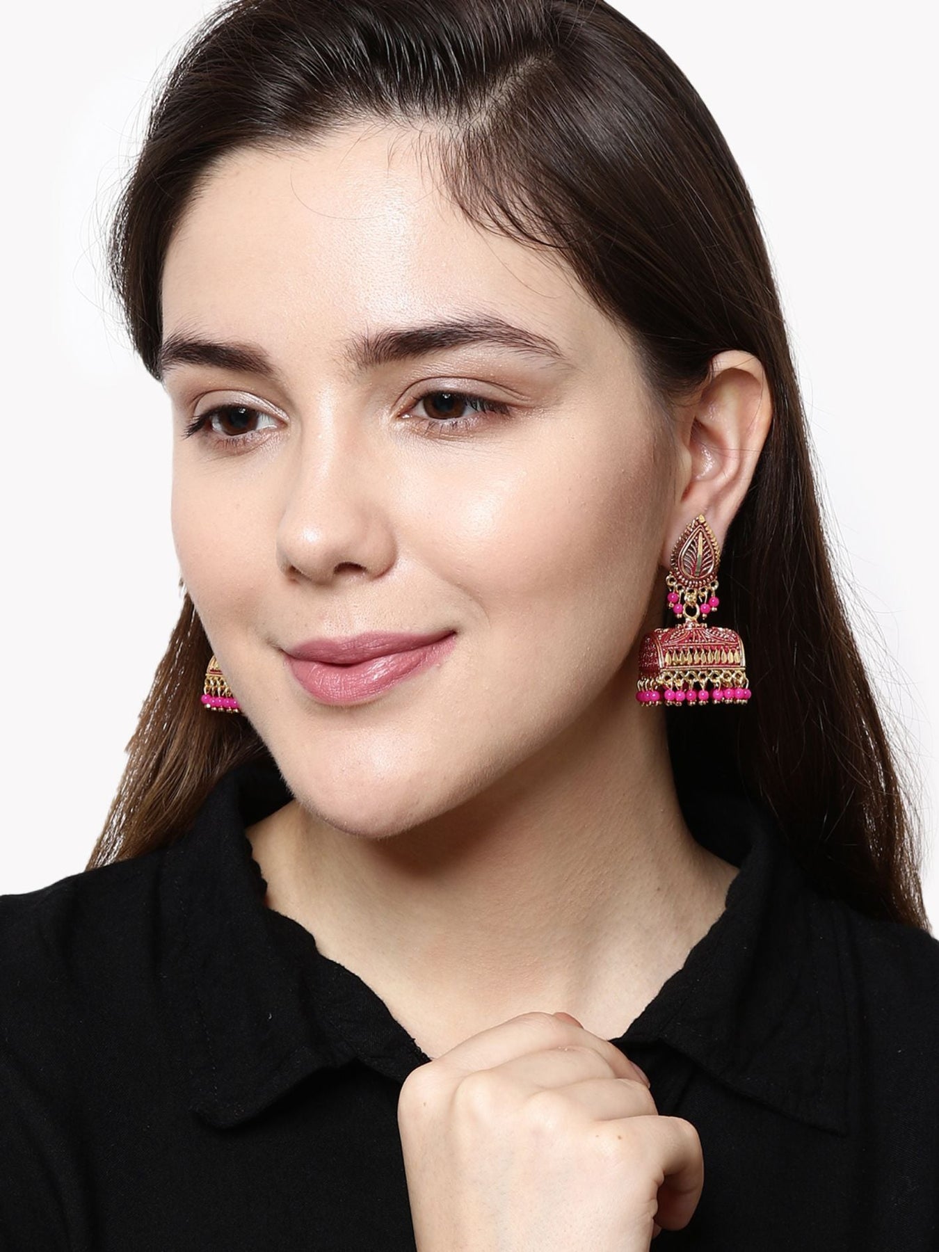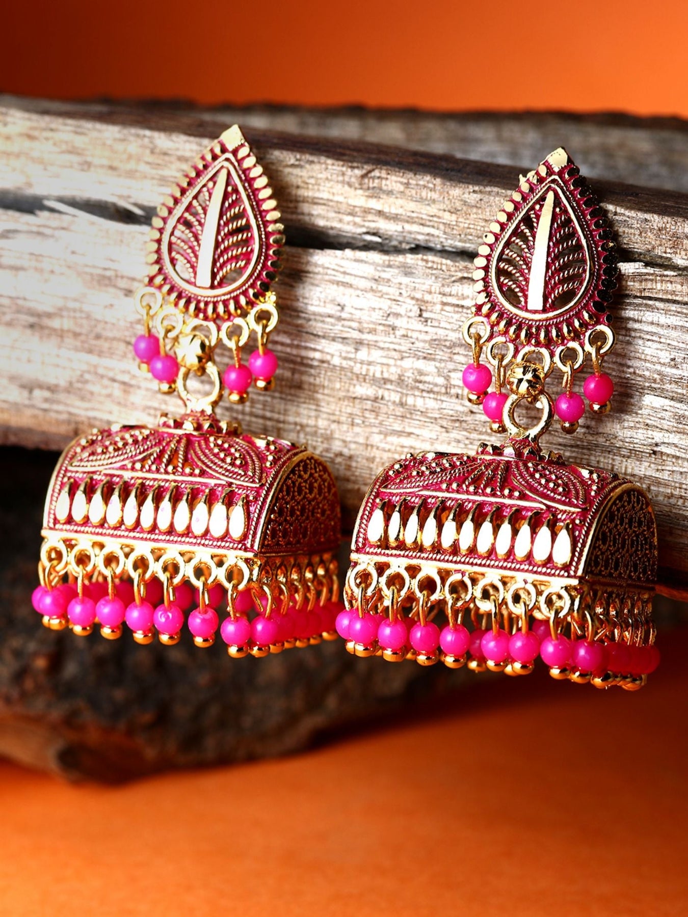 Gold Plated & Pink Leaf Shaped Enamelled Jhumkas Secured With Post And Back Closure, Details: Enamelled