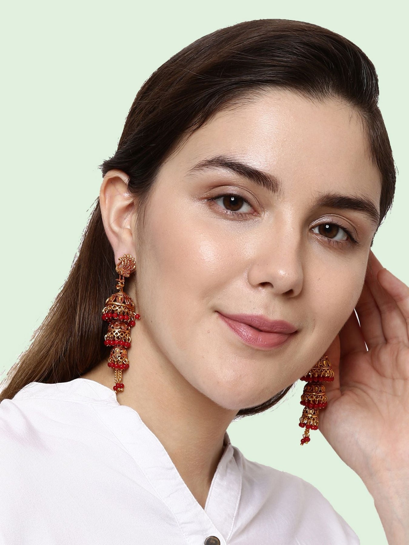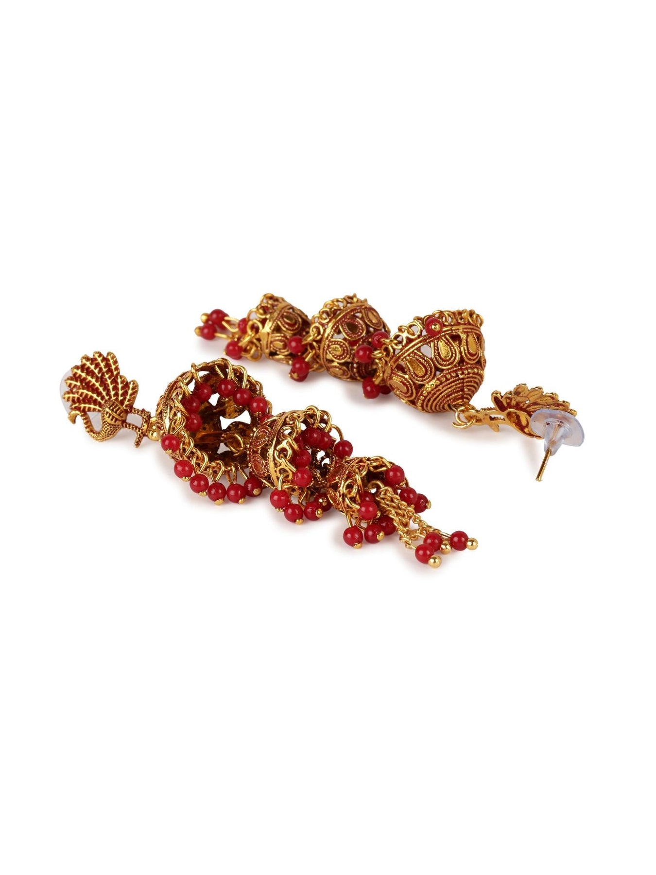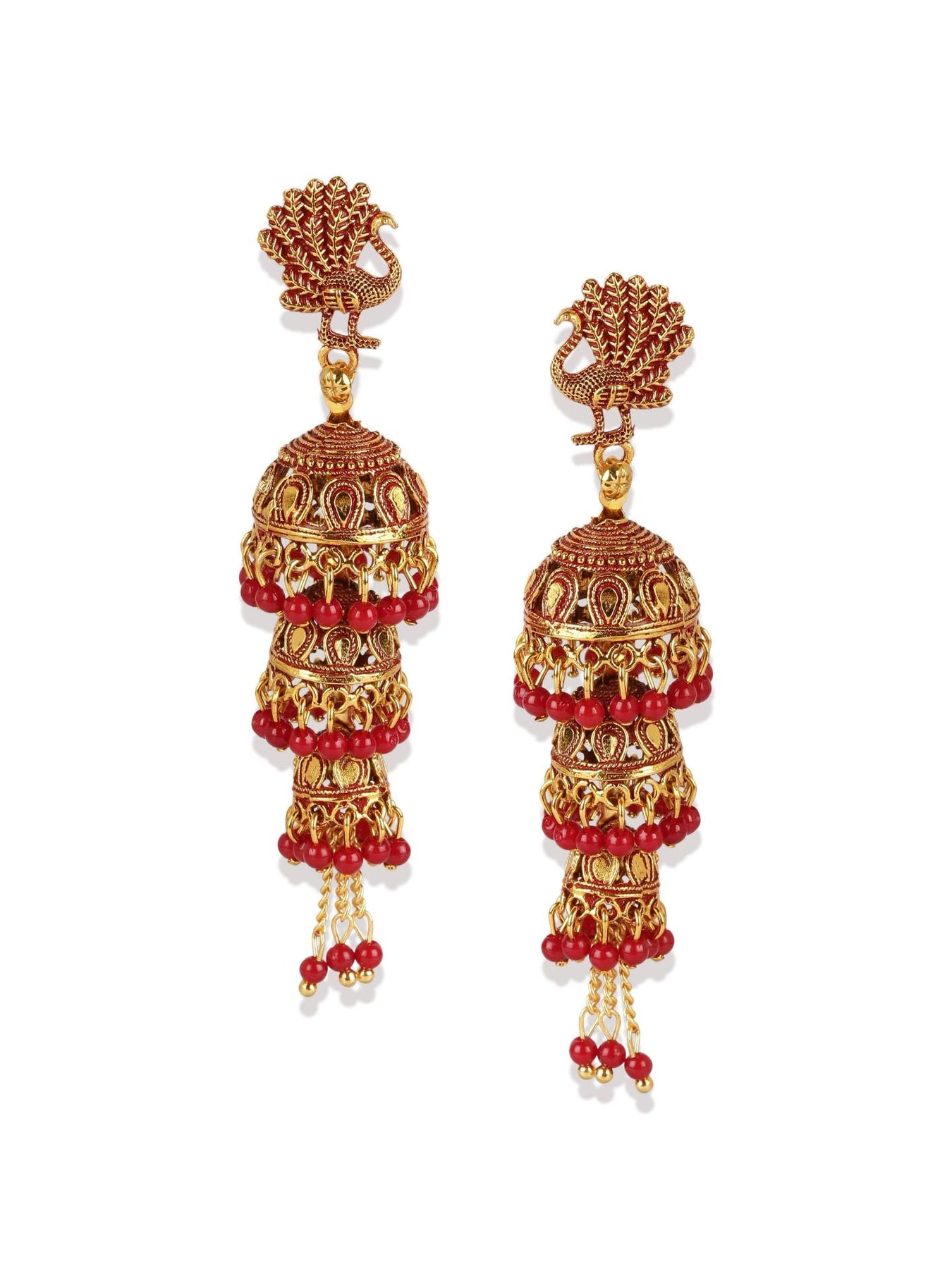 Women's Gold Plated & Red Enamelled Peacock Shaped Jhumkas