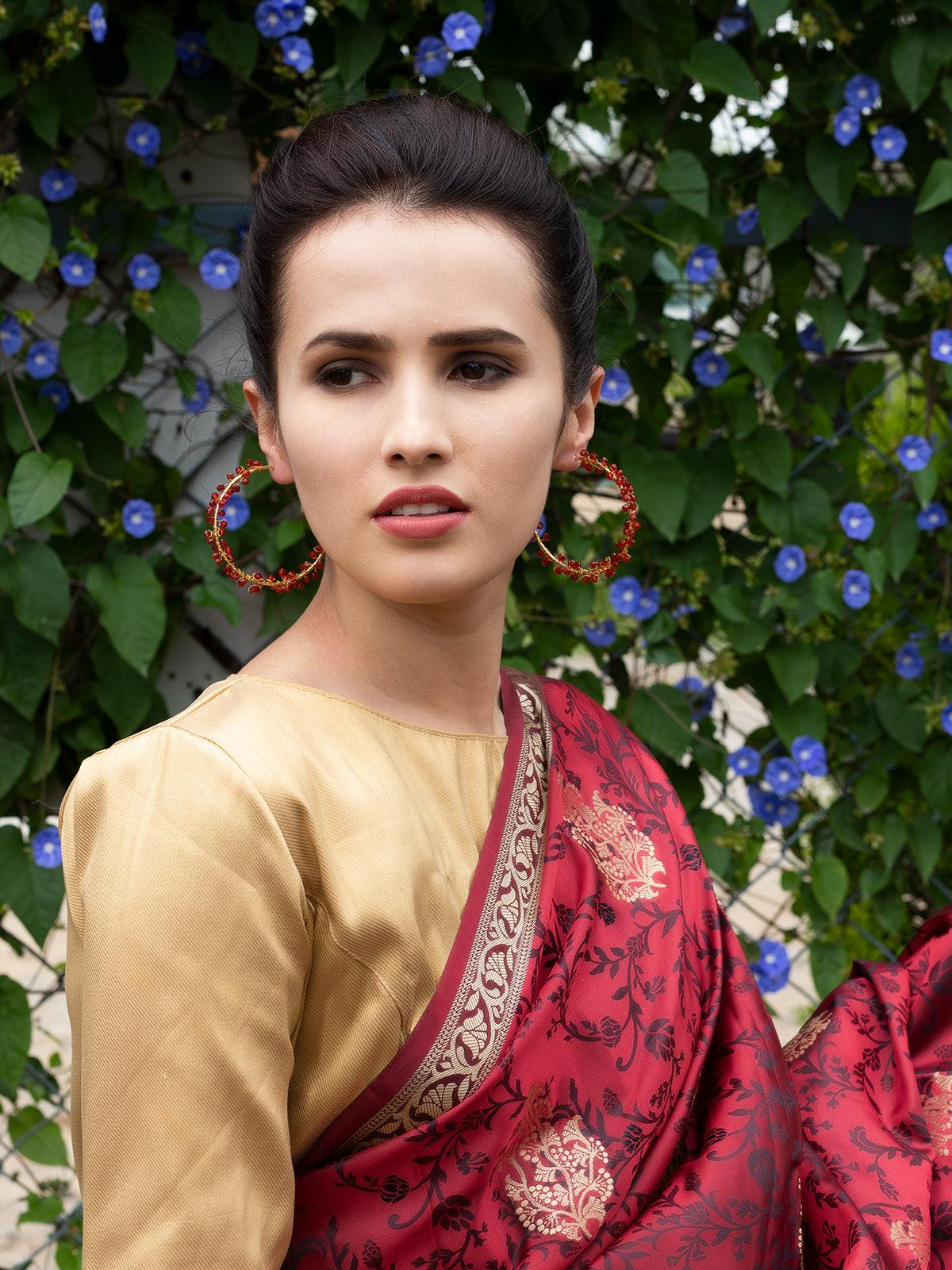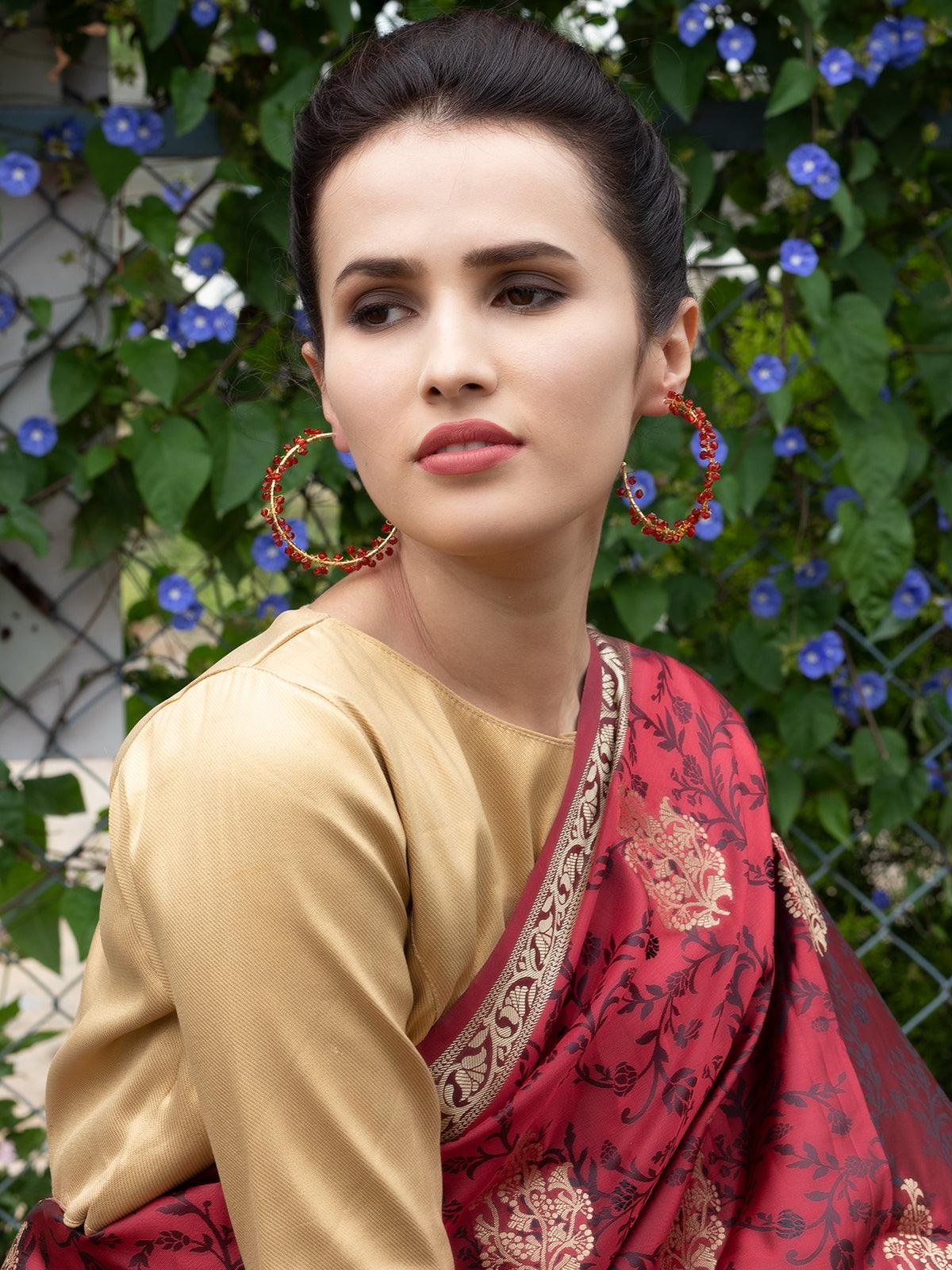 - These lightweight and chic earrings feature a gold hoop adorned with red beads that create a textured effect.