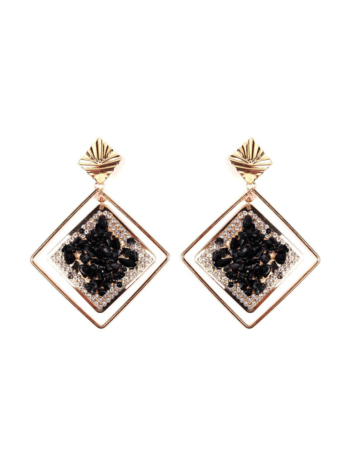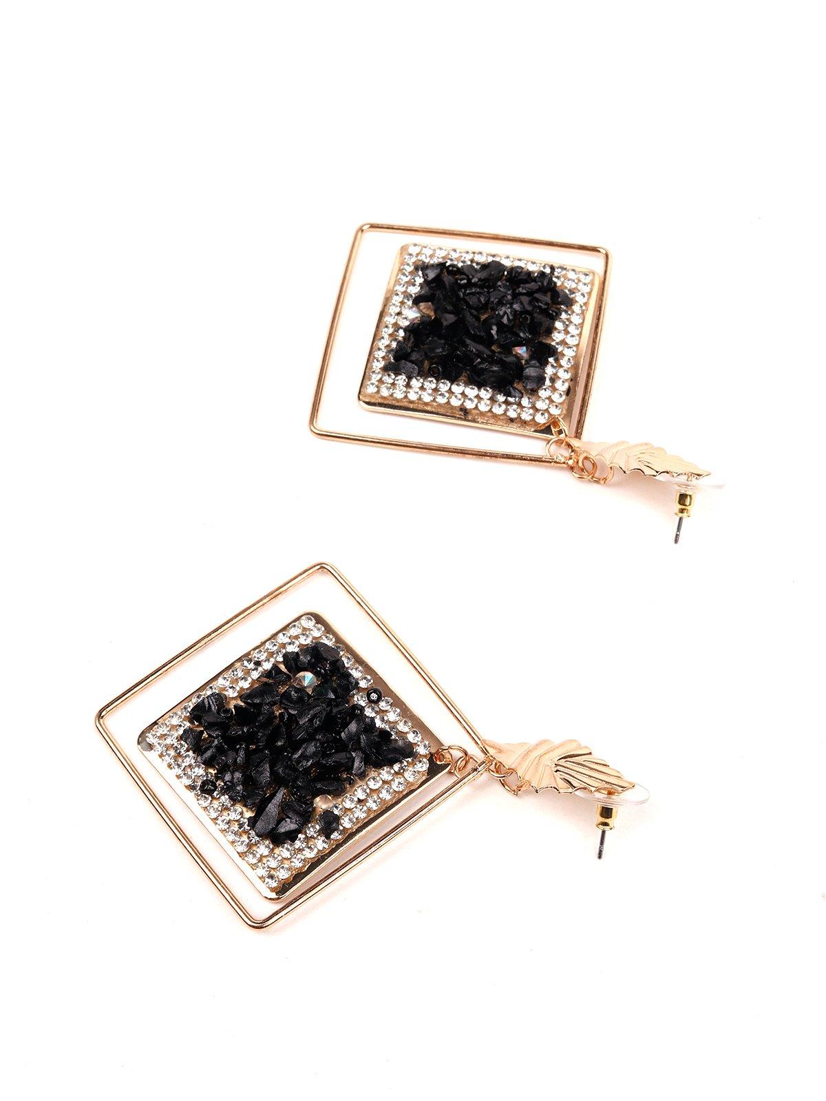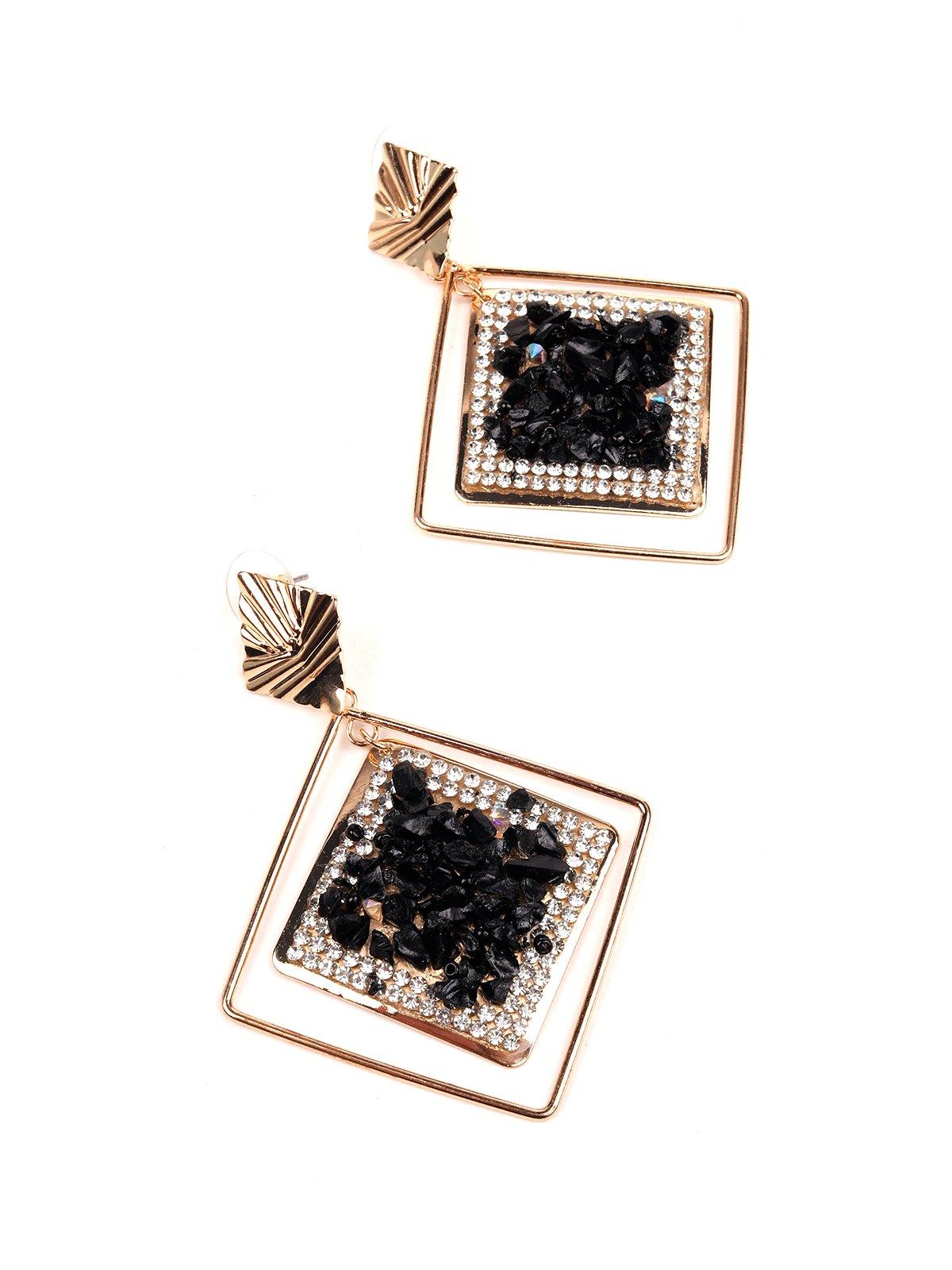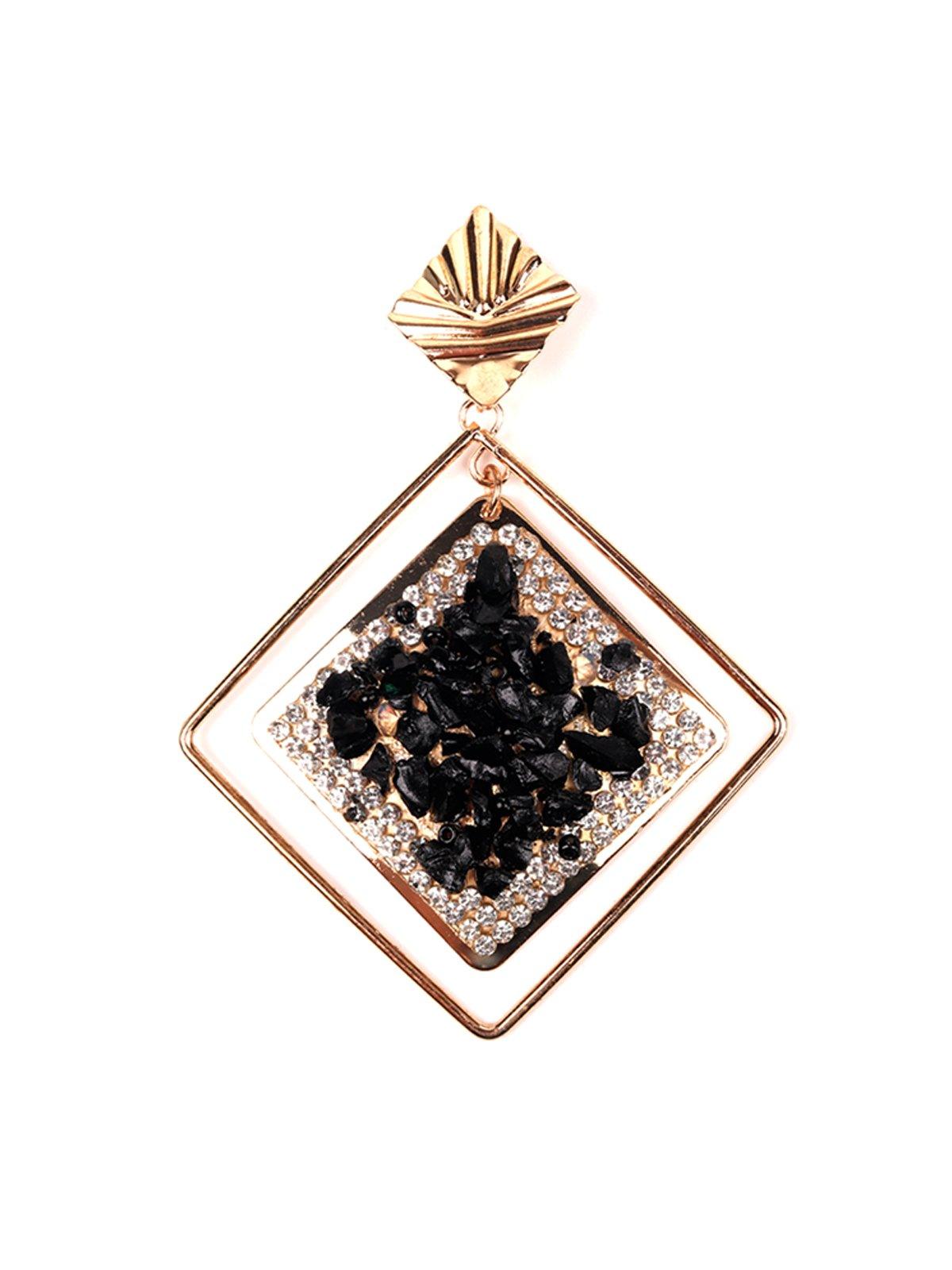 - Odette presents these stunning earrings that depict a gold-tone metal in a diamond frame in a diamond shape embellished with sparkling crystals and black uncut stones.