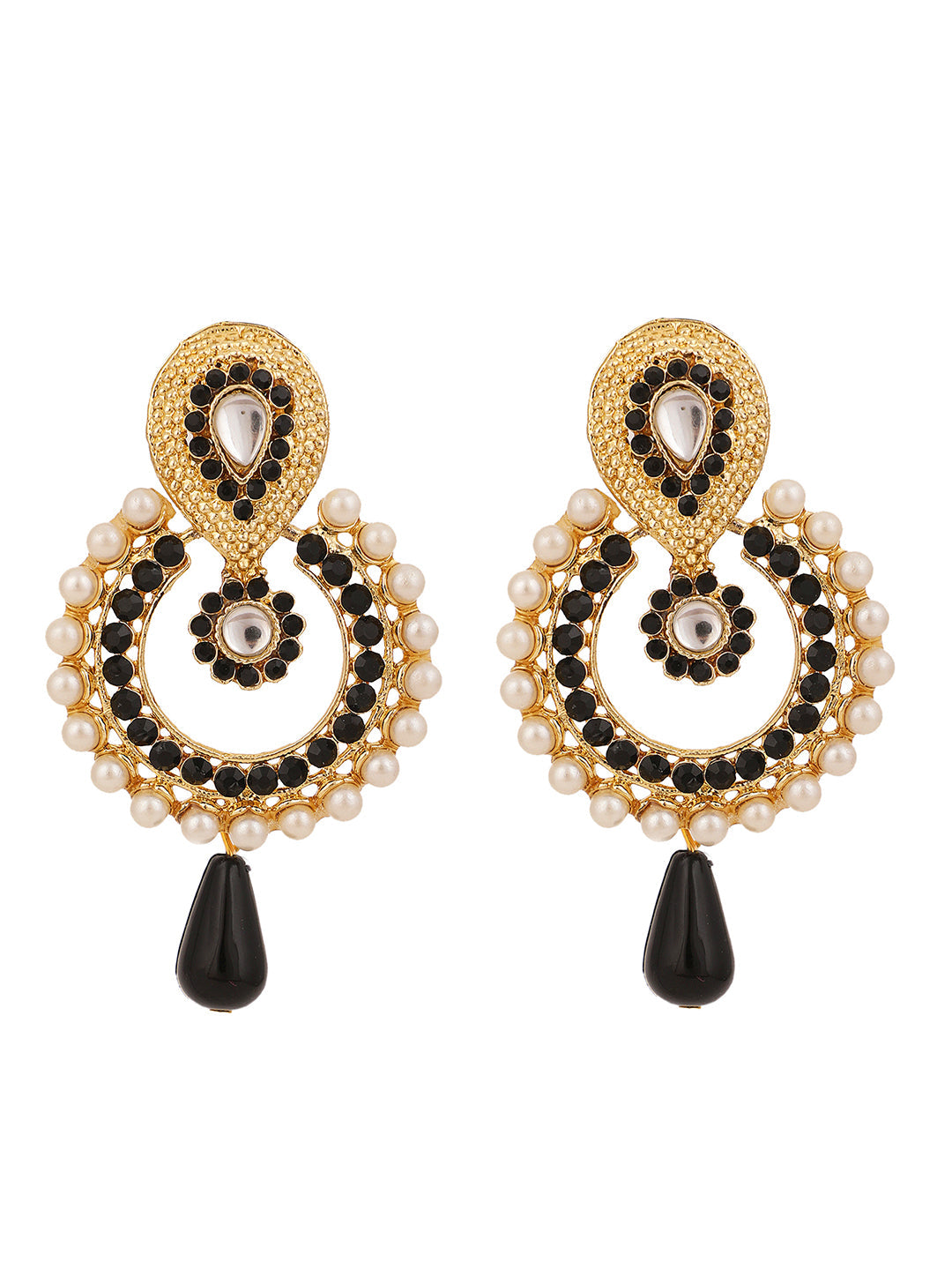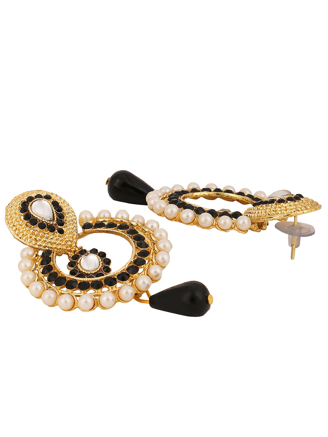 Stone and Pearl Studded Black Geometric shaped Chandbali Earring,Secured With Post and Back Closure