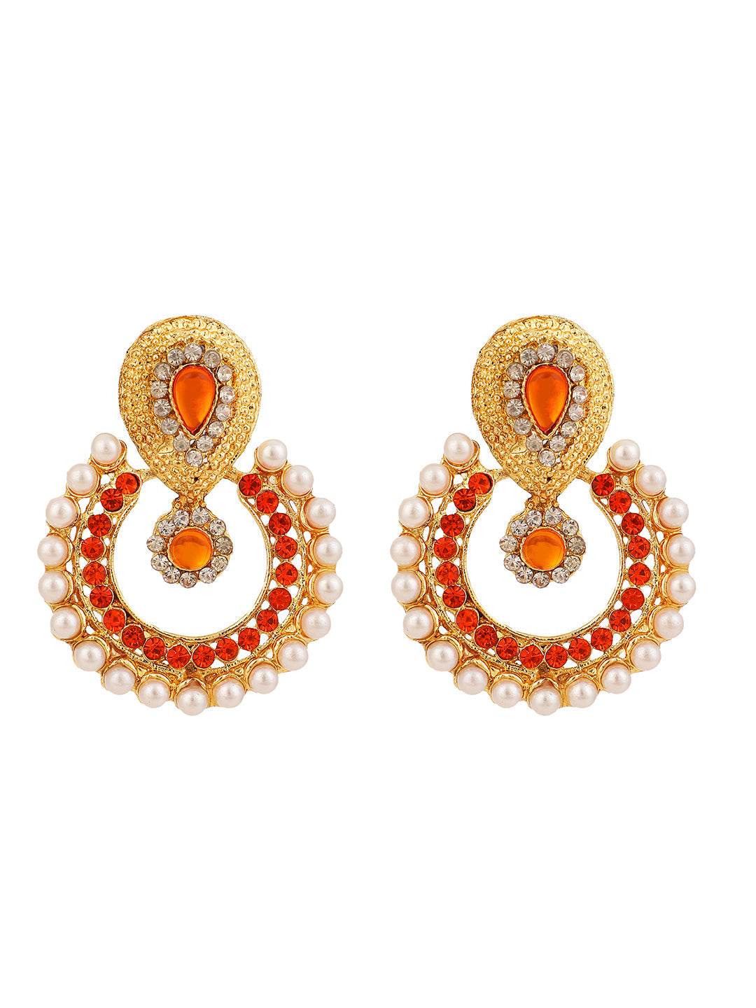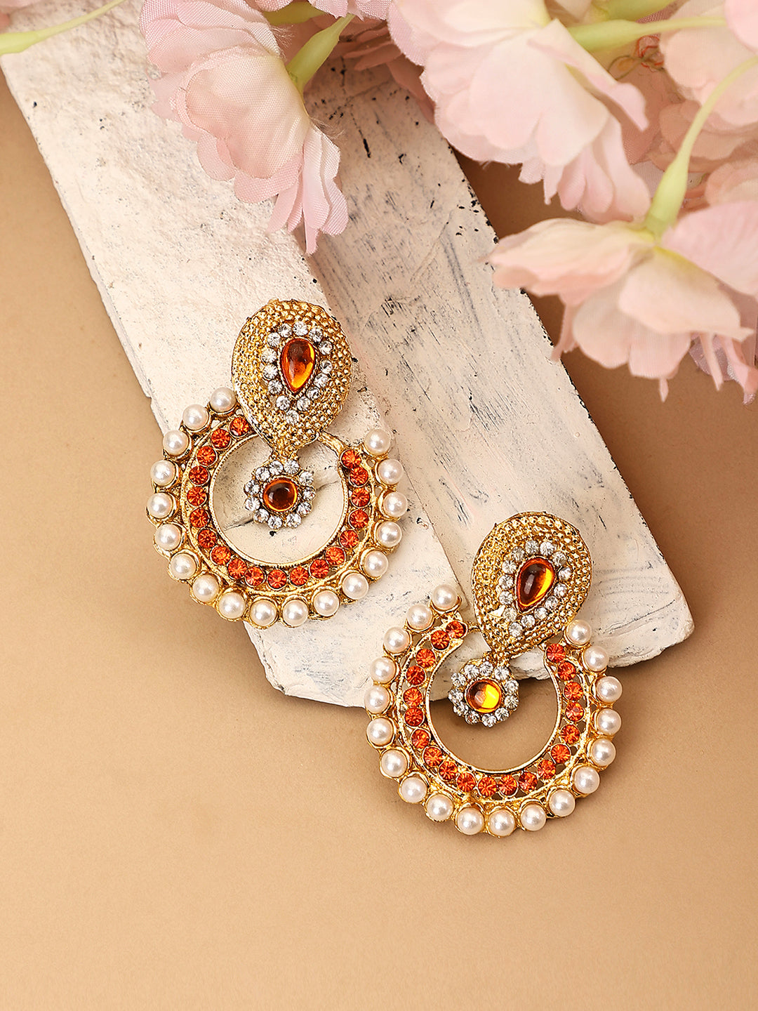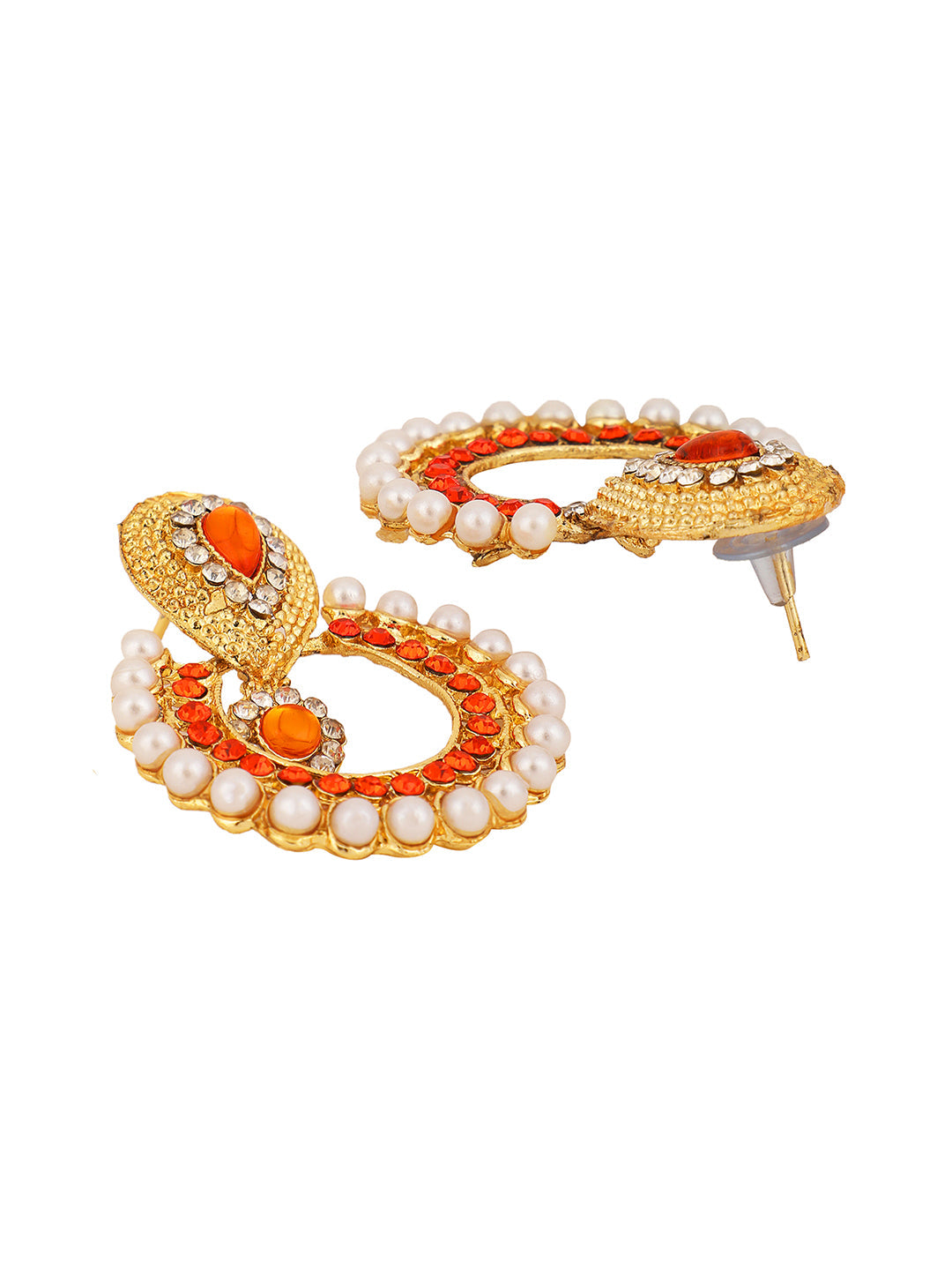 Women's Stone And Pearl Studded Orange Geometric Shaped Chandbali Earring