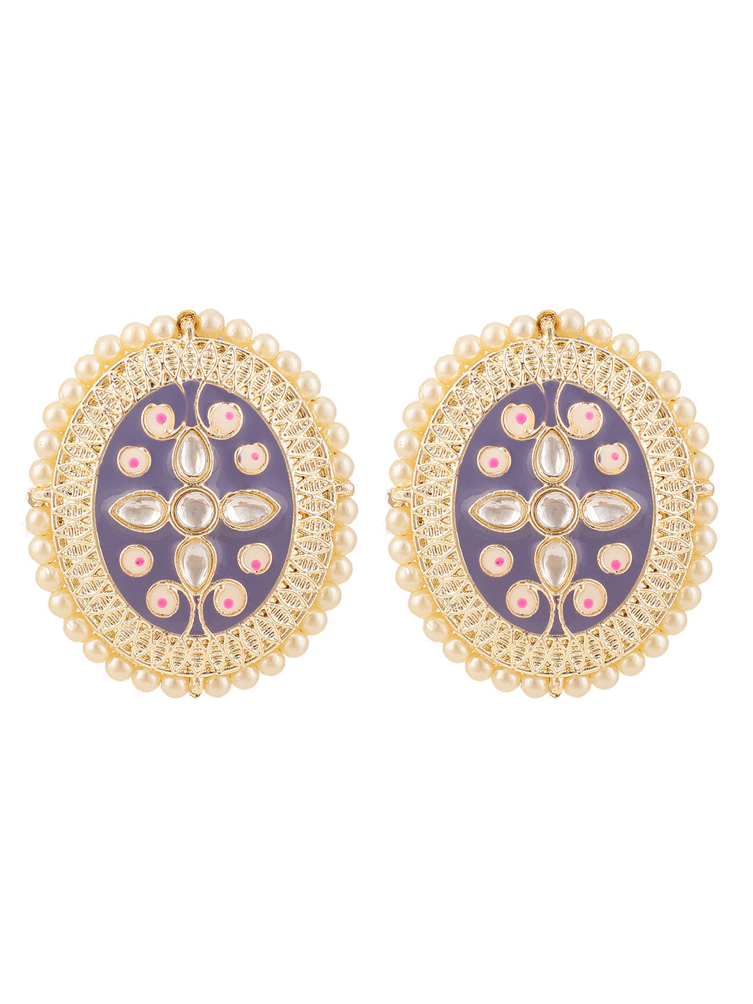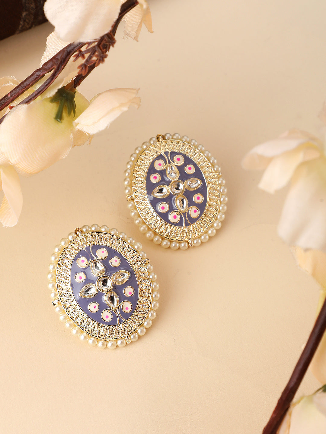 Trendy Enamelled Blue Tone Pearl and Stone Oval Shape Stud Earring,Secured With Post and Back Closure
