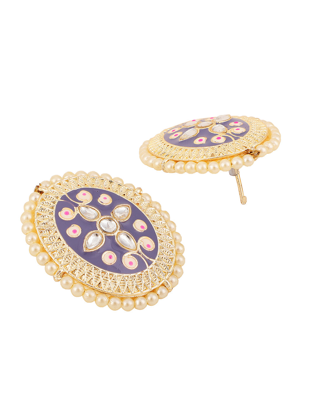 Women's Trendy Enamelled Blue Tone Pearl And Stone Oval Shape Stud Earring