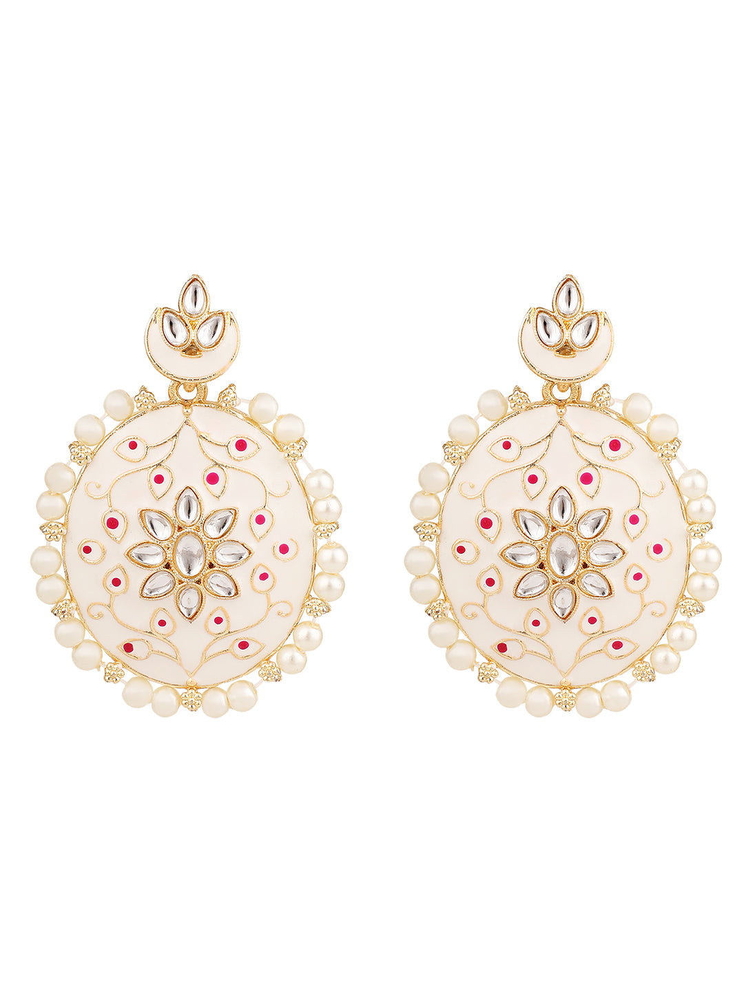 Traditonal Gold Plated Enameled White Colored Oval Shaped Pearl Layeed Choker Set with Earrings and Maangtikka SetWomen love jewellery; specially traditional jewellery adore a women. They wear it on different occasion. They have special importance on ring ceremony, wedding and festive time. They can also wear it on regular basics. Make your moment memorable with this range. This jewel set features a unique one of a kind traditional embellish with antic finish.
