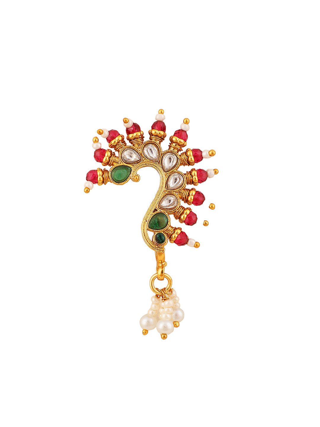 Indulge in the regal charm of our Traditional Gold-Plated Marathi Nathni adorned with vibrant colored stones. This exquisite nose ring, a quintessential piece of Indian jewelry, seamlessly marries tradition and elegance. The intricate design and dazzling stones evoke timeless grace, making it an ideal jewelry for women. Secured with a convenient clip-on closure, this nose pin not only enhances your cultural allure but also provides comfort and versatility for various occasions.