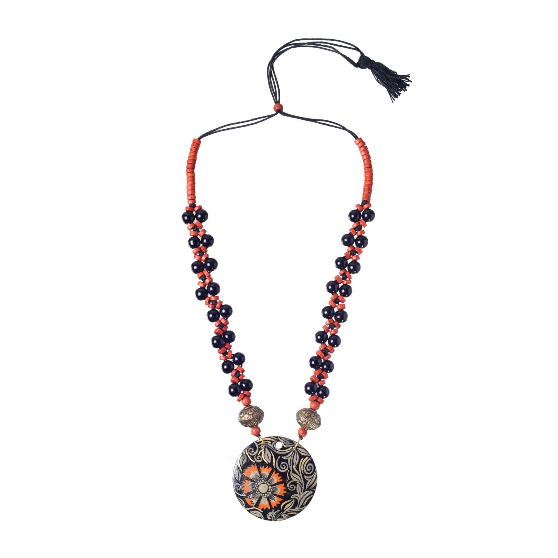 Adorn yourself with the Majestic Floral Elegance Necklace, featuring hand-painted majestic flowers on a wooden base, accentuated by orange wooden beads and black glass beads for a stunning contrast.