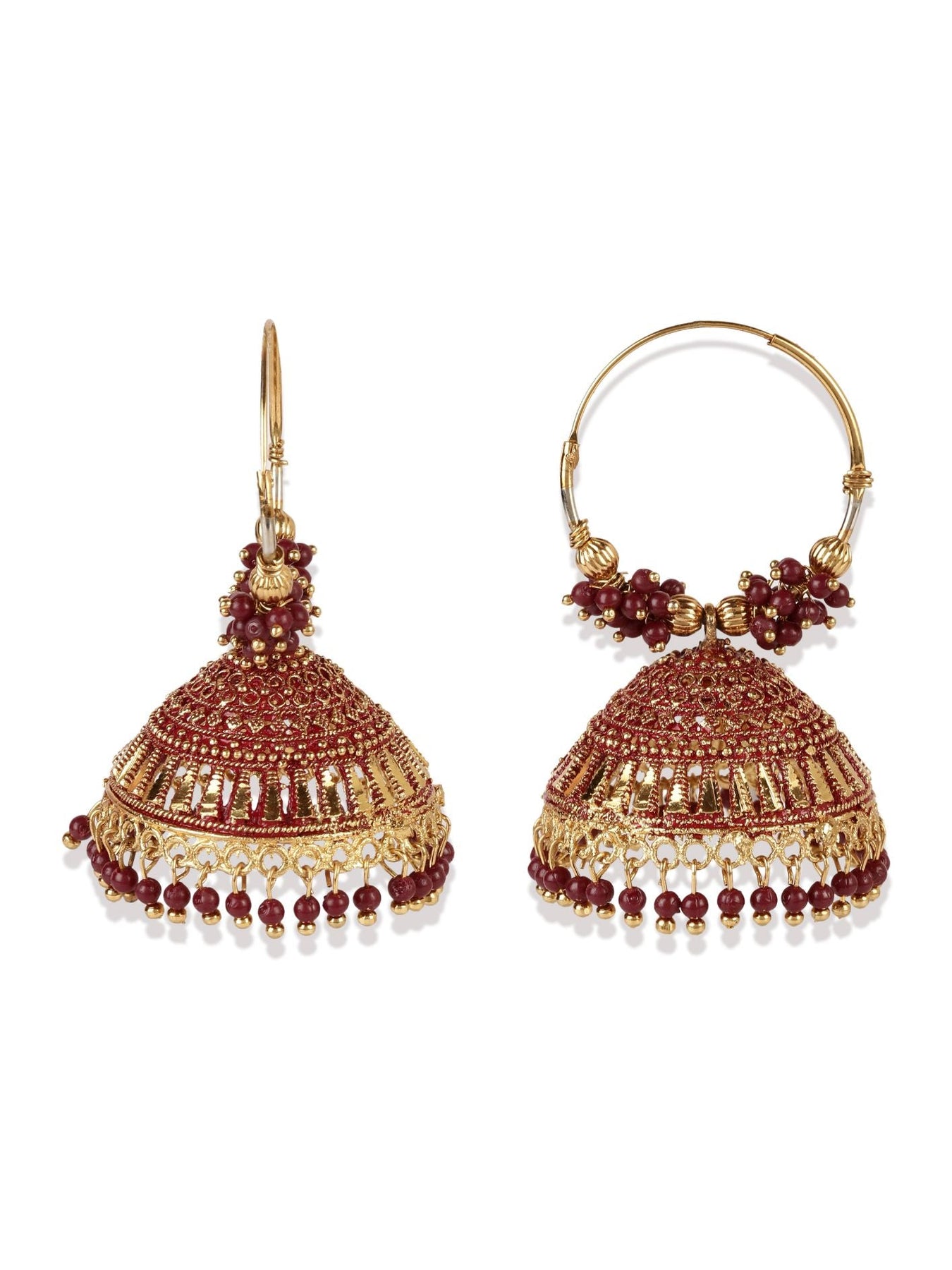 Maroon & Gold-Plated Enamelled Dome Shaped Jhumkas Secured With Lever Back Closure, Details: Enamelled