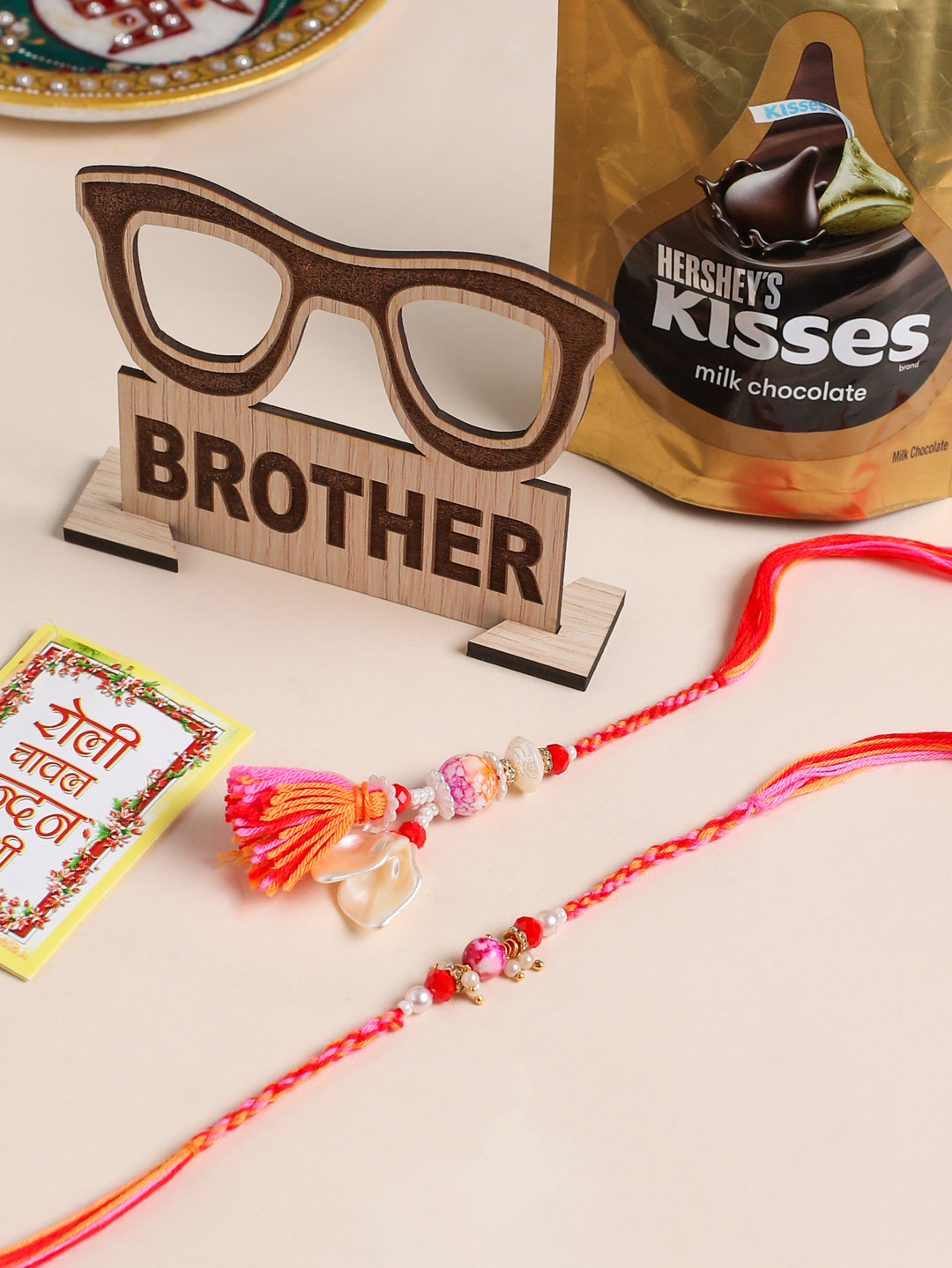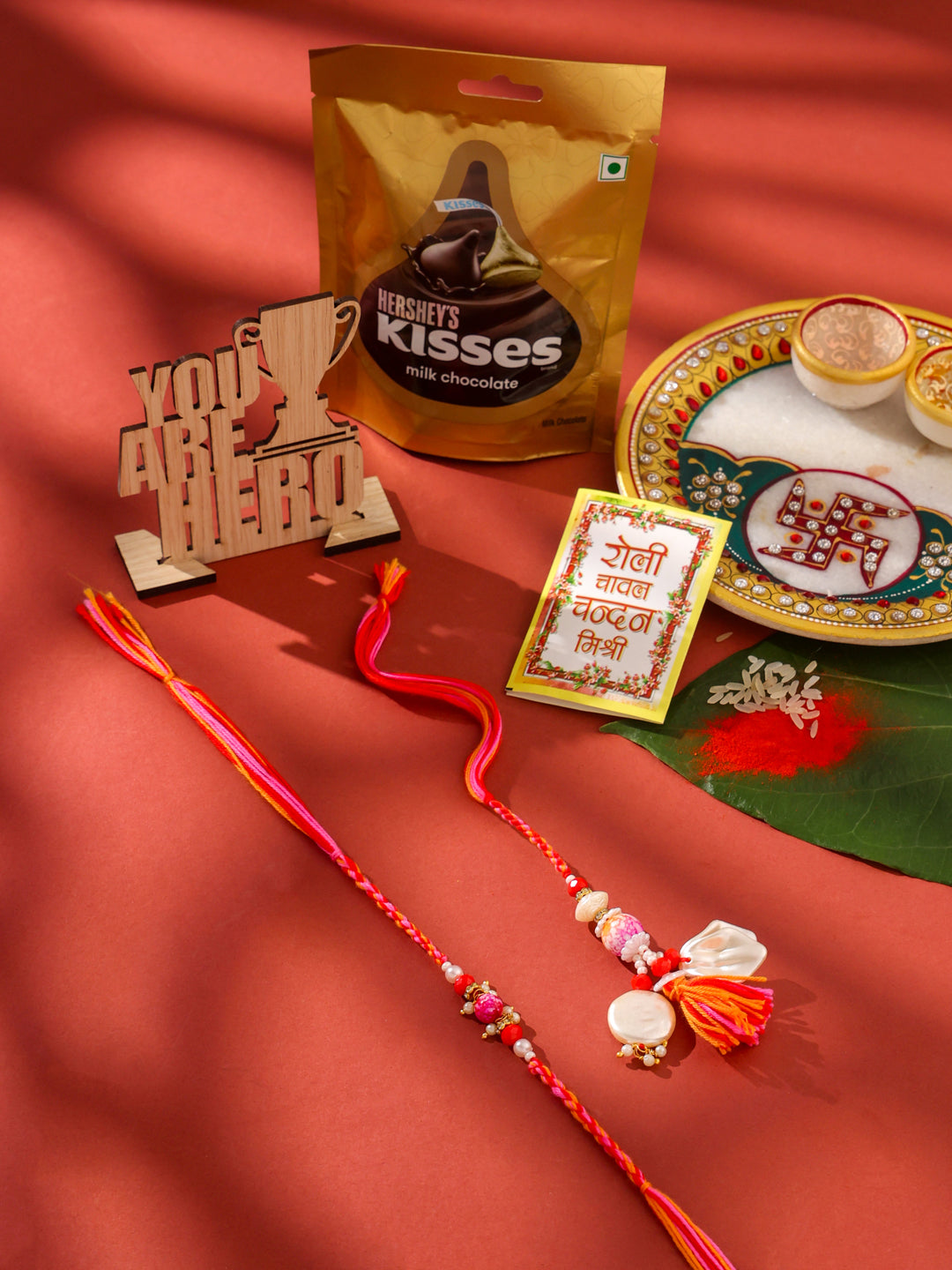 Style Note: Add A Touch Of Elegance And Festive Charm To Your Raksha Bandhan Celebrations With The Nvr Set Of 2 Multicolor Artificial Stones & Beads Bhaiya Bhabhi Rakhi. Designed To Celebrate The Unique Bond Between Siblings And Their Spouses, This Set Includes One Rakhi For Bhaiya And One For Bhabhi, Each Beautifully Adorned With Artificial Stones And Beads. The Intricate Design Combines Traditional Symbolism With A Modern Aesthetic, Making It A Perfect Choice For Those Who Want To Make This Raksha Bandhan Extra Special. The Adjustable Threads Ensure A Comfortable Fit For All Wrist Sizes, While The Inclusion Of Roli, Chawal, Chandan, Mishri With Assorted Mdf Wooden Stand & 33.6 Gm Hershey'S Kisses Chocolate Adds Authenticity To Your Rakhi Ceremony. This Set Is A Heartfelt And Stylish Gift, Ideal For Expressing Love, Blessings, And Protection For Both Your Brother And Sister-In-Law.