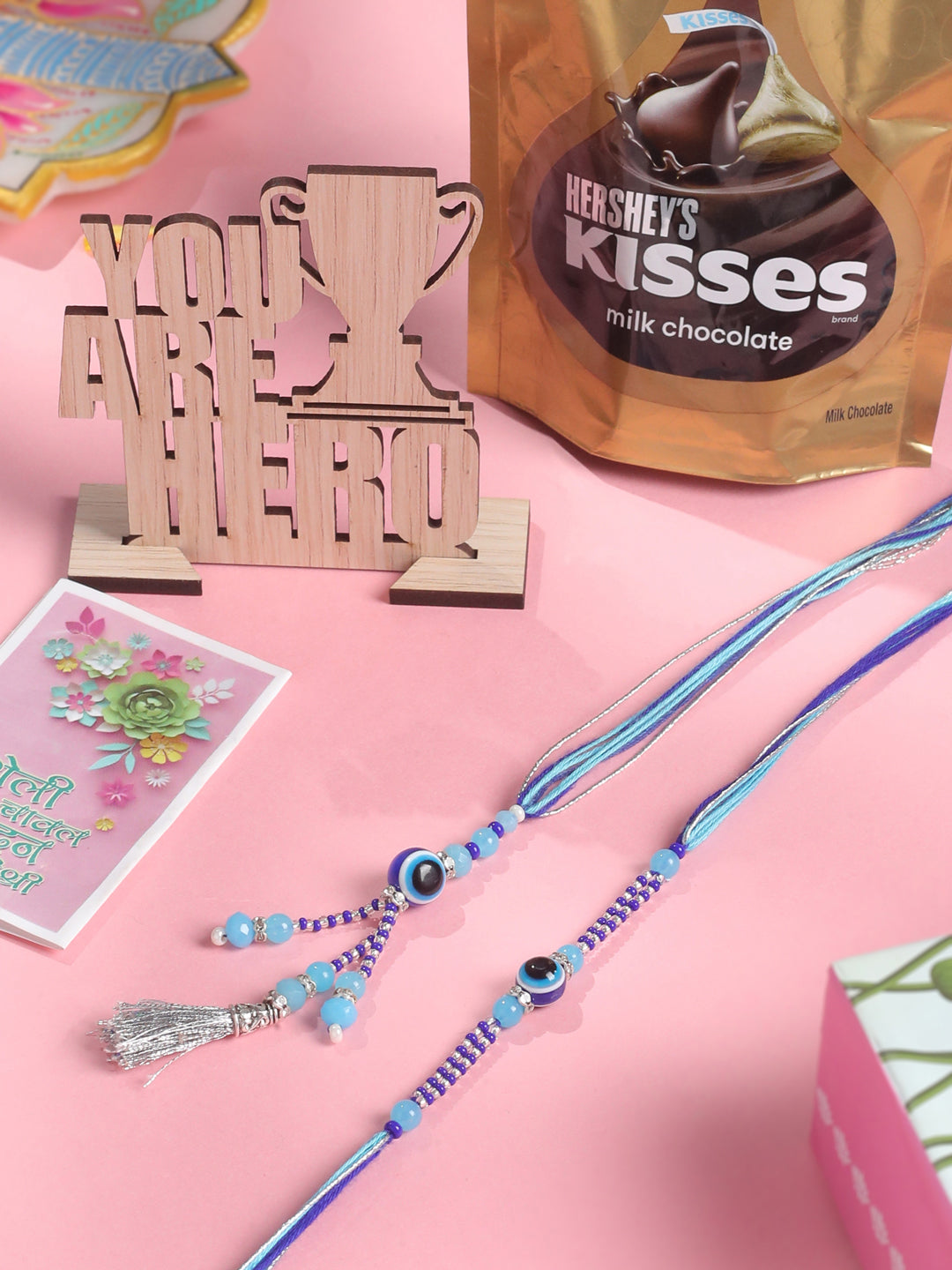 Style Note: Infuse Your Raksha Bandhan Celebration With Protection And Vibrant Charm With The Nvr Set Of 2 Blue Evil Eye Artificial Beads Bhaiya Bhabhi Rakhi. Featuring The Powerful Evil Eye Symbol, These Rakhis Are Designed To Safeguard Your Loved Ones From Negative Energy While Adding A Modern Touch To The Traditional Celebration. The Artificial Beads Bring A Calm, Yet Striking Appeal, Making These Rakhis Both Meaningful And Stylish. The Set Includes One Rakhi For Bhaiya And One For Bhabhi, Making It A Perfect Way To Honor The Special Bond Between Siblings And Their Spouses. With The Included Roli, Chawal, Chandan, Mishri With Assorted Mdf Wooden Stand & 33.6 Gm Hershey'S Kisses Chocolate, You Can Perform The Traditional Raksha Bandhan Rituals With Love And Authenticity. This Thoughtful And Trendy Set Is A Perfect Gift To Wish Your Brother And Sister-In-Law Protection, Prosperity, And Happiness On This Special Occasion.