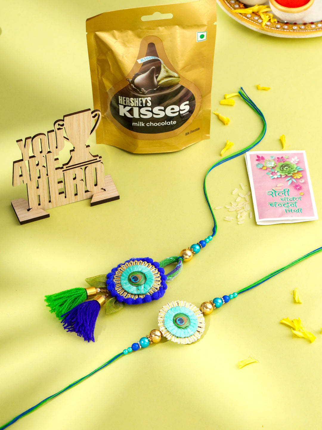 Style Note: Celebrate The Festive Spirit Of Raksha Bandhan With The Nvr Set Of 2 Multicolor Artificial Beads Bhaiya Bhabhi Rakhi. This Set Includes One Rakhi For Bhaiya And One For Bhabhi, Both Beautifully Adorned With Artificial Beads, Making Them The Perfect Blend Of Tradition And Modern Elegance. The Multicolor Design Reflects Joy And Love, Adding A Playful Yet Meaningful Touch To The Occasion. Each Rakhi Is Carefully Crafted To Symbolize The Bond Of Protection, Affection, And Blessings Shared Between Siblings And Their Spouses. With The Included Roli, Chawal, Chandan, Mishri With Assorted Mdf Wooden Stand & 33.6 Gm Hershey'S Kisses Chocolate, This Set Ensures You Can Perform The Traditional Raksha Bandhan Rituals With Authenticity And Warmth. Thoughtful, Festive, And Full Of Love, This Set Makes For A Perfect Rakhi Gift For Your Brother And Sister-In-Law.
