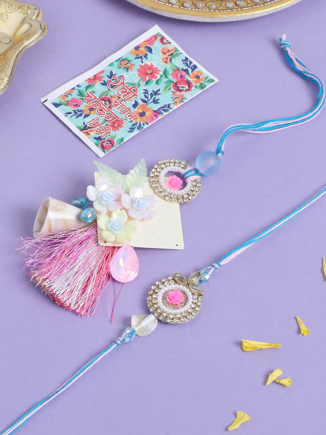 Style Note: Celebrate The Joyous Occasion Of Raksha Bandhan With The Nvr Set Of 2 Multicolor Artificial Stones & Beads Floral Design Rakhis For Bhaiya And Bhabhi. These Rakhis Are Beautifully Crafted With Artificial Stones And Beads, Adding A Festive And Elegant Touch. The Intricate Floral Design Symbolizes Love, Care, And Blessings For Both Your Brother And Sister-In-Law. Complete With Roli, Chawal, Chandan & Mishri, This Set Ensures A Traditional And Heartfelt Celebration. Thoughtfully Designed To Reflect The Essence Of Raksha Bandhan, This Set Is The Perfect Gift. Make Your Celebration Special With These Charming And Meaningful Rakhis.