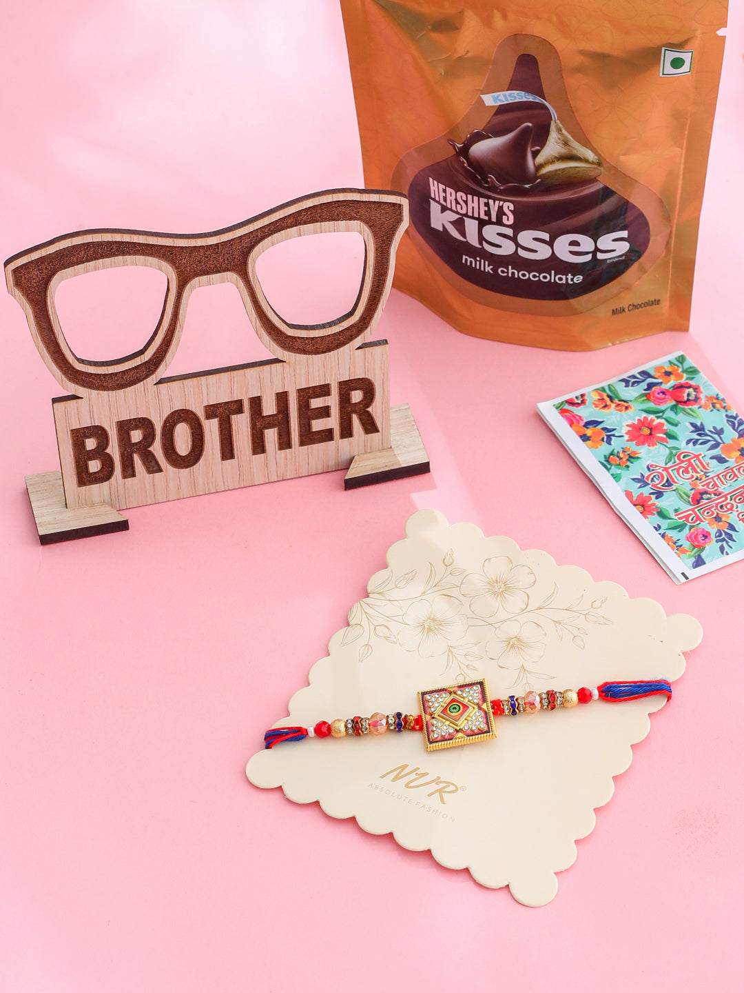 Style Note: Celebrate The Festive Occasion Of Raksha Bandhan With The Nvr Men Multicolor Artificial Stones Thread Rakhi. Featuring Artificial Stones, This Rakhi Adds A Joyful And Colorful Touch To Your Celebration. Designed To Symbolize Love, Care, And Protection For Your Bhaiya, It’S Perfect For This Special Occasion. The Adjustable Thread Ensures A Comfortable Fit For All Wrist Sizes. Complete With Roli, Chawal, Chandan, Mishri With Assorted Mdf Wooden Stand & 33.6 Gm Hershey'S Kisses Chocolate, This Rakhi Set Allows You To Perform The Traditional Raksha Bandhan Rituals. A Beautiful And Meaningful Gift To Convey Your Blessings And Affection.