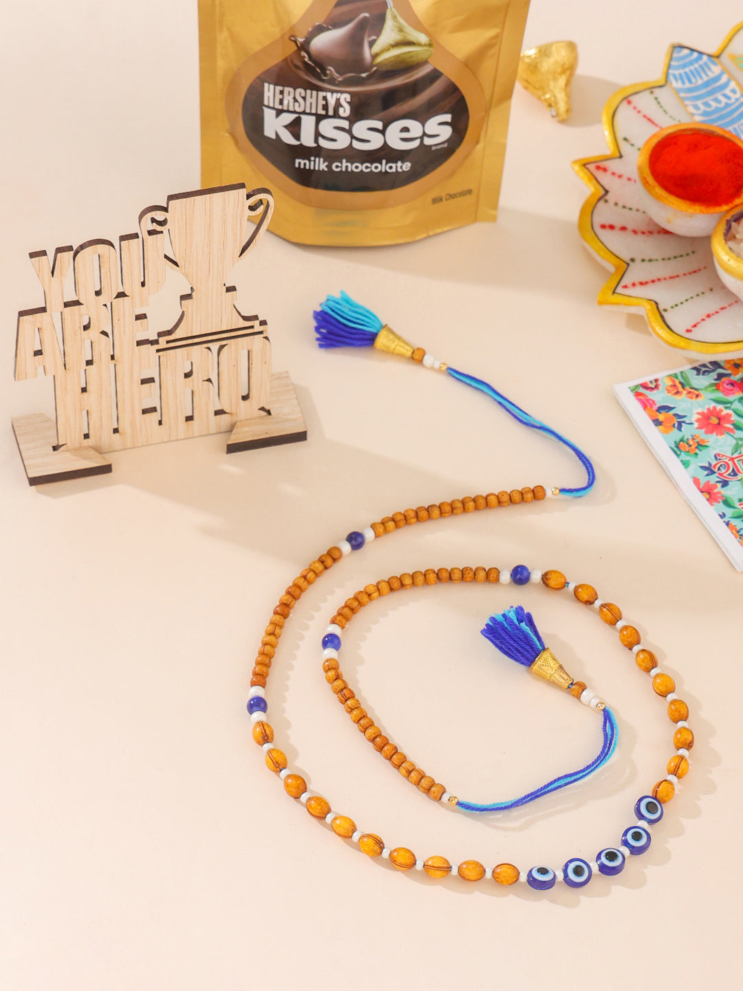 Style Note: Celebrate Raksha Bandhan With The Nvr Men Evil Eye Multicolor Thread Rakhi, Designed To Protect And Bless Your Bhaiya. Featuring The Powerful Evil Eye Symbol And Vibrant Multicolor Threads, This Rakhi Combines Tradition With A Stylish Modern Touch. The Adjustable Thread Ensures A Comfortable Fit For All Wrist Sizes. The Set Includes Roli, Chawal, Chandan, Mishri With Assorted Mdf Wooden Stand & 33.6 Gm Hershey'S Kisses Chocolate, Making It Perfect For Performing The Traditional Raksha Bandhan Rituals. A Meaningful Gift That Symbolizes Protection, Love, And Well-Wishes For Your Brother. Make This Raksha Bandhan Special With This Charming And Thoughtful Rakhi.