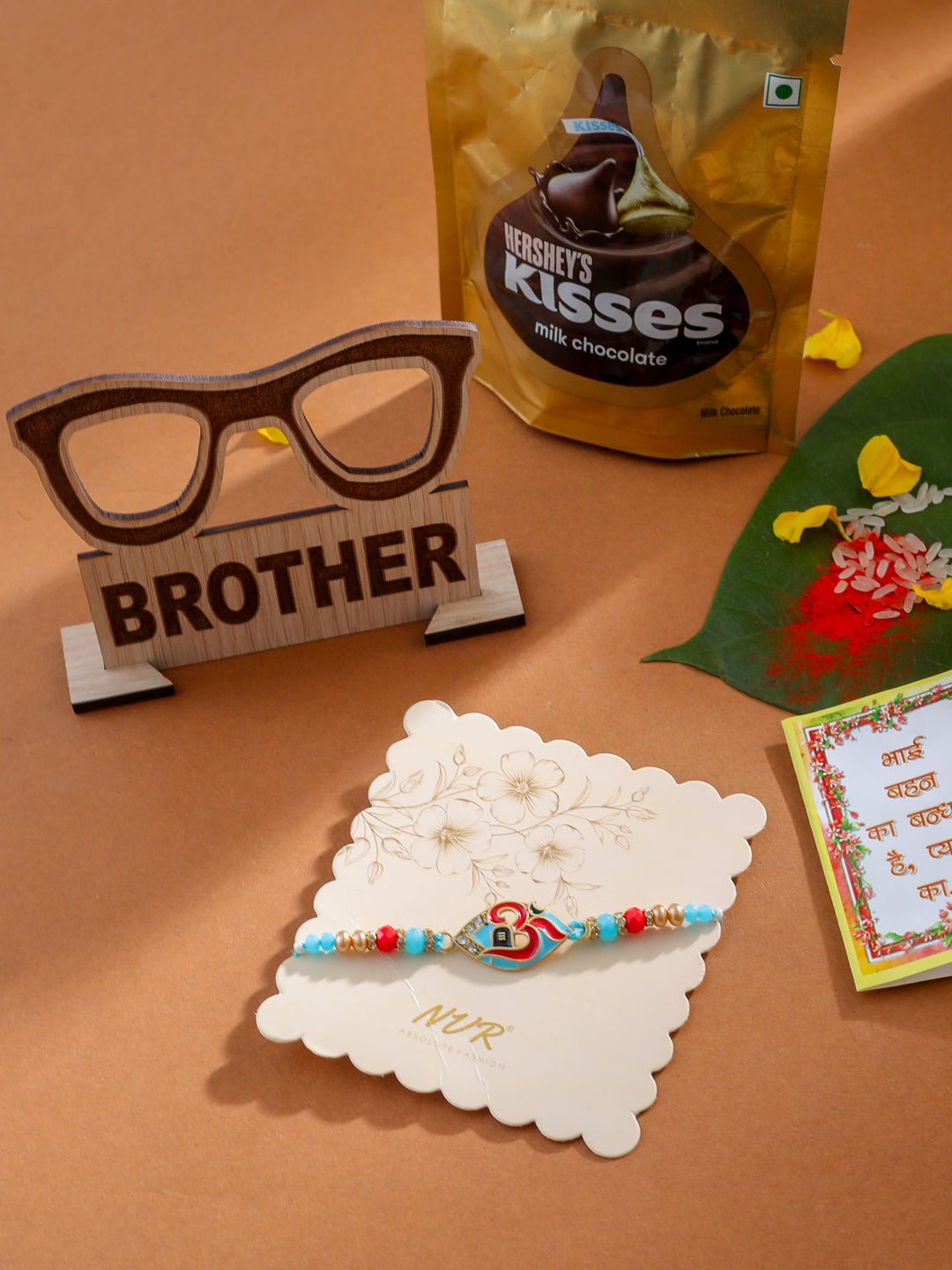 Style Note: Celebrate Raksha Bandhan With The Nvr Men Red & Blue Artificial Stones And Beads Om Thread Rakhi. Featuring A Beautiful Om Symbol, This Rakhi Is Adorned With Artificial Stones And Beads, Offering A Blend Of Tradition And Style. The Om Symbol Brings Blessings, Peace, And Positivity For Your Bhaiya. The Adjustable Thread Ensures A Comfortable Fit For All Wrist Sizes. Complete With Roli, Chawal, Chandan, Mishri With Assorted Mdf Wooden Stand & 33.6 Gm Hershey'S Kisses Chocolate, This Set Allows You To Perform The Traditional Raksha Bandhan Rituals. A Meaningful And Thoughtful Gift That Expresses Love, Protection, And Well-Wishes.