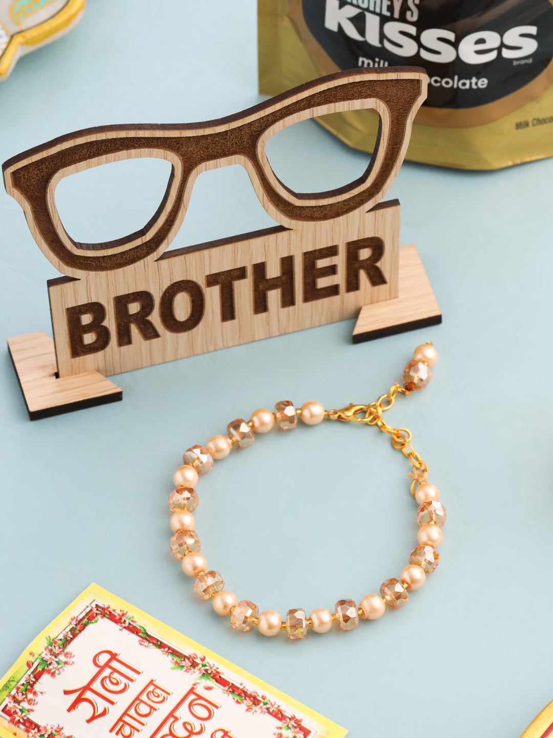 Style Note: Celebrate Raksha Bandhan With The Nvr Women Gold Toned Artificial Beads Wraparound Rakhi, A Blend Of Elegance And Tradition. The Gold-Toned Beads Create A Stunning, Timeless Design That Wraps Beautifully Around The Wrist. Comes With Roli, Chawal, Chandan, Mishri With Assorted Mdf Wooden Stand & 33.6 Gm Hershey'S Kisses Chocolate To Complete The Festive Ritual. A Perfect Gift To Show Your Love And Appreciation For Your Sister.
