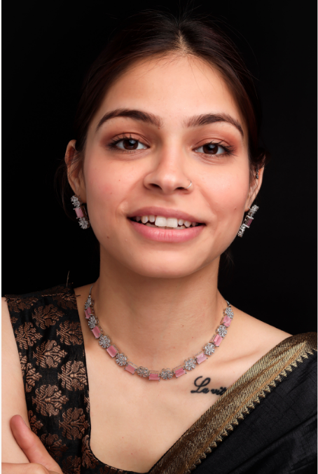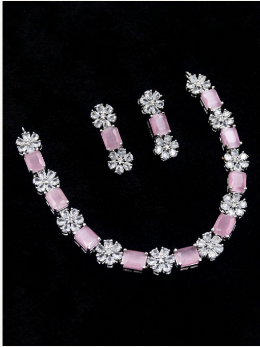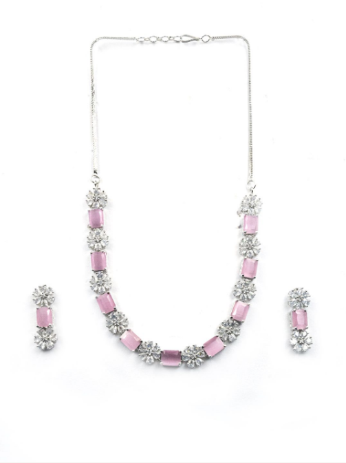 The centerpiece of the necklace is made with sparkling American Diamond/Cubic Zirconia that are arranged in a unique and modern pattern. The necklace is designed to sit comfortably on your neck, and it comes with matching stud earrings that perfectly complement the necklace.